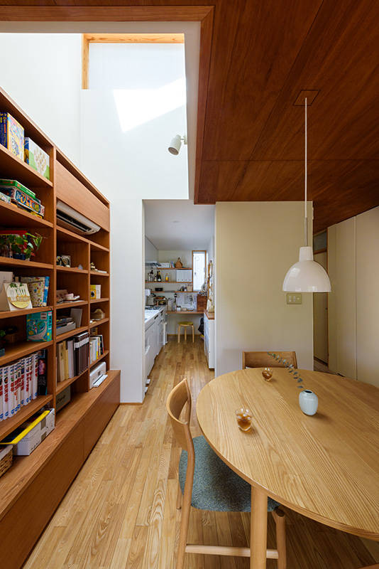1階は本棚・ベンチを造り付けたリビング、書斎コーナーを設けたキッチンがあります。