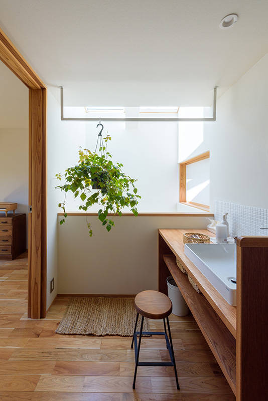 洗面コーナーは天窓からの光が降り注ぐ明るい空間で、観葉植物を育てるのにも最適です。