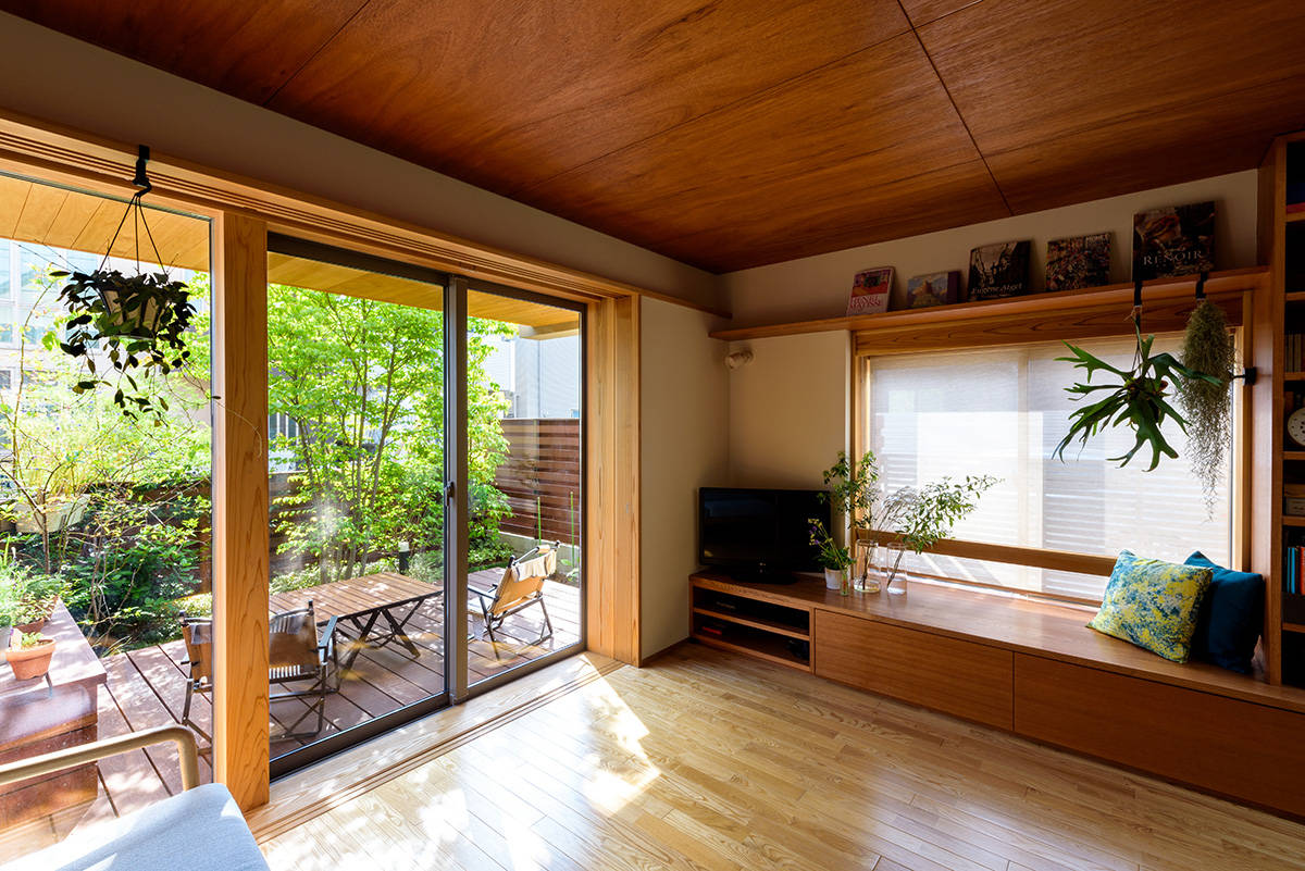 ヤマボウシを植えた庭にはリビングとつながるデッキとベンチを設け、気軽に外部空間を愉しめるようにしました。実際に食事やリモートワークなど庭でも多くの時間を過ごされているそうです。