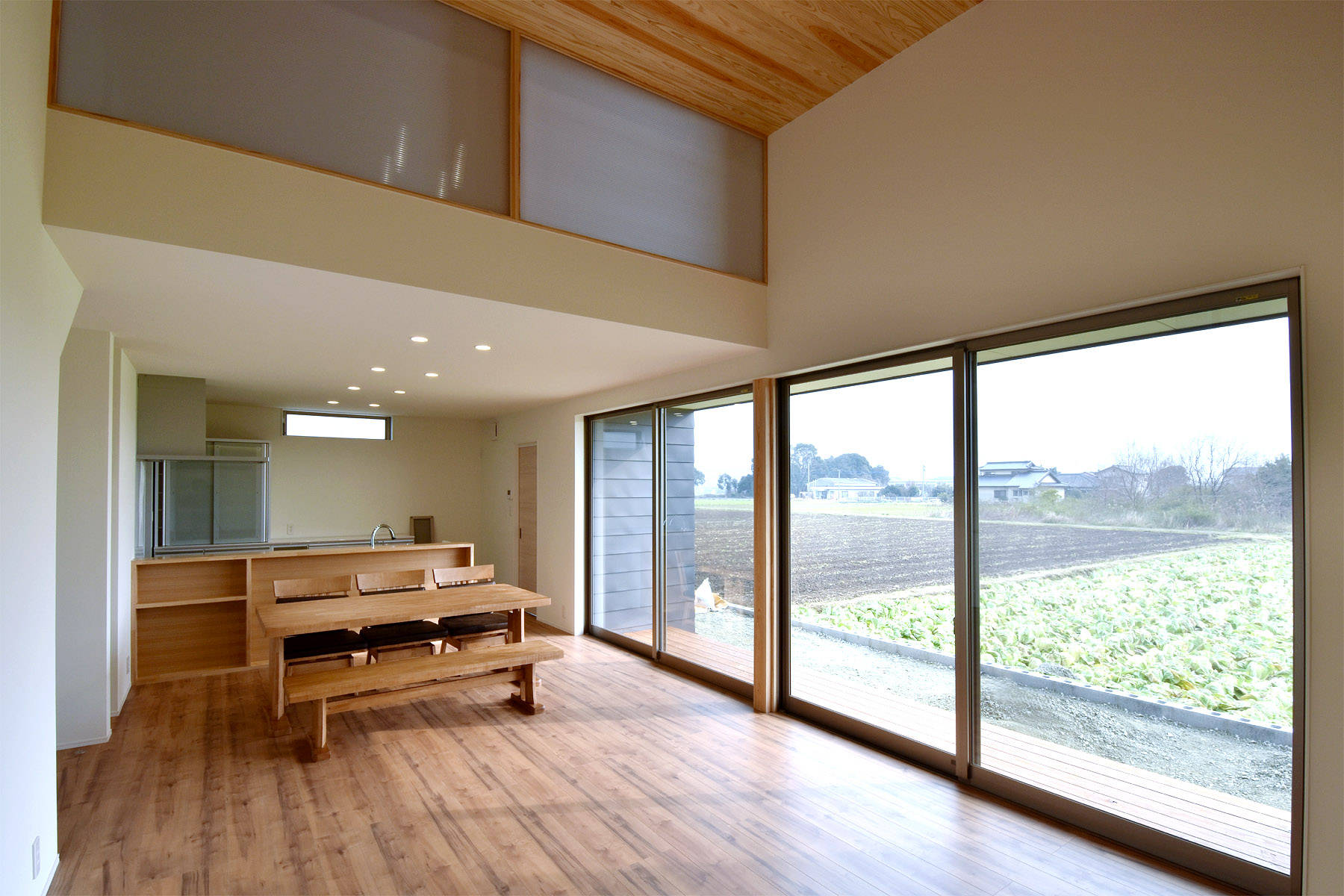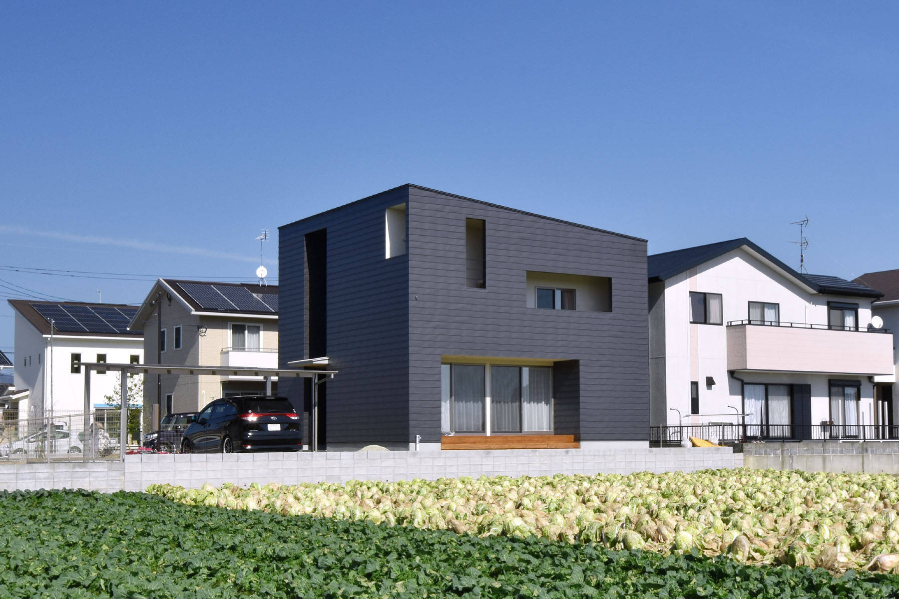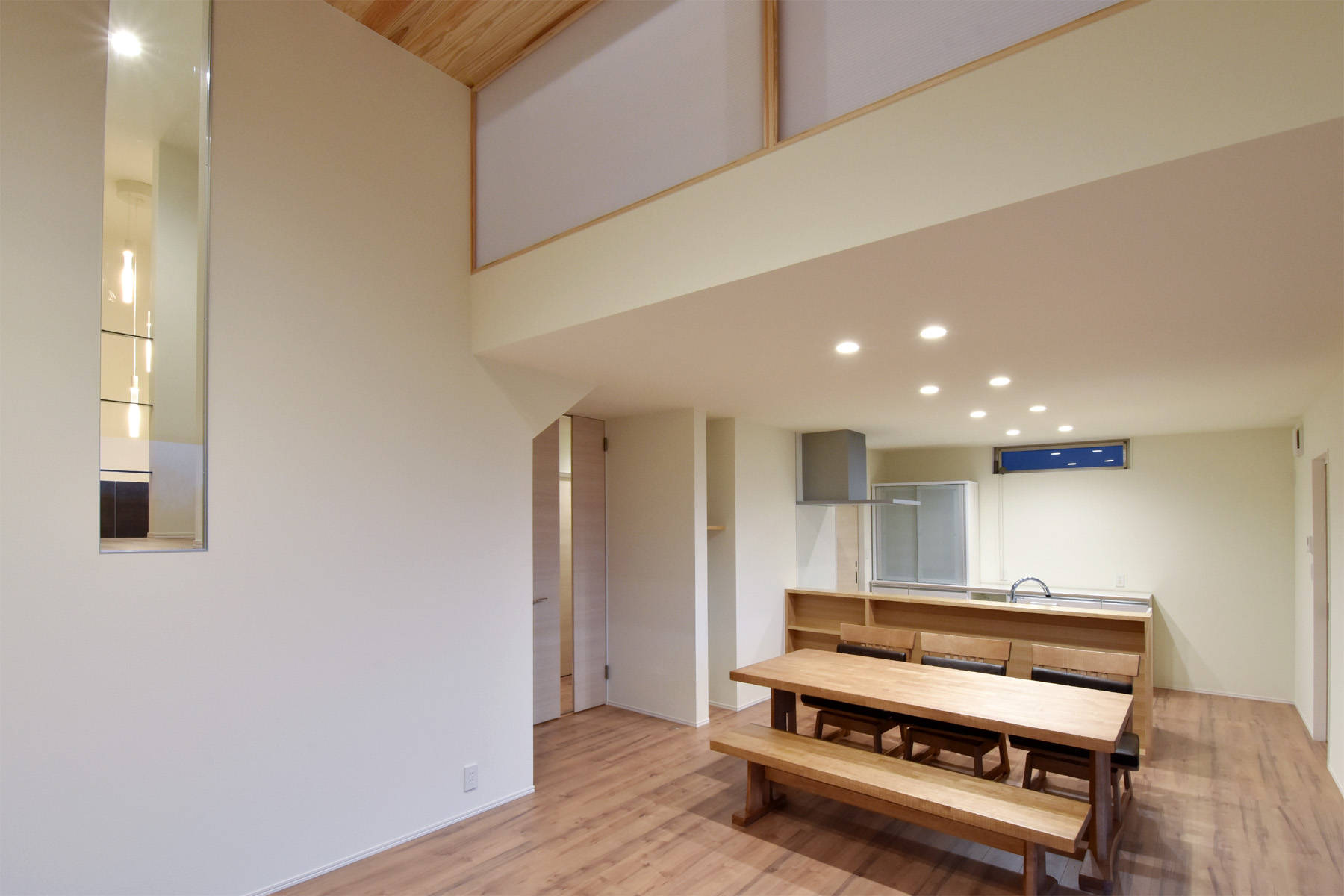 敷地は背振山麓の南に広がるのどかな田園地帯に位置しています。建物はシンプルな箱形で、外部をくり抜いて生まれる空間(ポーチ、テラス、バルコニー)をバッファゾーンとし内と外を緩やかに繋ぐ緩衝空間としました。このゾーンは夏の強い直射光を遮り建物内部の温度上昇を抑える役割も担います。内部はスキップフロアで構成され4つの床の高さが段階的に変化することで、どのフロアからも人の気配が感じ取れる風通しの良い明るい空間としています。家族が集うリビングダイニングは、スキップフロアによってできる段差を活かした吹き抜けとし、視界の開ける南側には大開口とテラスを設けて開放感溢れる空間としました。