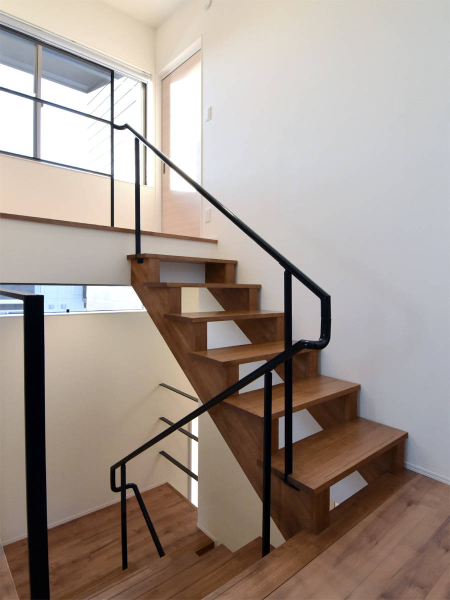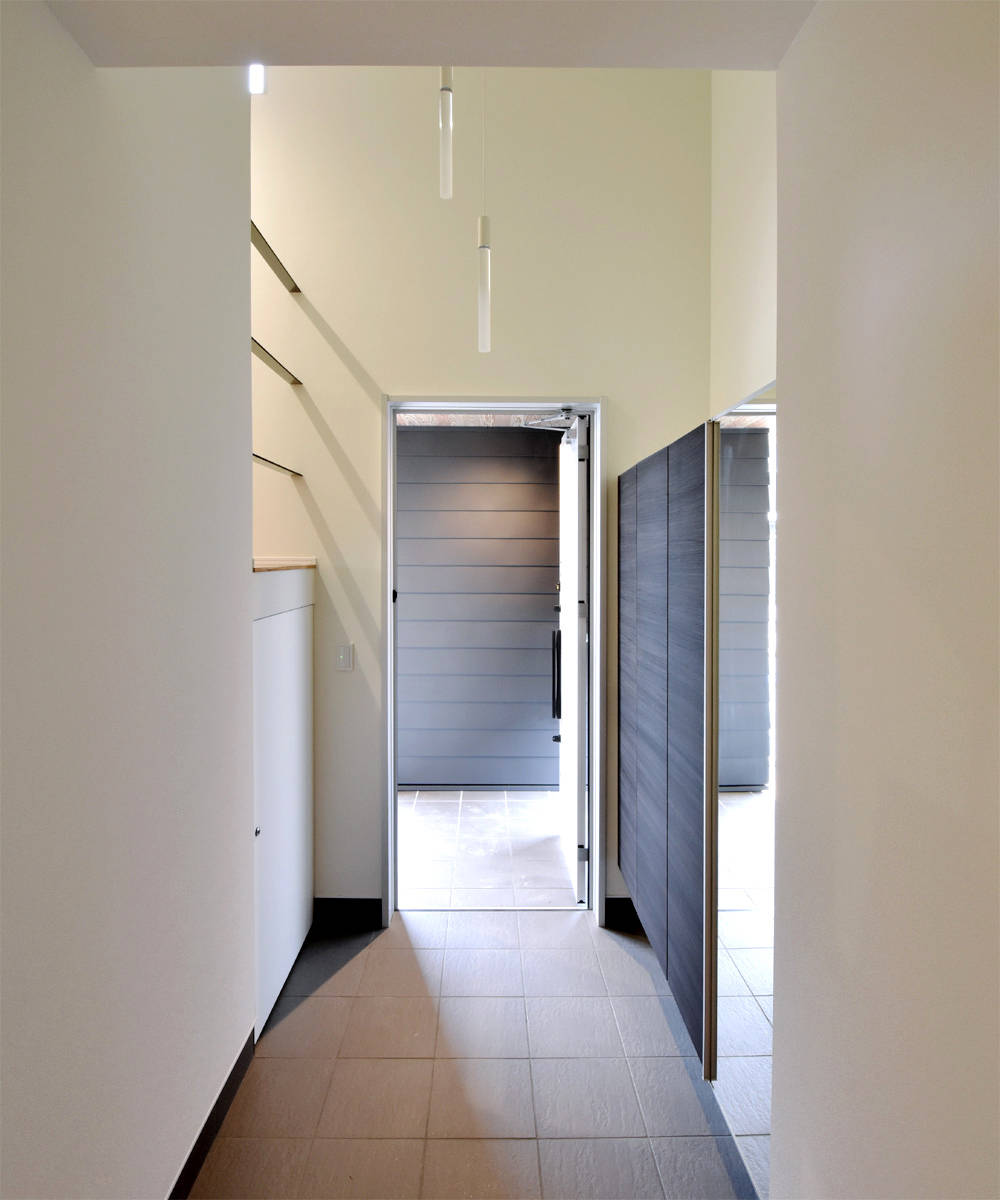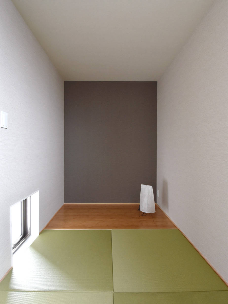敷地は背振山麓の南に広がるのどかな田園地帯に位置しています。建物はシンプルな箱形で、外部をくり抜いて生まれる空間(ポーチ、テラス、バルコニー)をバッファゾーンとし内と外を緩やかに繋ぐ緩衝空間としました。このゾーンは夏の強い直射光を遮り建物内部の温度上昇を抑える役割も担います。内部はスキップフロアで構成され4つの床の高さが段階的に変化することで、どのフロアからも人の気配が感じ取れる風通しの良い明るい空間としています。家族が集うリビングダイニングは、スキップフロアによってできる段差を活かした吹き抜けとし、視界の開ける南側には大開口とテラスを設けて開放感溢れる空間としました。