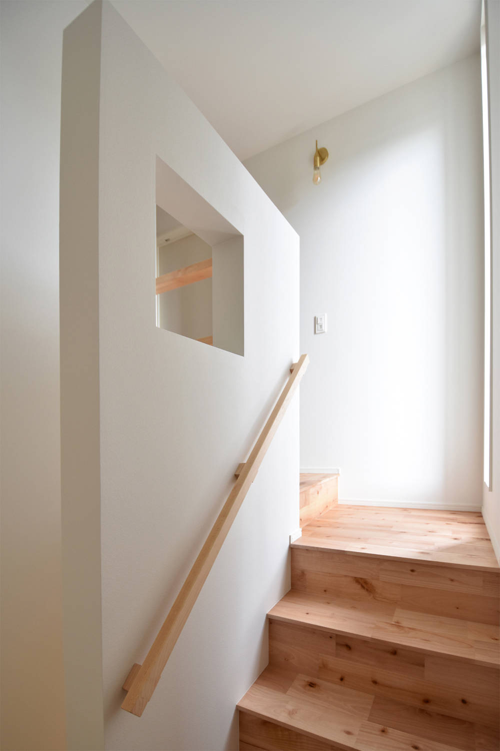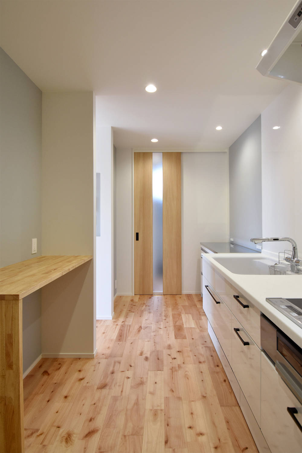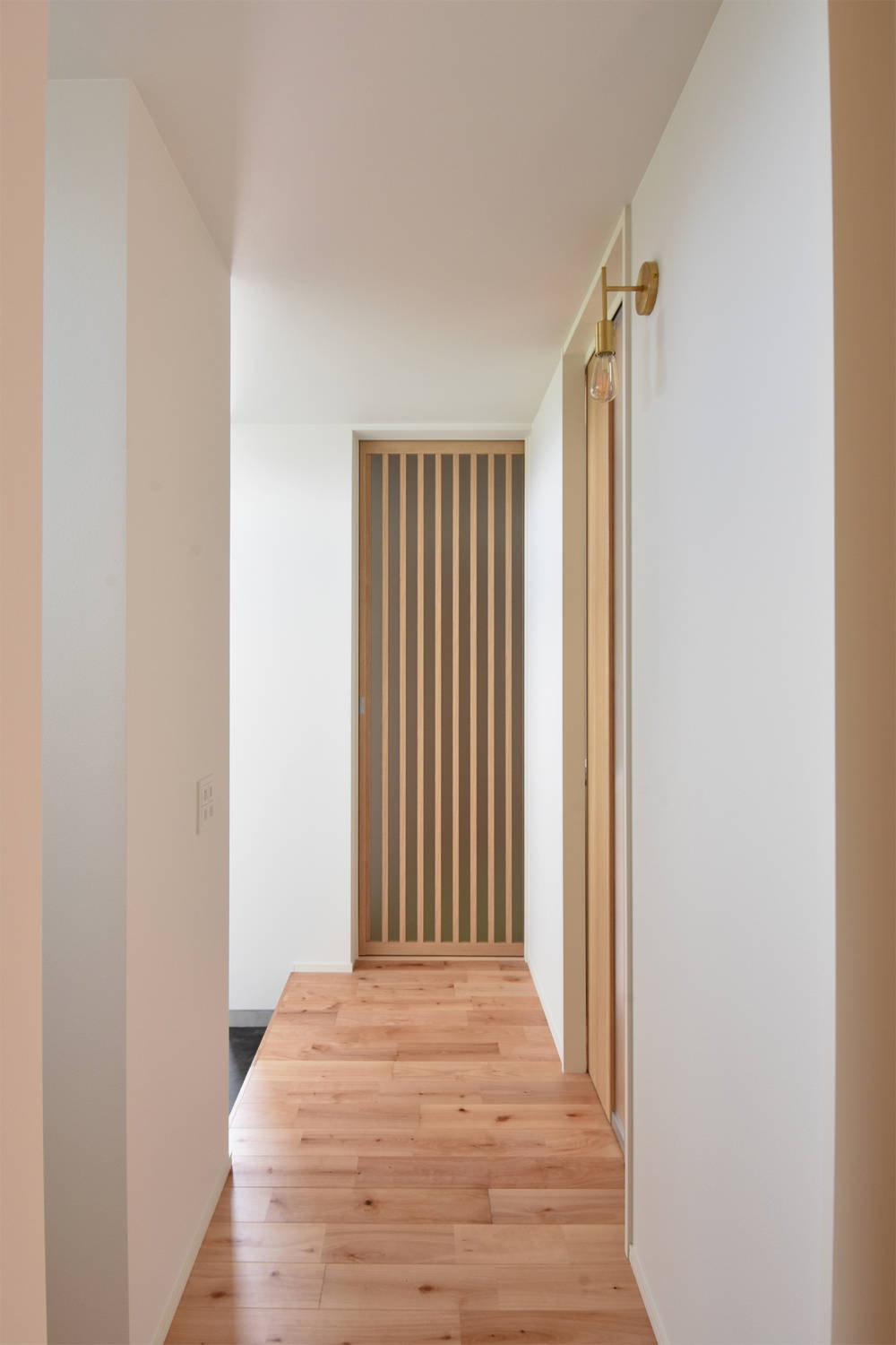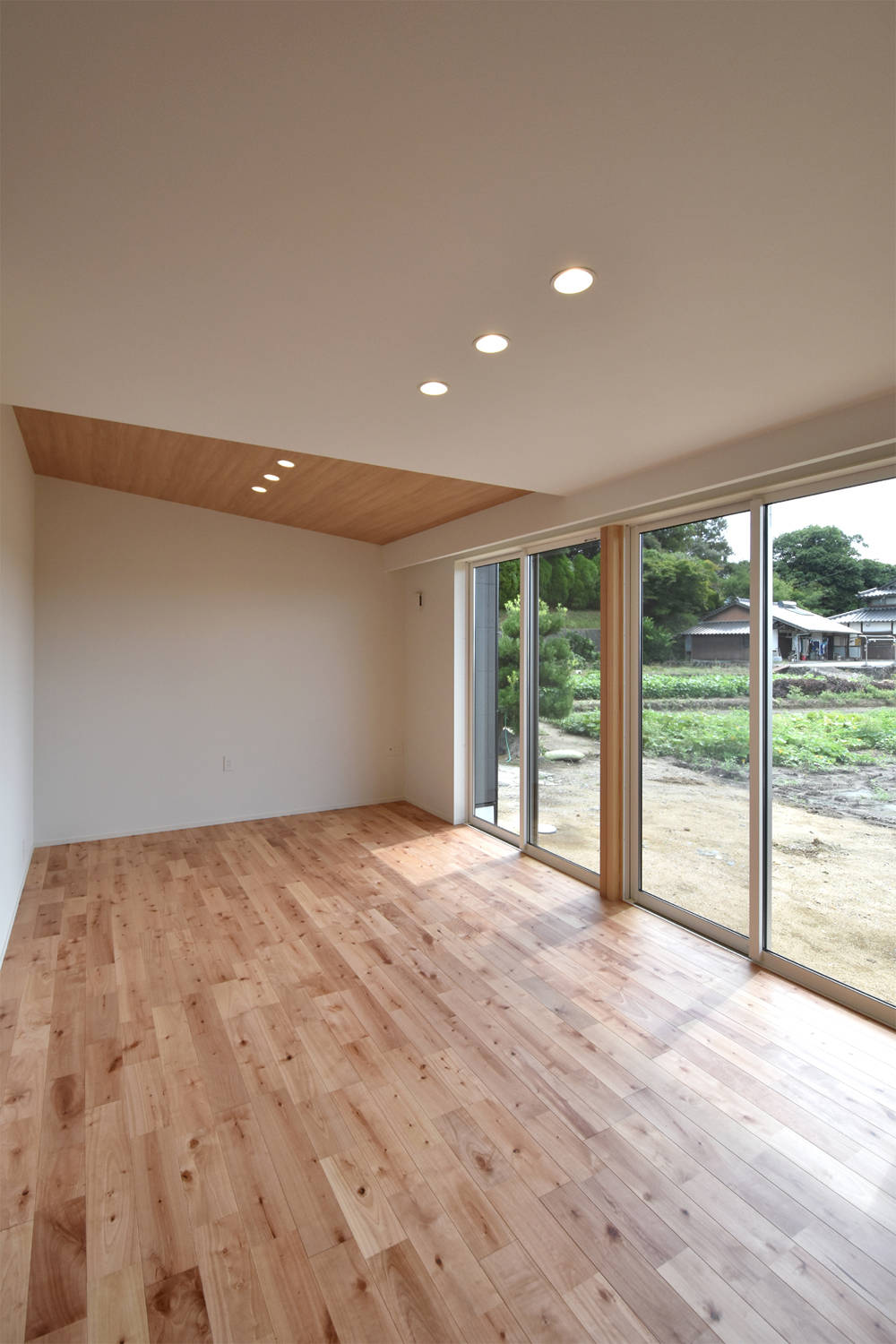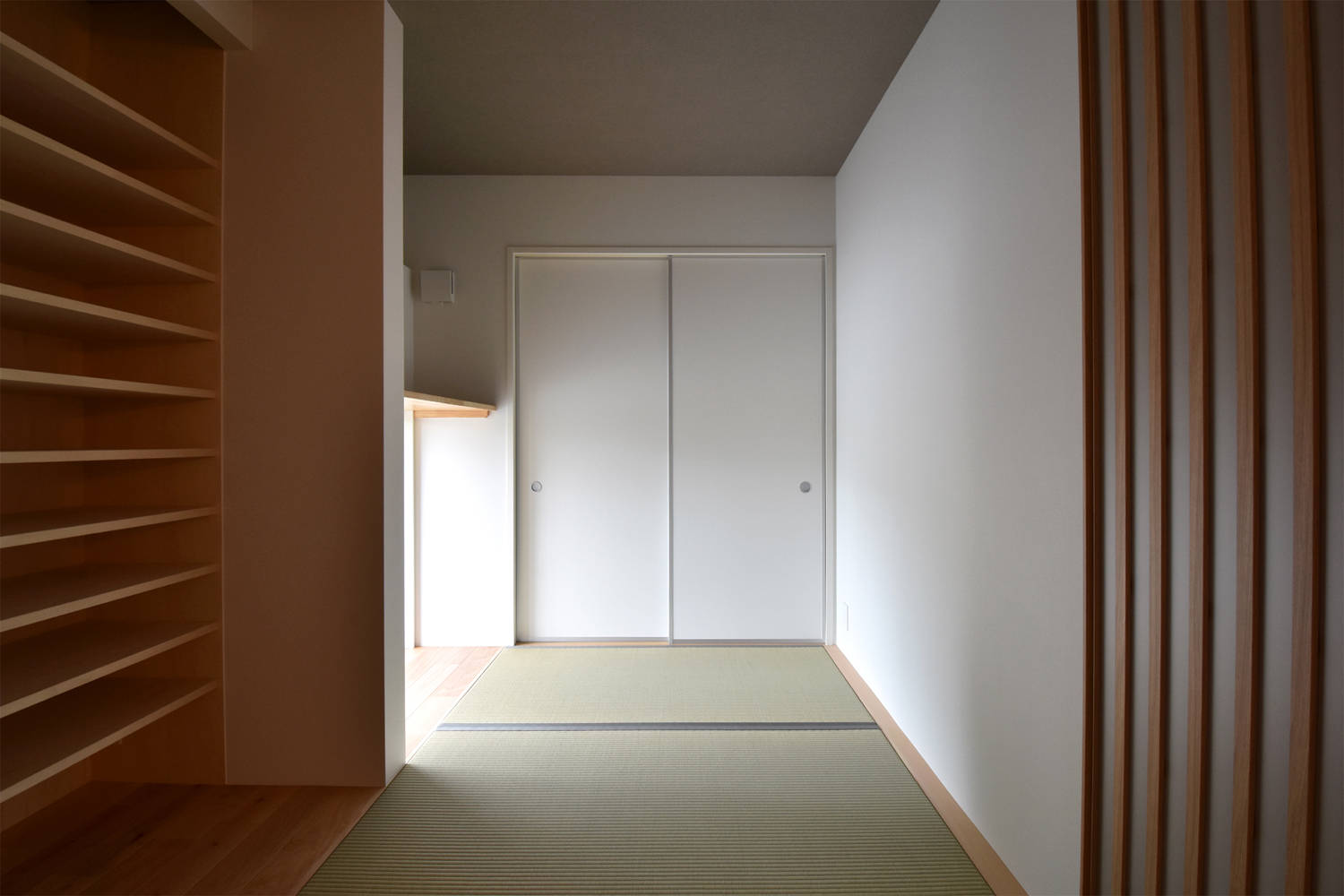 敷地は山と田園に囲まれたのどかな風景の中にあります。建物はそこに住まうご家族にとって必要最小限の広さを確保しつつコンパクトなつくりとし、内部はリビングダイニングを緑豊かな畑が望める東側にすることで、視線が抜け、朝の爽やかな光で満たされる空間としました。玄関脇には着付け教室にも使用する和室を配置してプライベート空間と区別し、着物等の色あせを防ぐため低い位置に開口部を設け、着物専用の収納棚を造作しています。また、玄関、キッチン、リビングダイニングは回遊できるようになっており、機能的な家事動線としています。クライアントは住まいに対し各所に具体的なイメージを持っておられたので、その一つ一つに寄り添う設計を心掛けました。