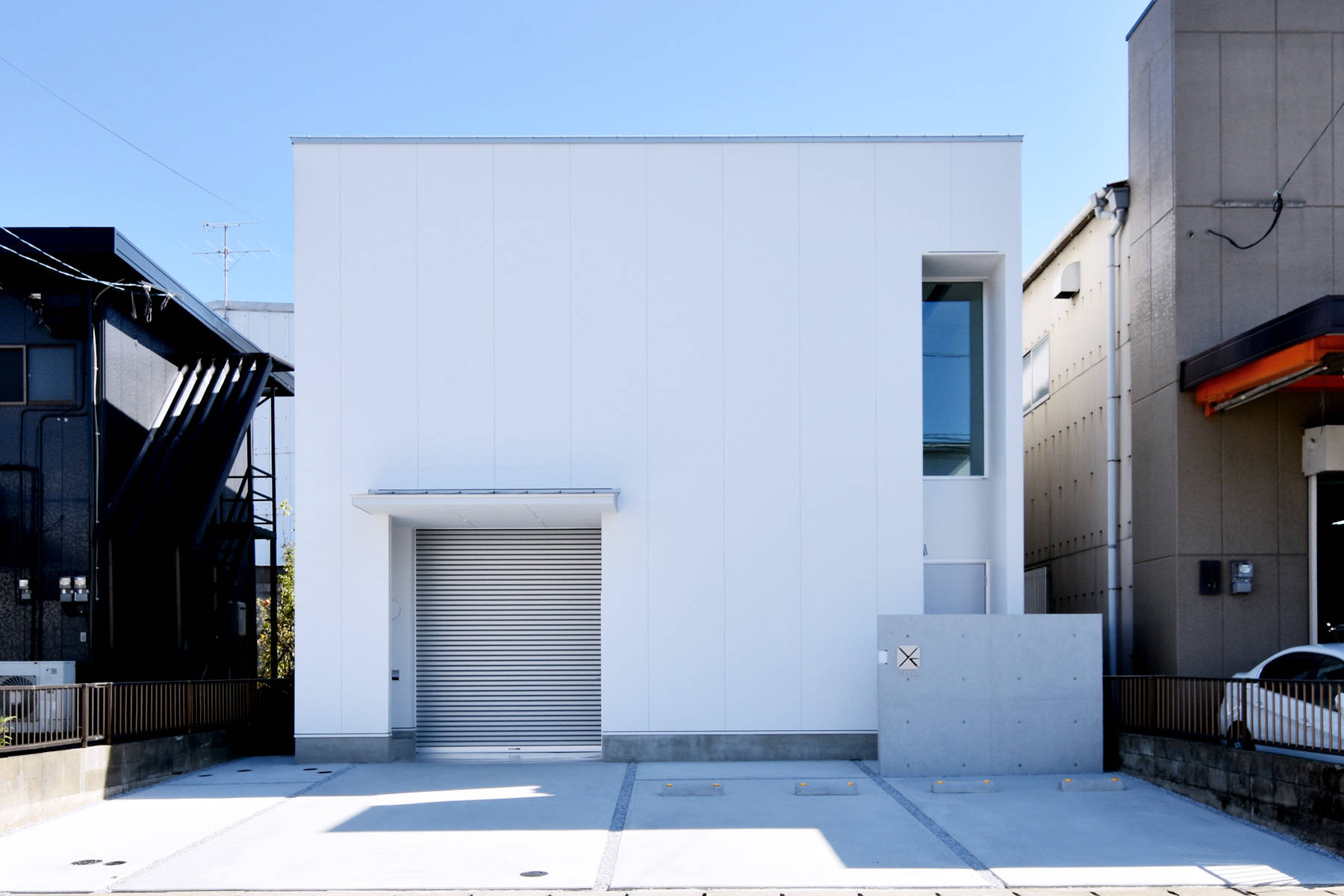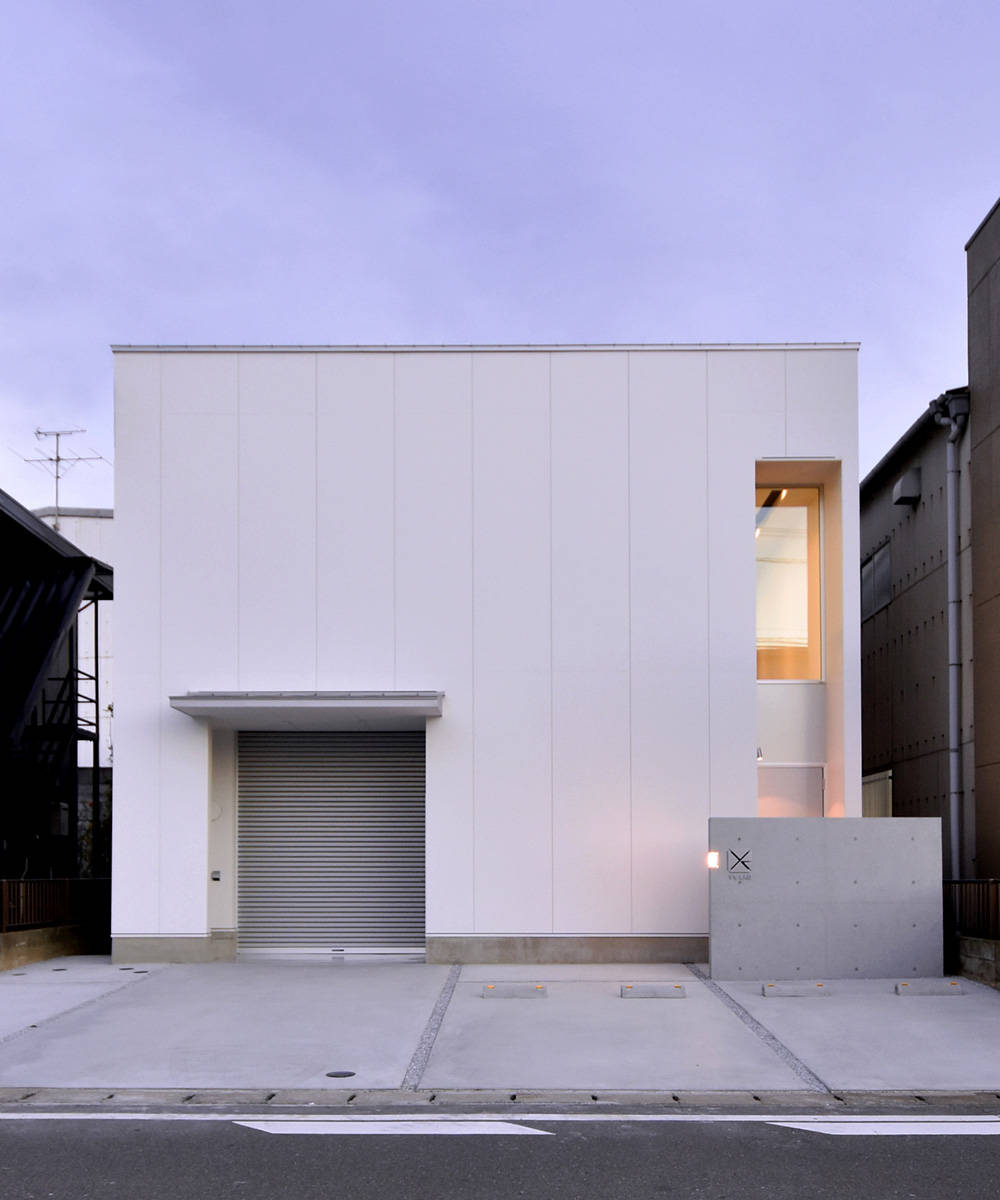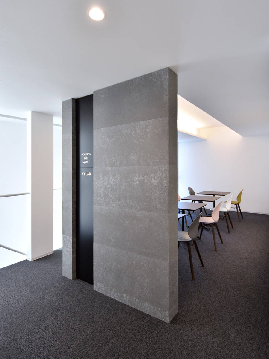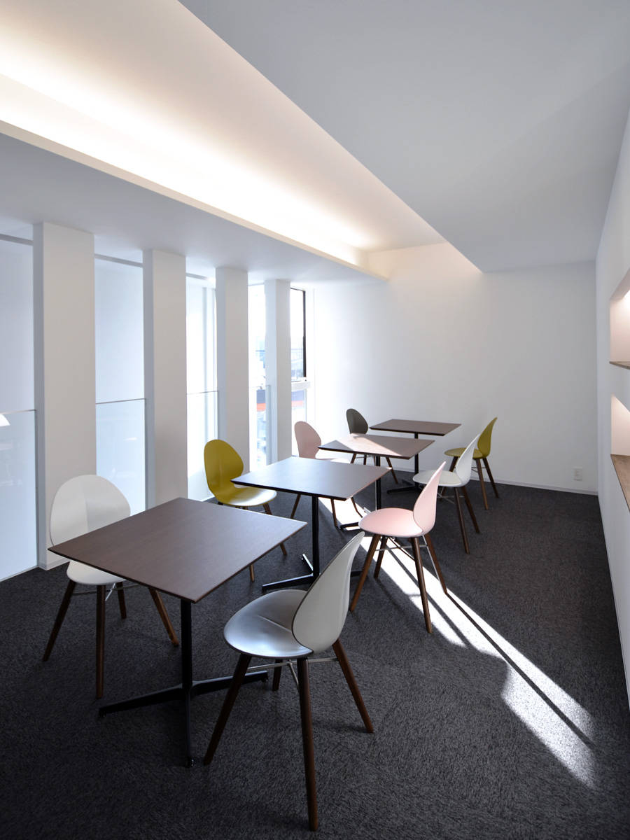 1階は機械修理を行うメカニカルな場、2階は結婚相談サービスを行う場という異なる業種がコラボする建物です。外観はシンプルな白い箱をイメージし、機械から連想しうる印象とは真逆のシンプルでモダンな雰囲気としました。道路に面する正面は開口部を少なくし、四角でくり抜いた部分にそれぞれの入口を設けています。2階のフリースペースは、階段側の壁をリズミカルにくり抜いてガラスの手摺り壁を設けることで開放的な空間としました。ここは打ち合わせやカウンセリングの場として機能します。応接室は壁の一部をテクスチャーのある塗り壁とし間接照明で柔らかく照らして落ち着いたシックな雰囲気を演出しています。