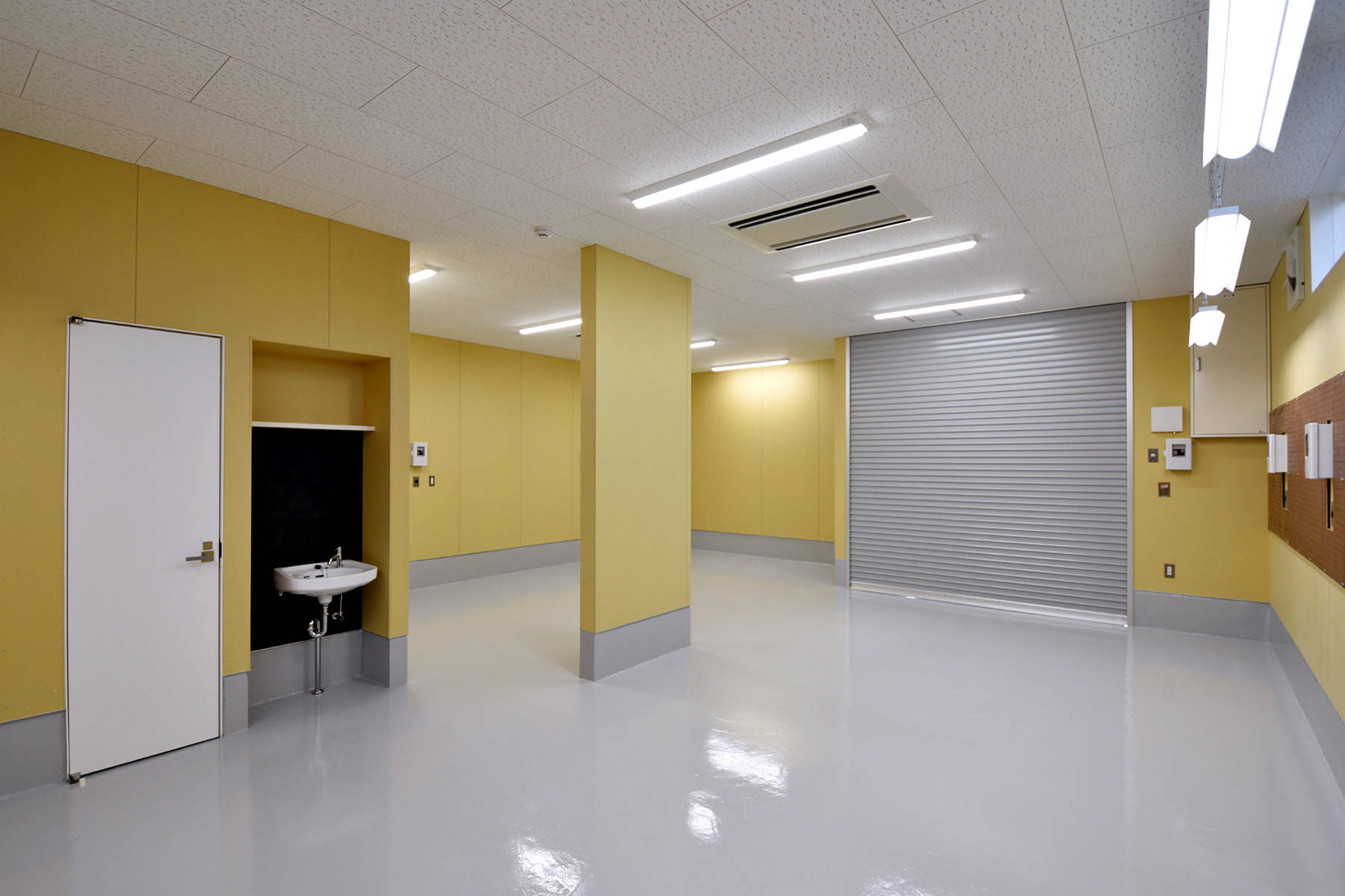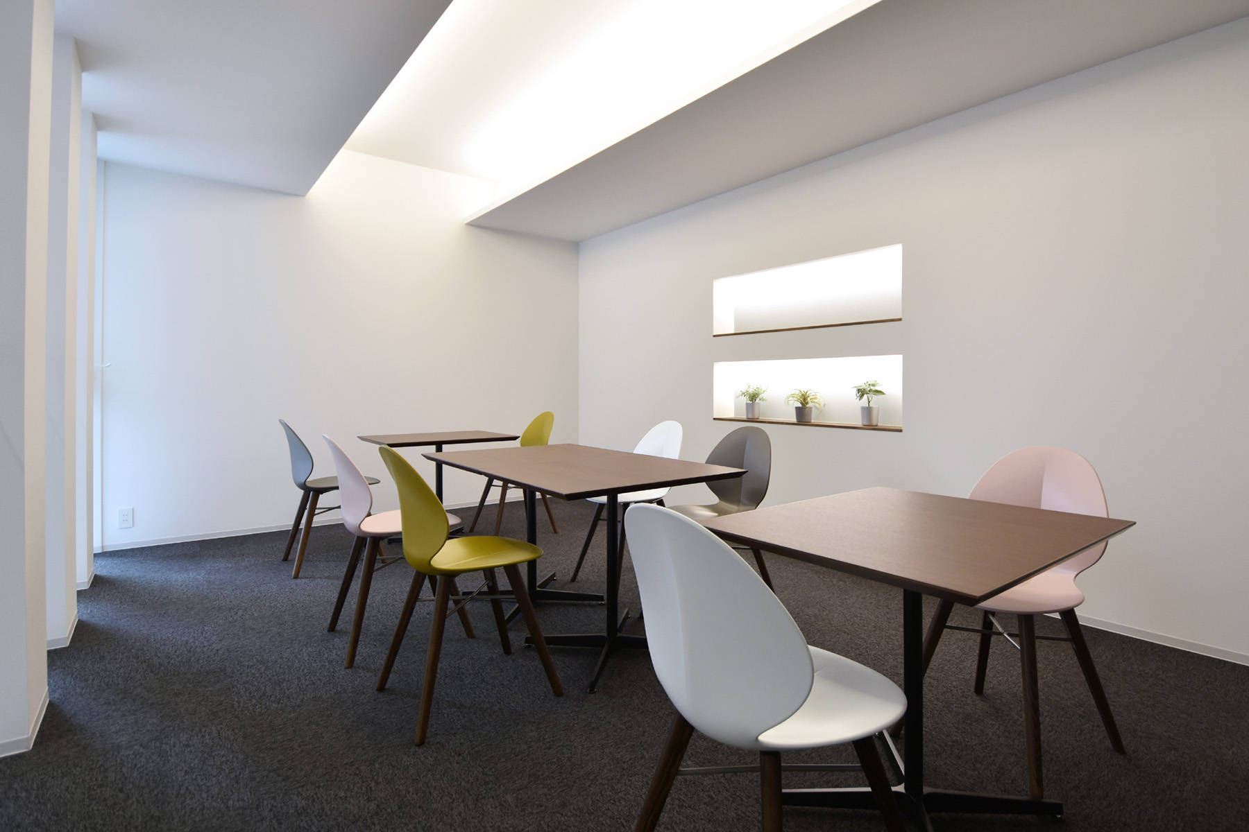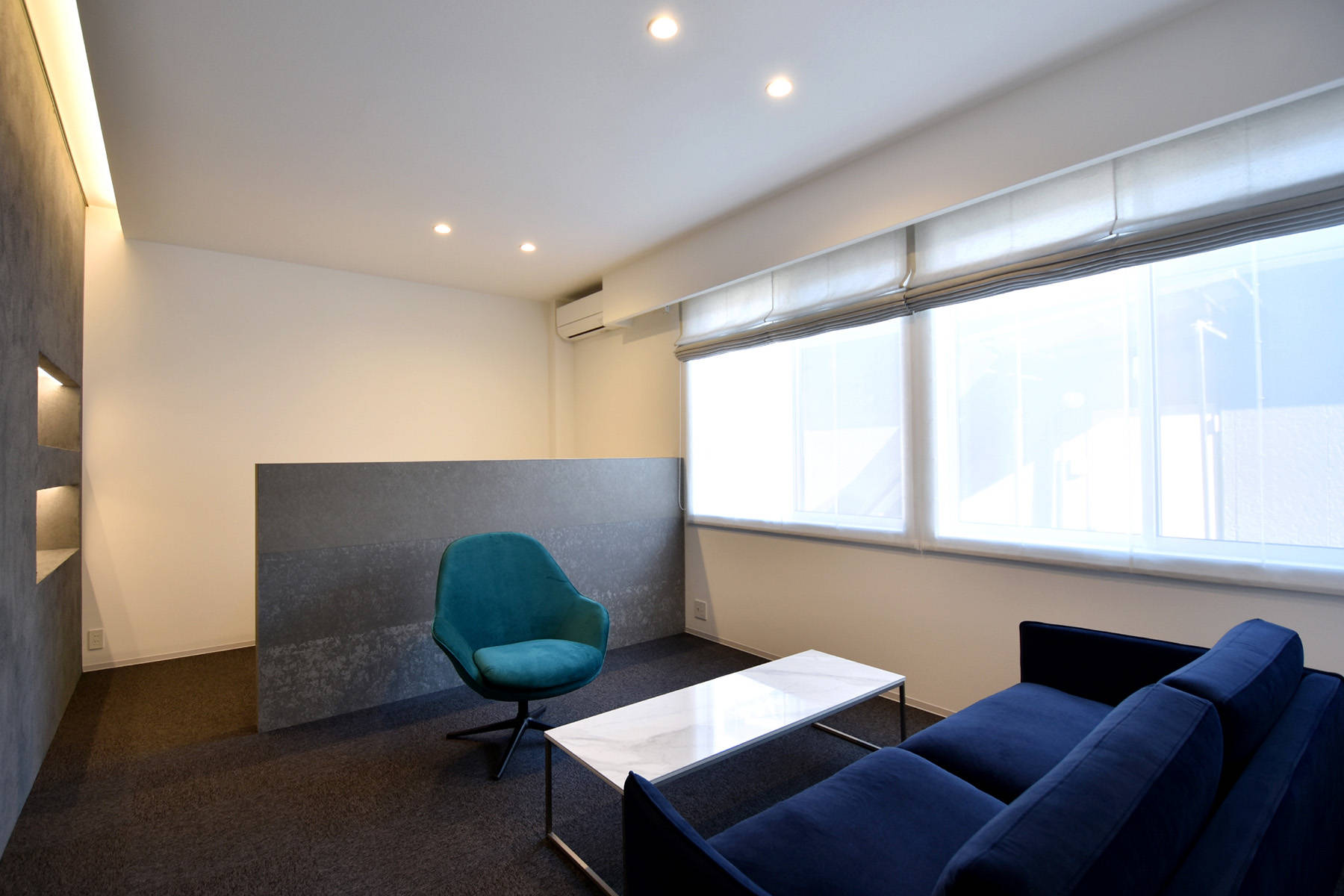 1階は機械修理を行うメカニカルな場、2階は結婚相談サービスを行う場という異なる業種がコラボする建物です。外観はシンプルな白い箱をイメージし、機械から連想しうる印象とは真逆のシンプルでモダンな雰囲気としました。道路に面する正面は開口部を少なくし、四角でくり抜いた部分にそれぞれの入口を設けています。2階のフリースペースは、階段側の壁をリズミカルにくり抜いてガラスの手摺り壁を設けることで開放的な空間としました。ここは打ち合わせやカウンセリングの場として機能します。応接室は壁の一部をテクスチャーのある塗り壁とし間接照明で柔らかく照らして落ち着いたシックな雰囲気を演出しています。