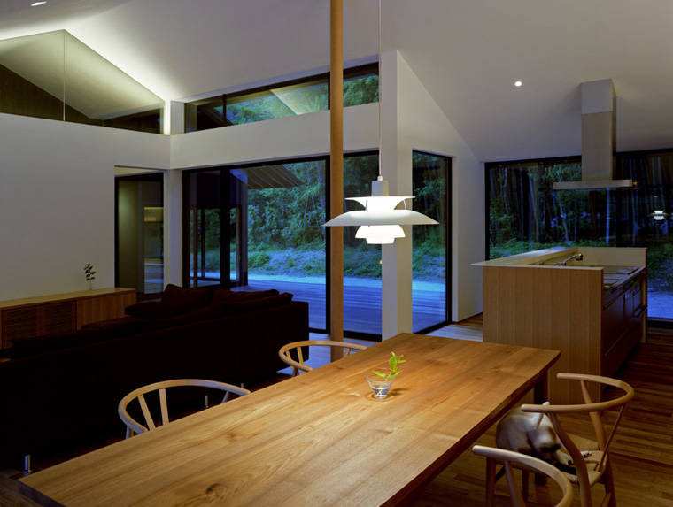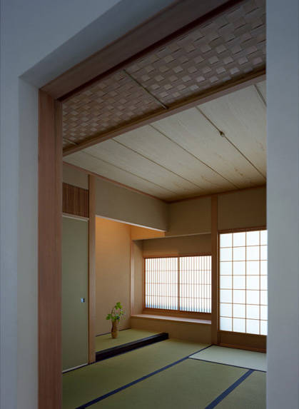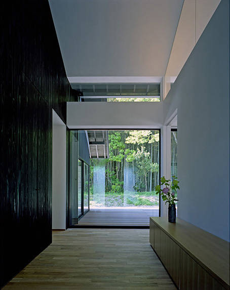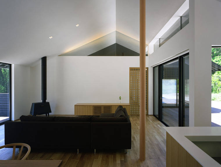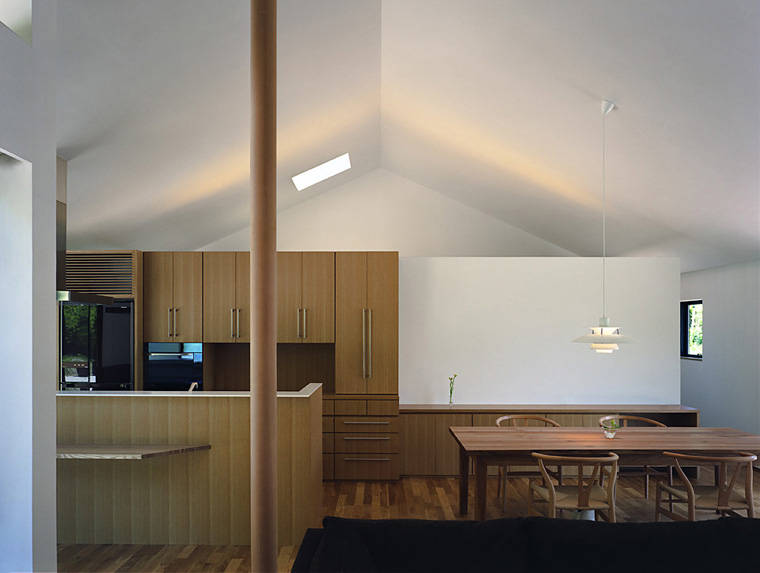 主要な壁・天井仕上げは漆喰塗仕上げとしている。白い柔らかな質感にくるまれた内部空間は、季節の変化に富んだ外部環境とは要素の単一さにおいて対照的である。しかし、刻々と移り変わる光や緑を取り入れ映し、豊かに歴史と自然を感じる住まいとなっている。