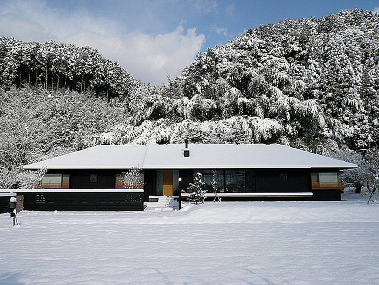 墨色に染めた杉板外壁に、寄棟大屋根を乗せた外観は、伝統的な屋根形状、外壁仕上げ、各ディテール等を参照し景観との調和を図りながらも、新鮮な魅力をもったものでありたいと考えた。軒先、各部分のプロポーション等には細心の注意を払い、深い森の緑を背景に、かつての秋月藩士のごとく凛として佇むよう願った。