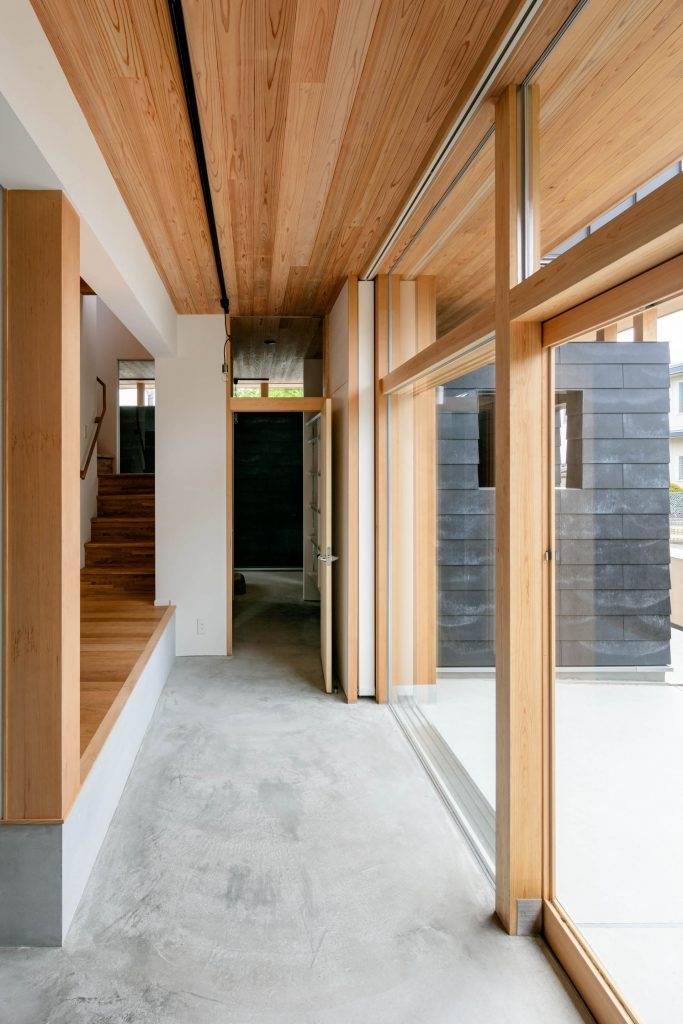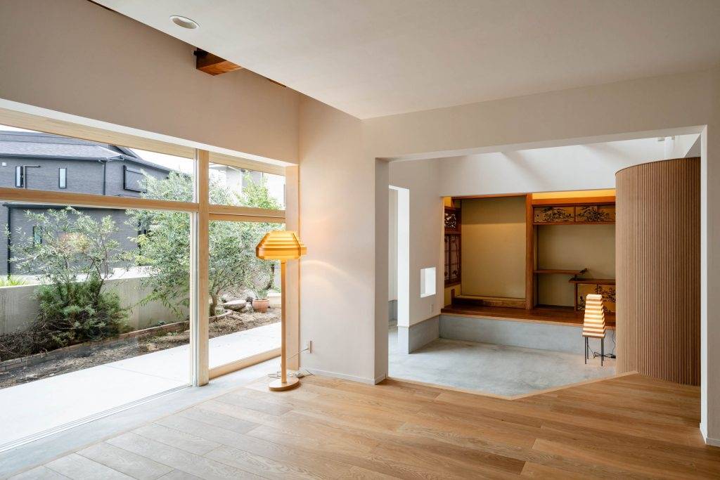 こうする事で日光が差し込まなかったリビングの奥まで採光が行き届き、土間空間に設けた大きい木製サッシからも日光を取り込むと共に、リビングが庭へと連続した開放的な印象をもたらす事が出来た。