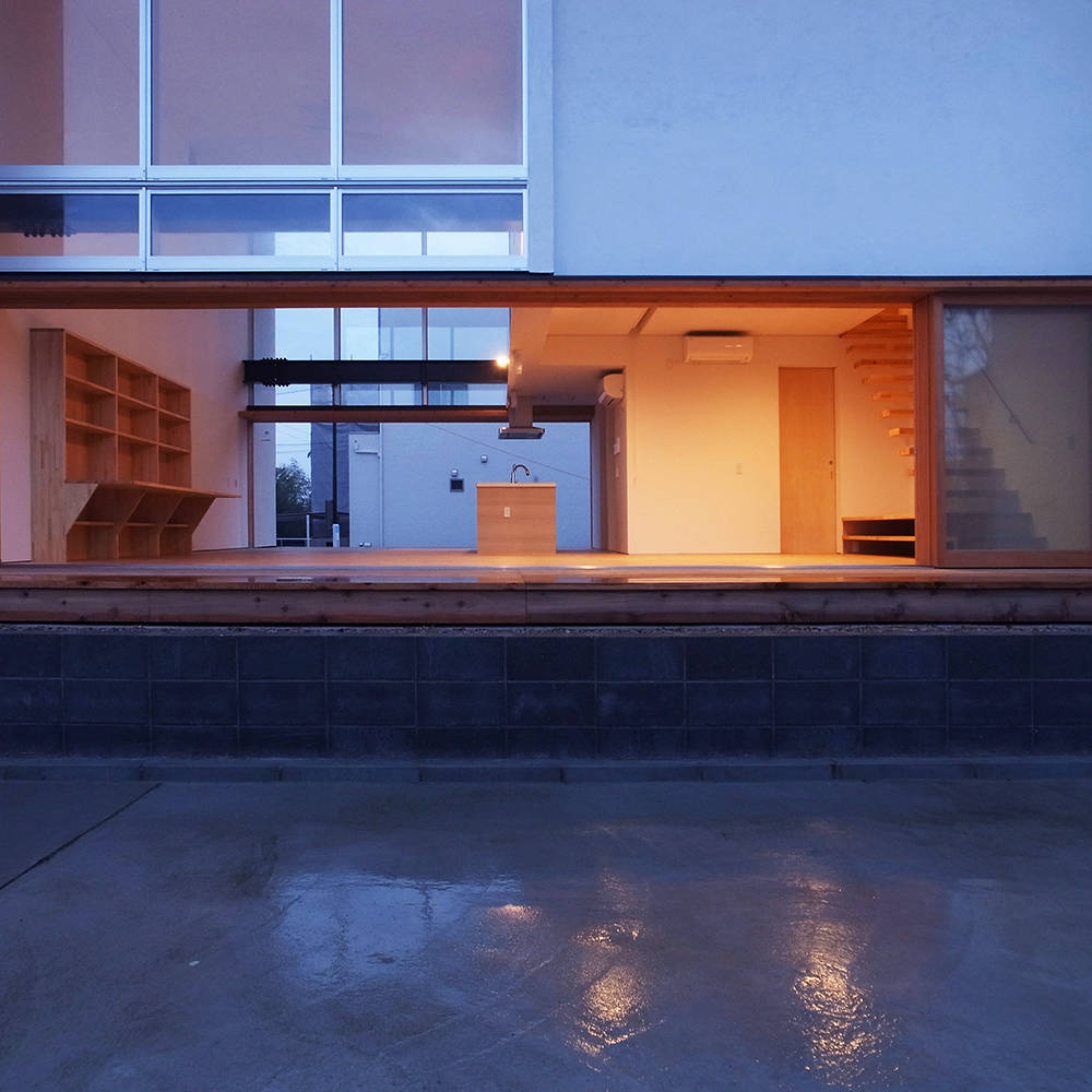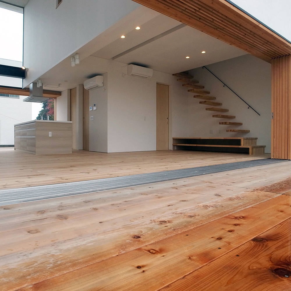 大開口は約9mと大きく、木製ガラス扉を開閉する事で内と外とが一体化し、空気感や気配が感じられ夏でもエアコンはいらない、サスティナブルな家づくりです。