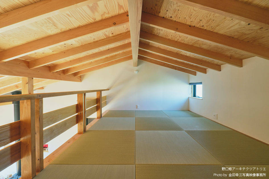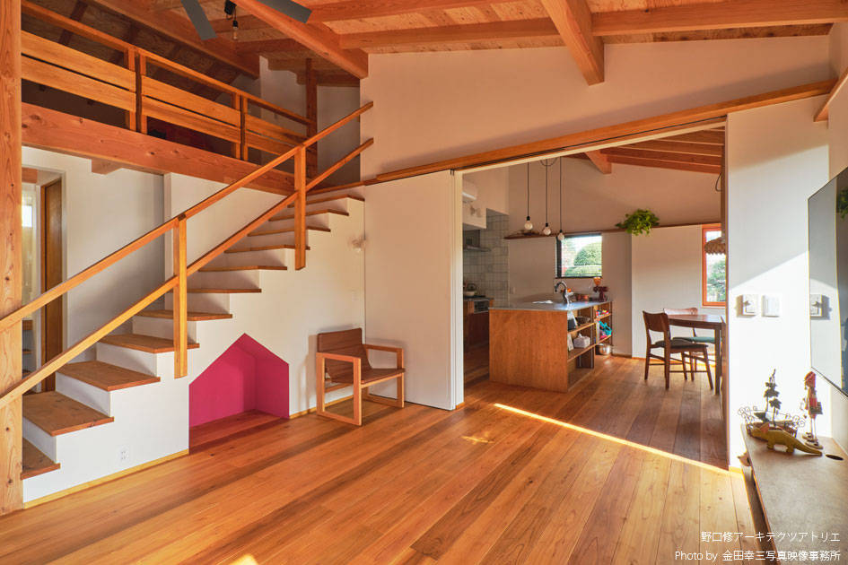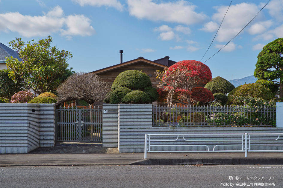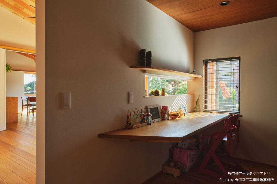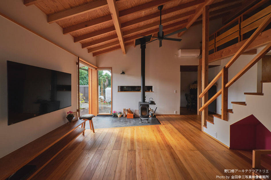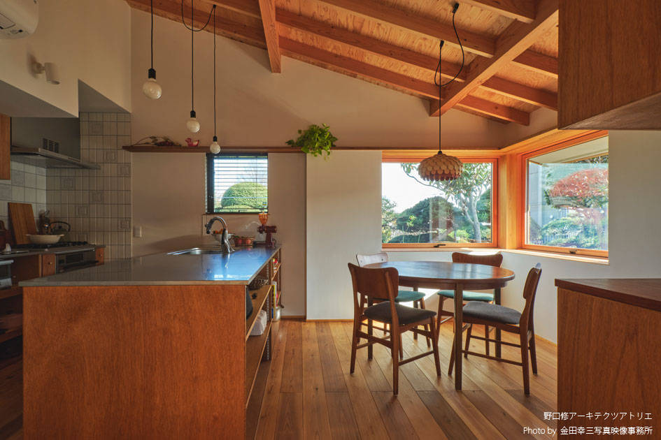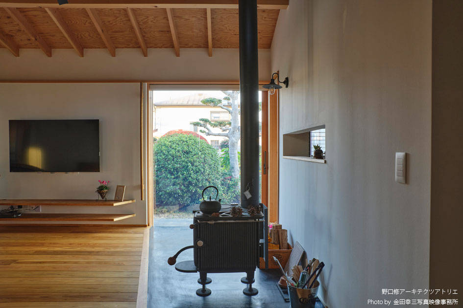 お爺さまのお住まいが建っていた敷地での建て替えになります。お爺さまがつくった庭を活かし「山小屋のような家」を建てたいという建主のリクエストに応えるべく設計を開始しました。「子どもとの食事の時間を大事にしたい」と、ダイニングについては、かなりのこだわりがあり、大事な食事の時間の密度を高めるべく出来る限り小さなスペースにして親子の物理的な距離感を縮めながらお爺さまの庭に向けた大きな窓を設け百日紅の木をのぞめるようにして光と風を採り込みつつ開放感をつくり “ 狭いのに広い ” という良い矛盾のある空間になっています。屋根の構造をあらわすことで山小屋の雰囲気になると同時に「この上に床が無い」ことを無意識に感じて、軽快な気持ちになるようにしました。性能面でも低炭素建築物の認定を受けていると同時に薪ストーブも設置し、小さなエネルギーで快適に過ごすことができるようになっています。あたらしいのに懐かしい感じの平屋になりました。