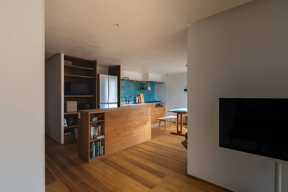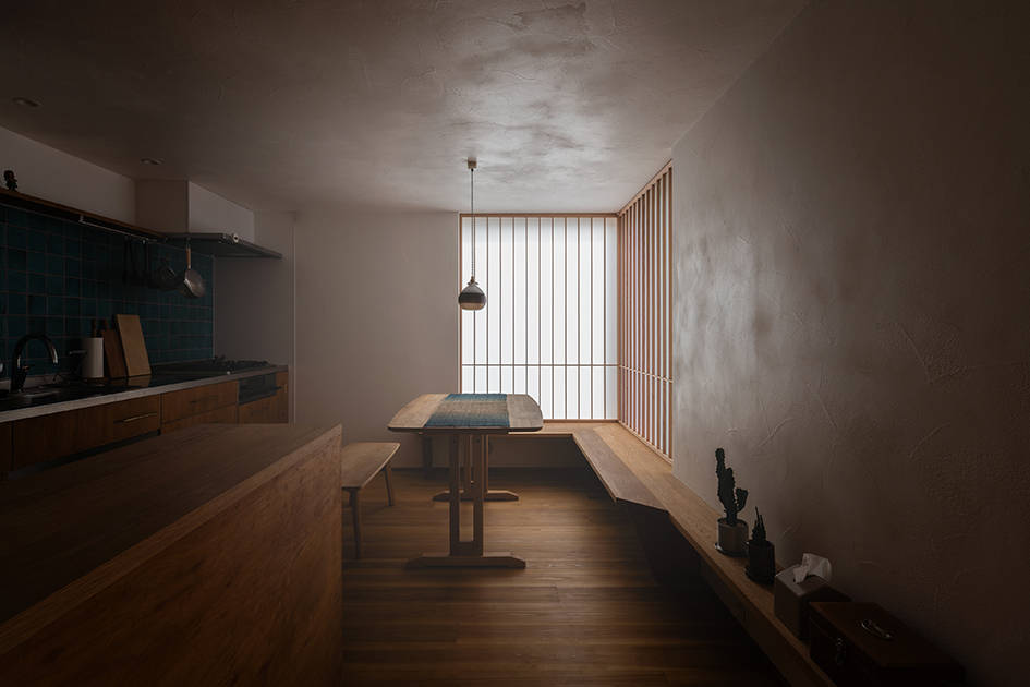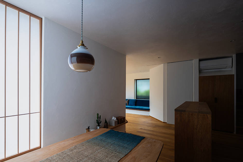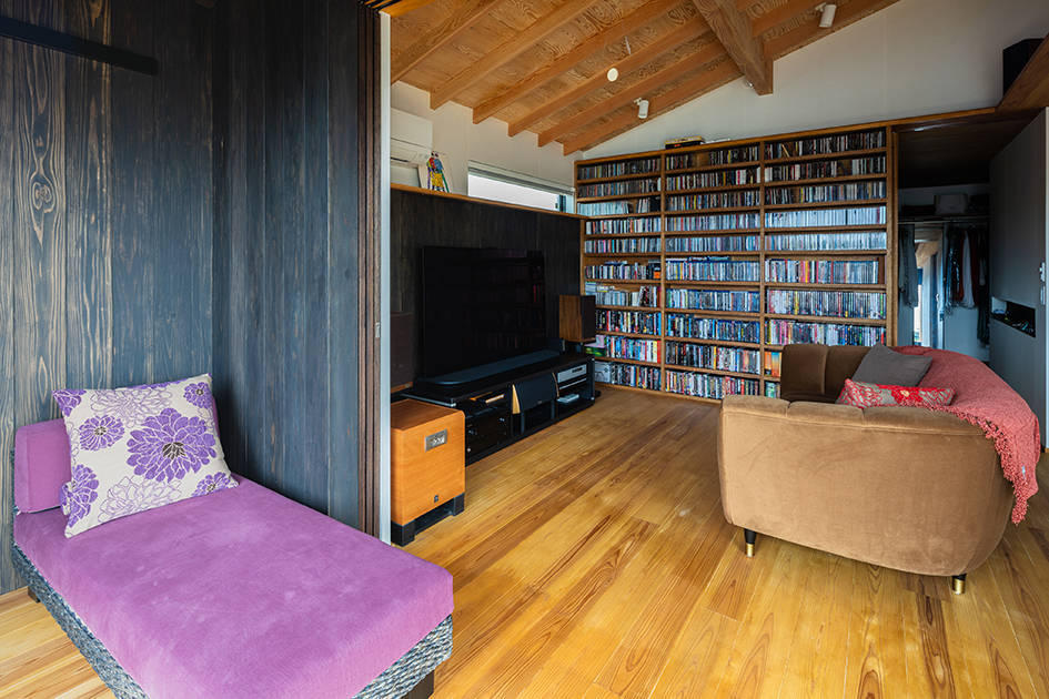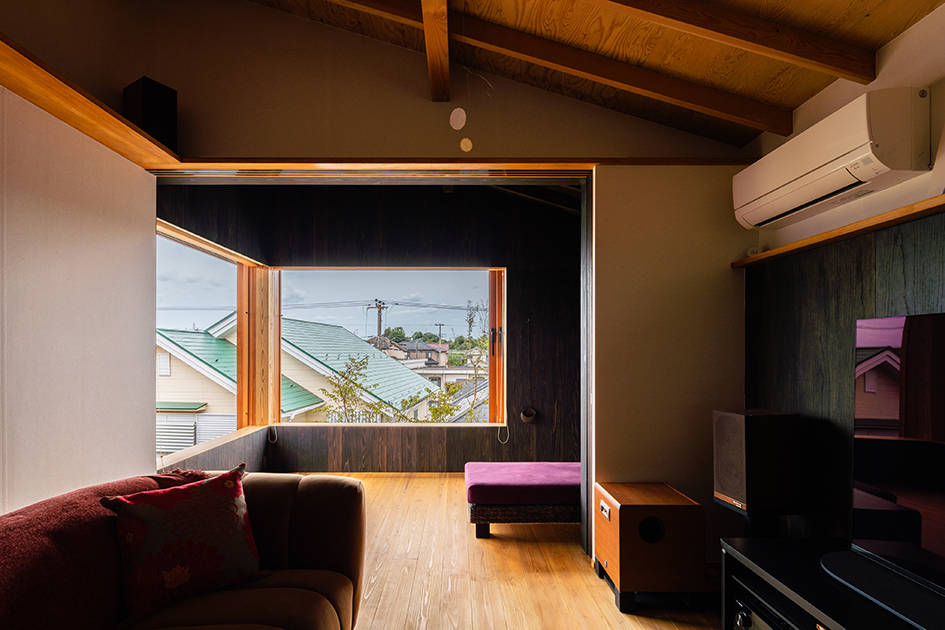 古い住宅地の中の敷地を見つけてこの家の計画が始まりました。10年前から私たちとの家づくりを考えていたというグラフィックデザインのお仕事をしている建主ご夫妻。家への要望は、広いこと、趣味である音楽鑑賞と映画鑑賞の部屋を2階につくること、外のような空間をつくること。というものでした。家のサイズは、いくつかプランを検討しながら広さを確保しつつ、広すぎないサイズで決定しました。リビングとダイニングは斜めに緩やかにつがるようにしました。どちらの場所からも大きな窓を介して庭をのぞめるようになっています。2階は、暮らしと趣味、くつろぎの時間がシームレスで繋がるように趣味の部屋、寝室、インナーテラスが一体の空間になり、まさに “ 趣味と暮らす ” を実現しています。インナーテラスは木製サッシをフルオープンにすることで、内(なか)なのに外のような空間になります。暮らしの楽しみが詰まった家になりました。