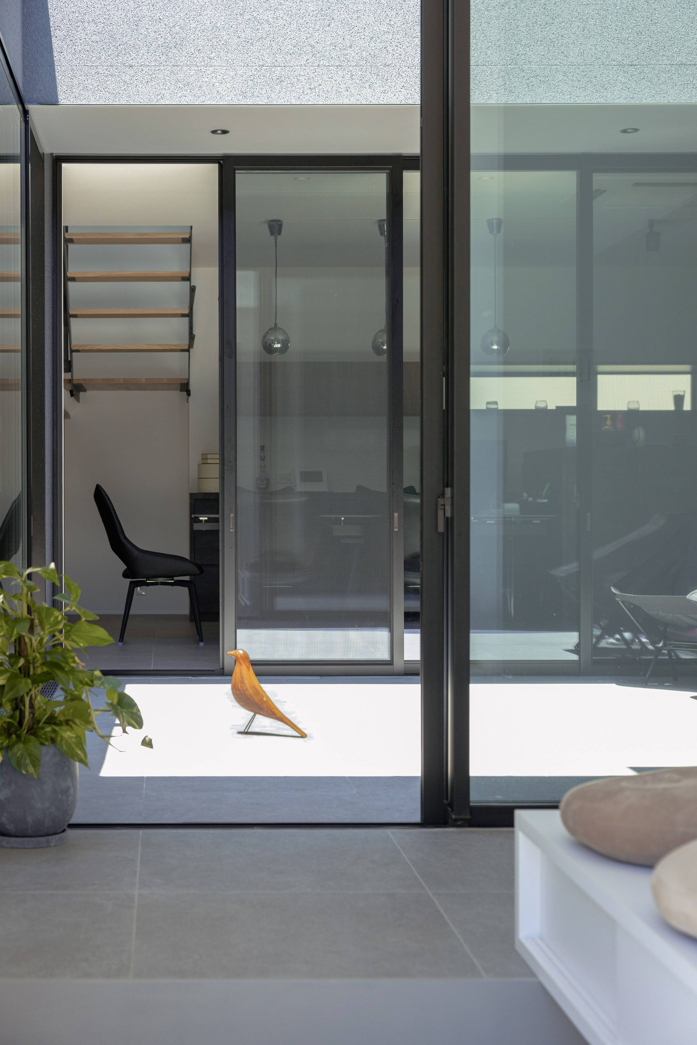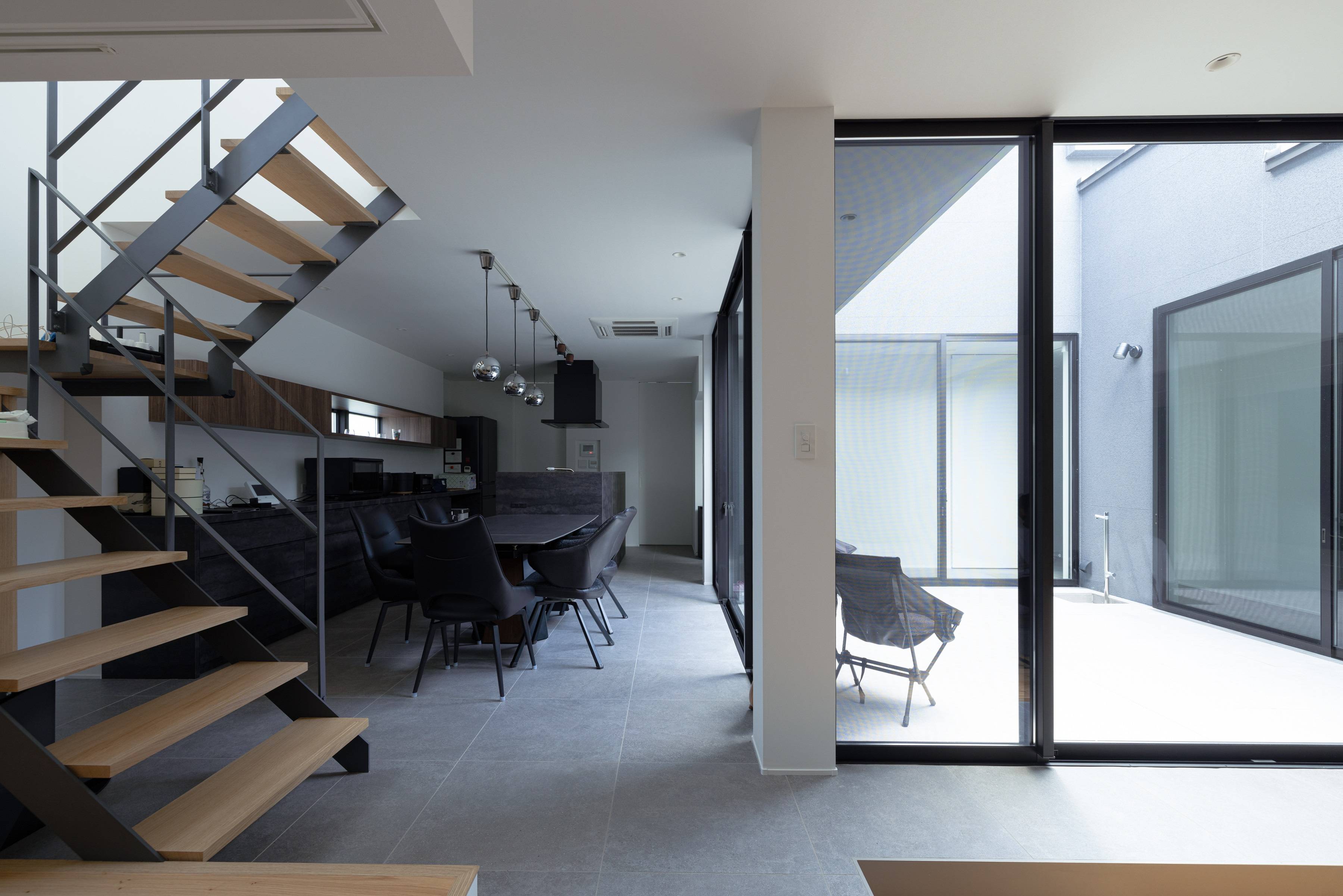 周囲の視線から、プライバシーを確保するため、敷地の中心に中庭を設けました。外部には、必要な箇所にのみ開口を設け、内部に広がる空間を計画しました。