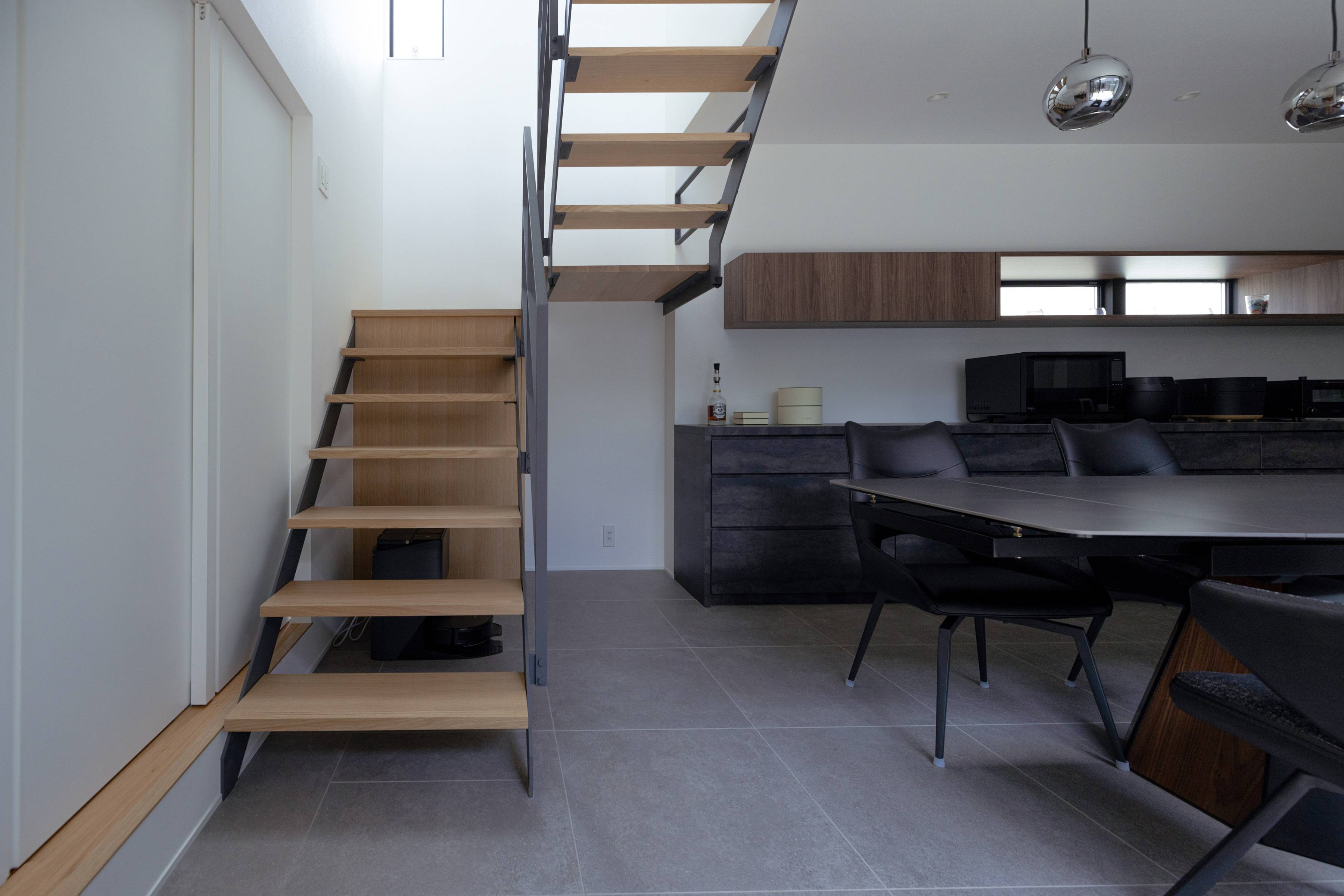 外部については、インナーガレージがら、エントランスにかけて高低差を生かした配置としており、間接照明をアプローチに設け、ガレージからエントランスにかけての動線を豊かなものへと演出しています