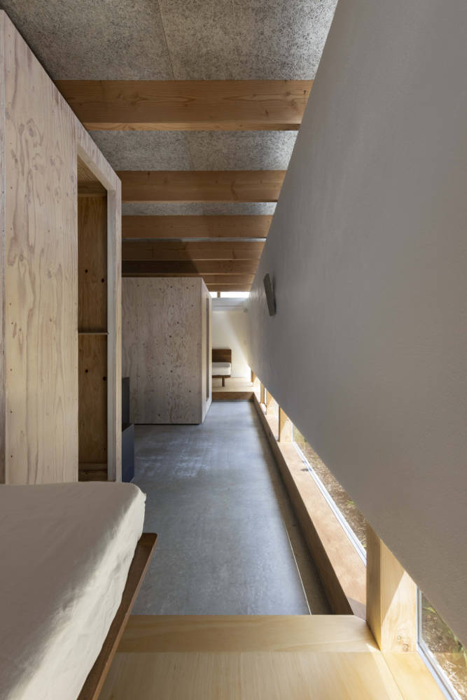 異形の角地に対して、高さの異なる二つの矩形をずらして配し、その間にできた空隙から光を取り入れている。