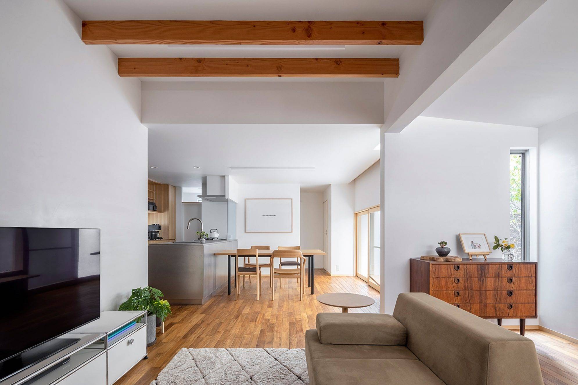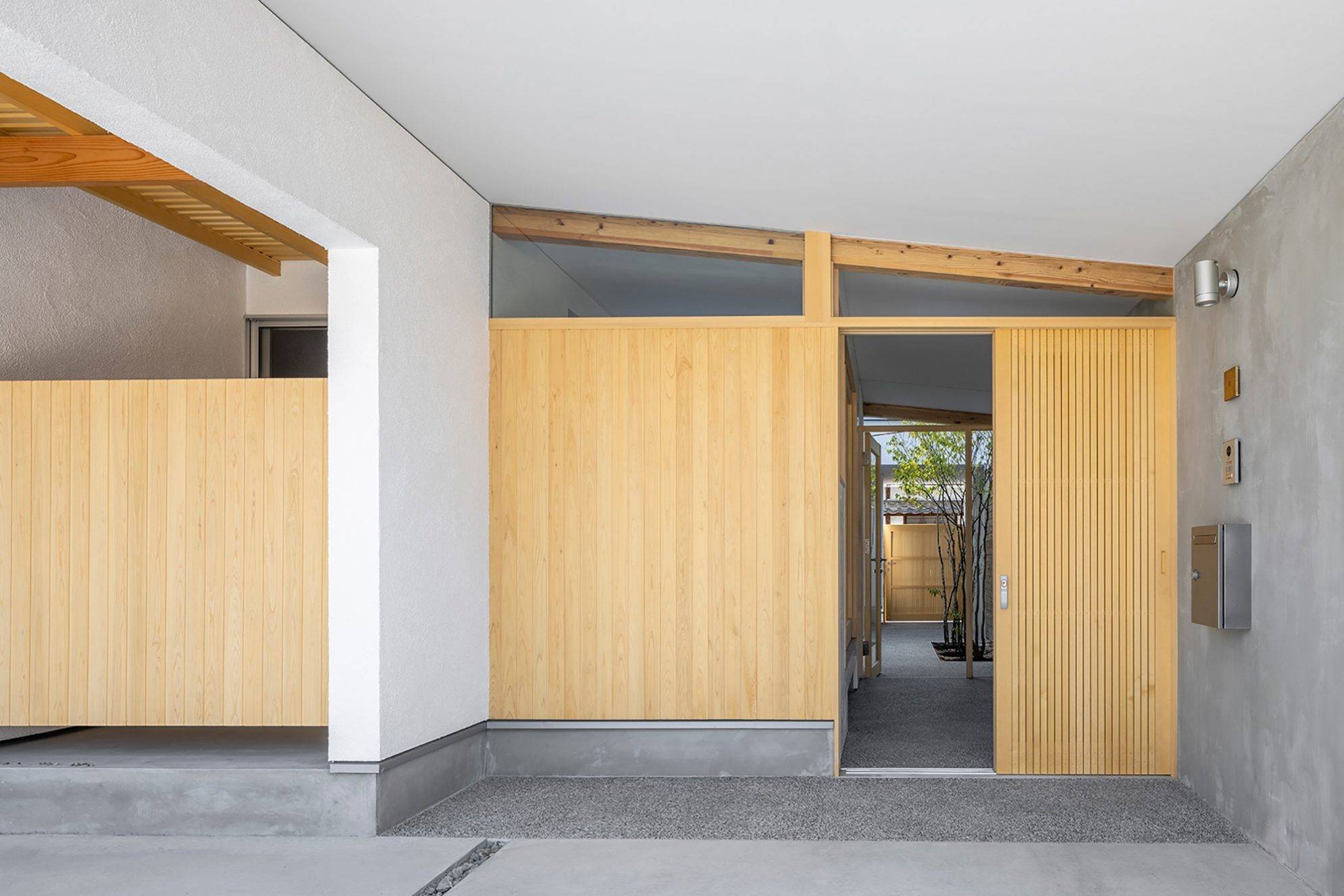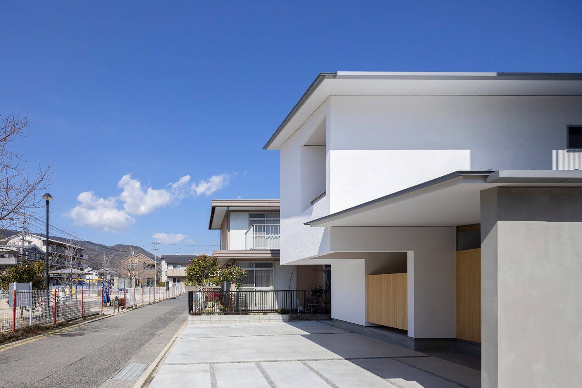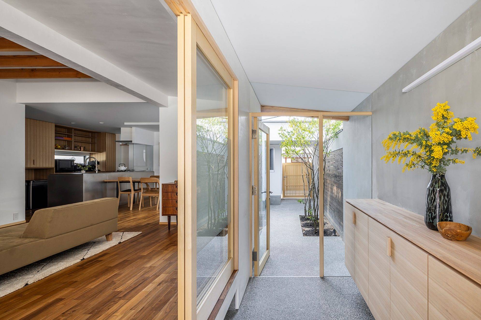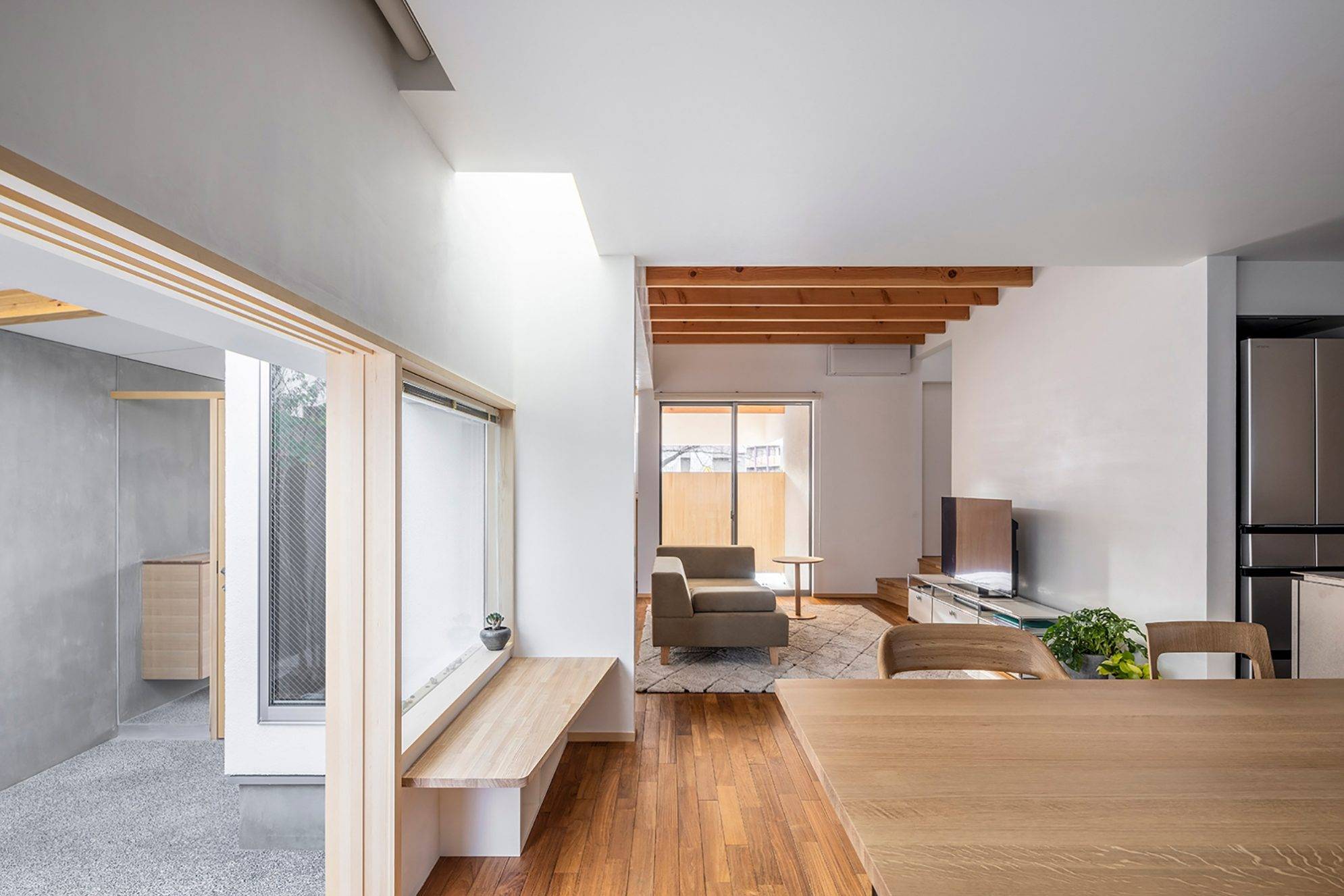 この通り庭のような場所は透ける建具によって適度に開かれ、高さを抑えた平屋建てのため、周辺環境を感じながら過ごすことが出来、道路や公園からも庭の気配が伺えるので閉鎖感を感じることがない。