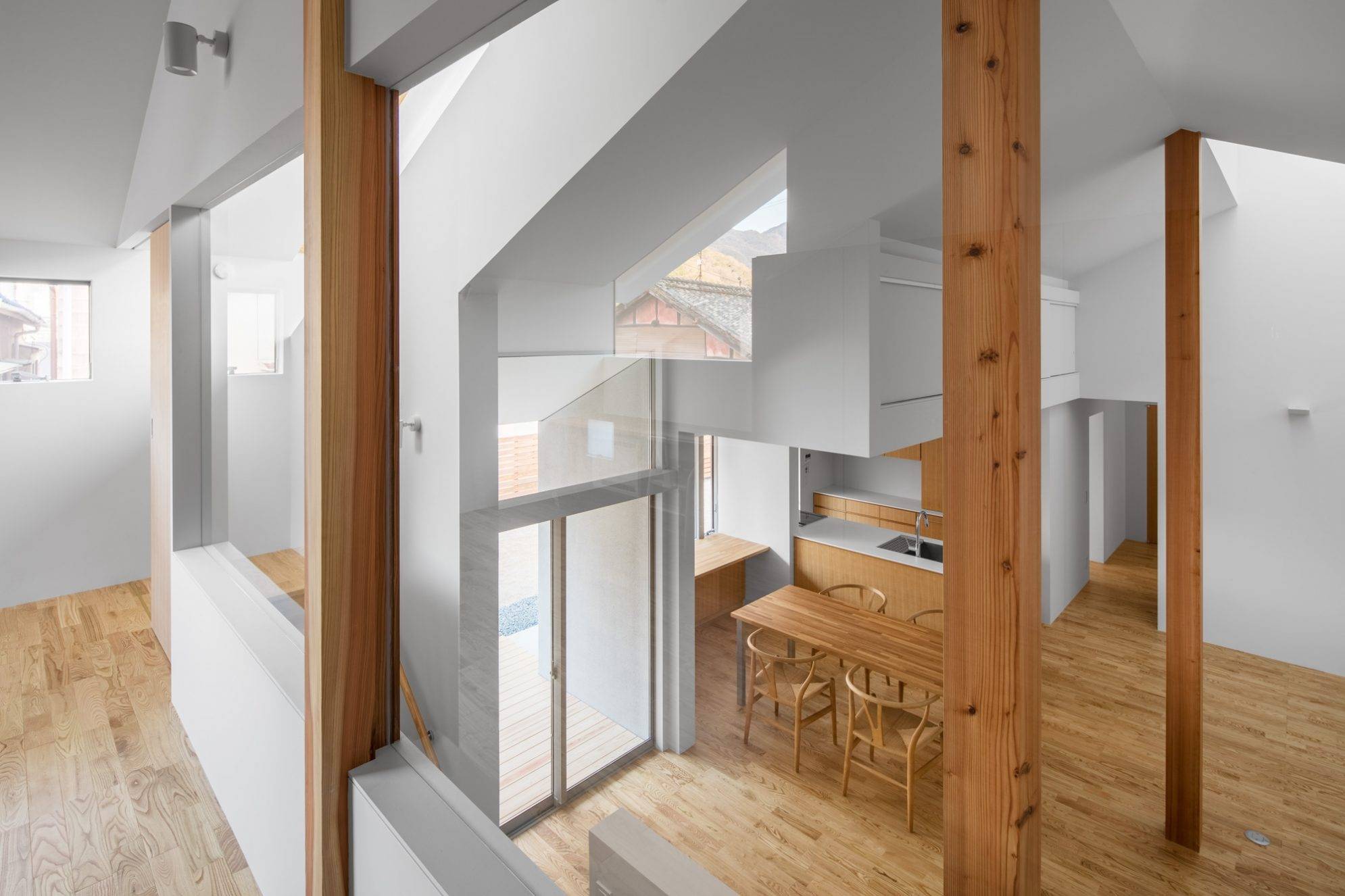 また、ぐるりと囲む隣り合った家々との距離感や窓の位置を読み解き、ずらしながら配置することでいびつな土地に調和させています。