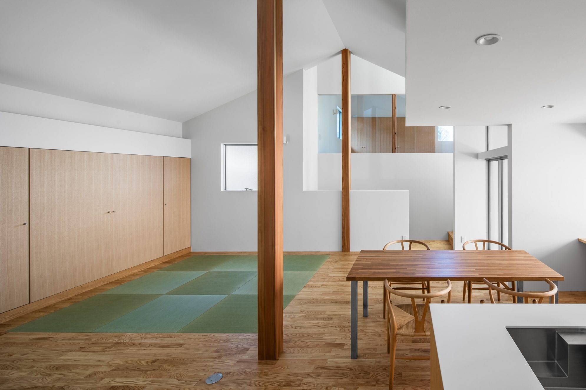 開口部を挟んで軒と連続する天井は、外部と同様にズレのある構成を引き継ぎ、内部空間においても敷地のコンテクストを体現しています。