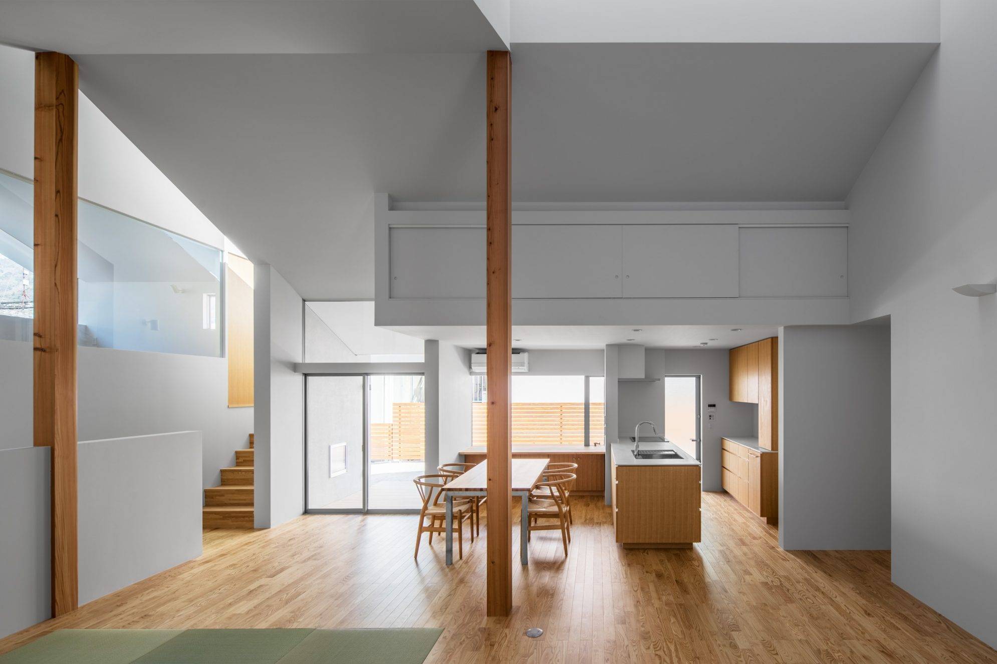 また、適所に設けた窓は南北に長いこの住宅に効果的に光をもたらし、西日で赤く染まる山々やたなびく雲など、その時々によって絶えず変化していく自然を感じ取ることも出来ます。