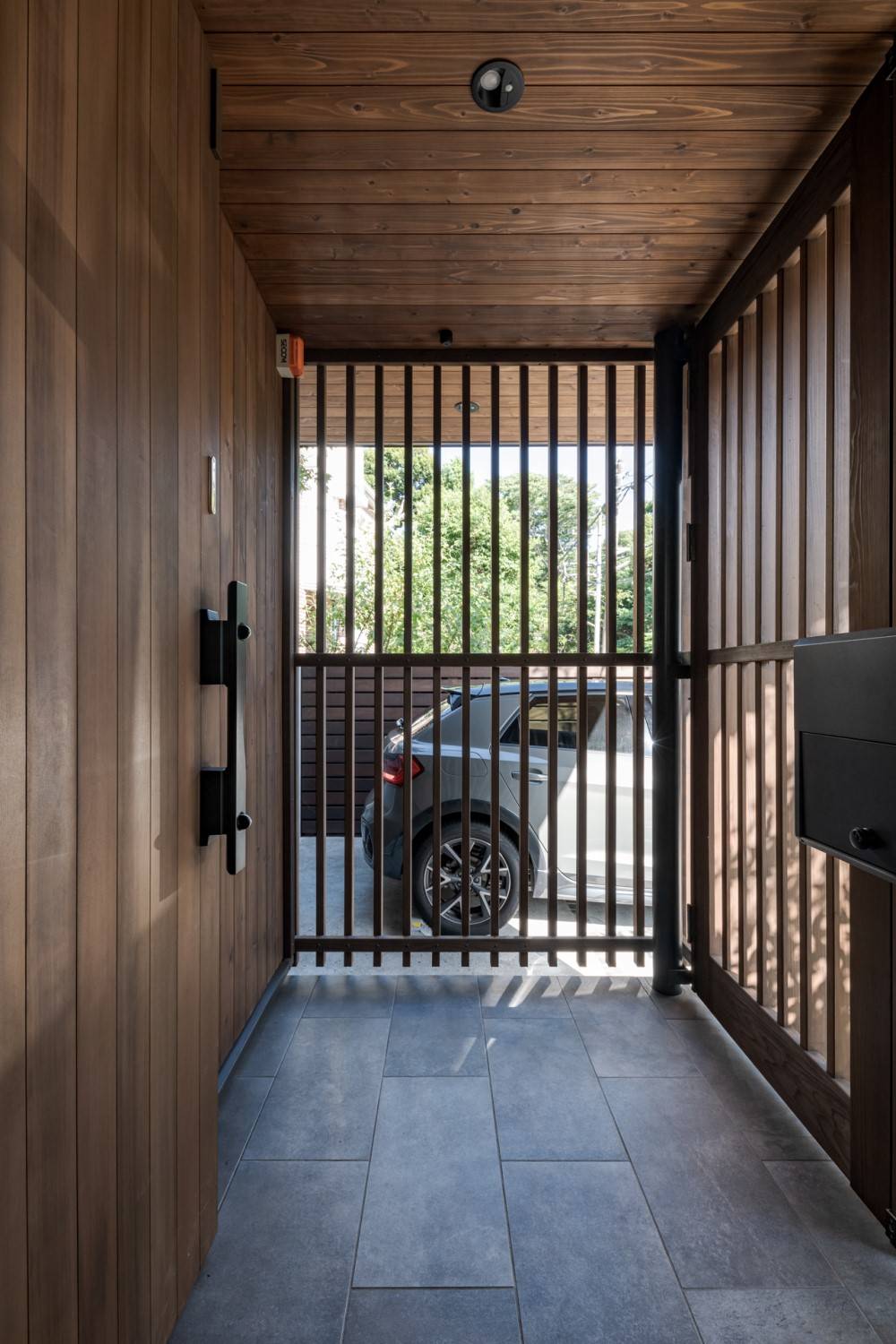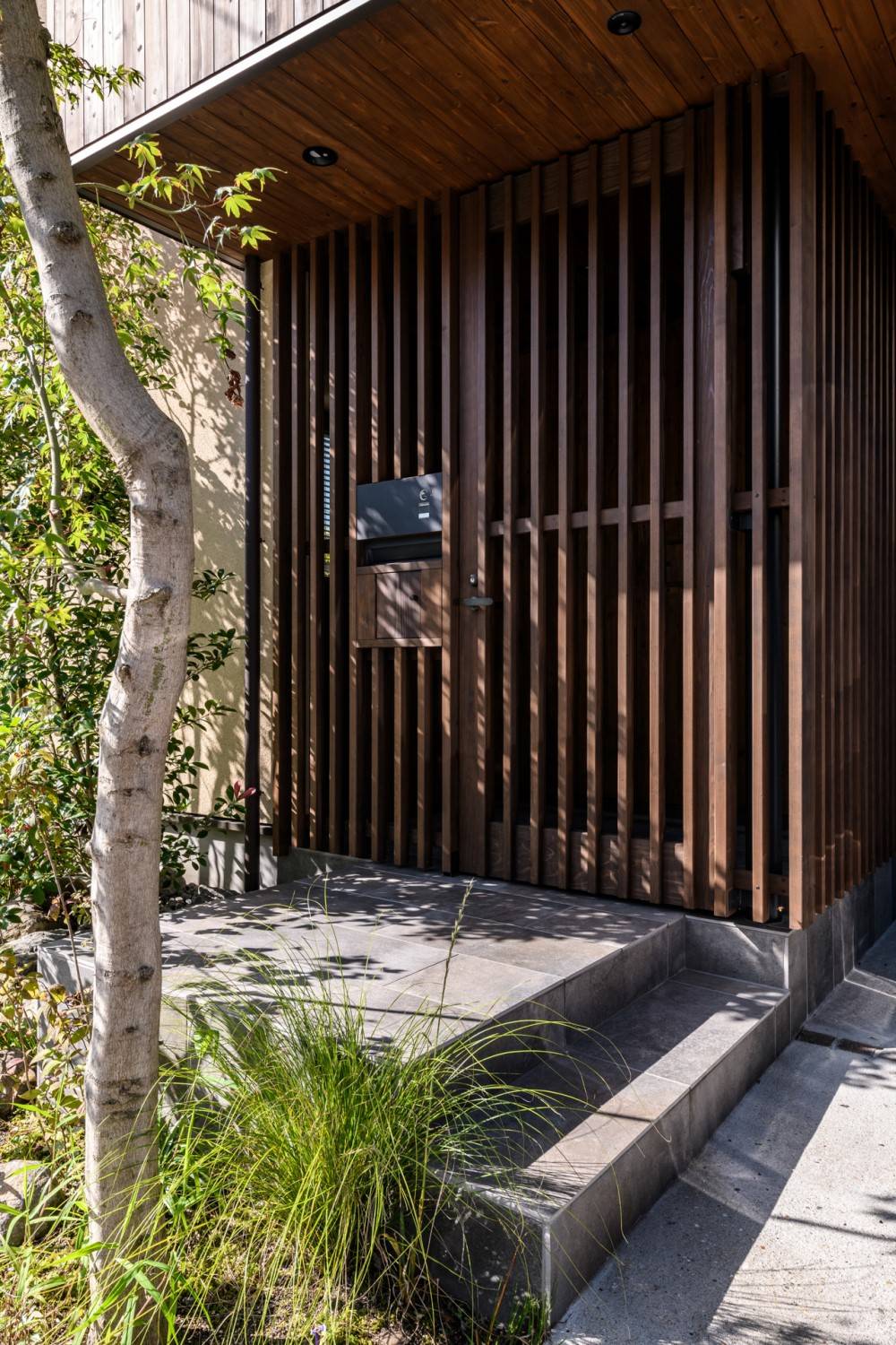 玄関前は道路との関係がダイレクトになりすぎない様、縦格子で柔らかく囲い防犯性ももたせました。縦格子の特徴あるデザインが建物に印象的な表情を与えています。