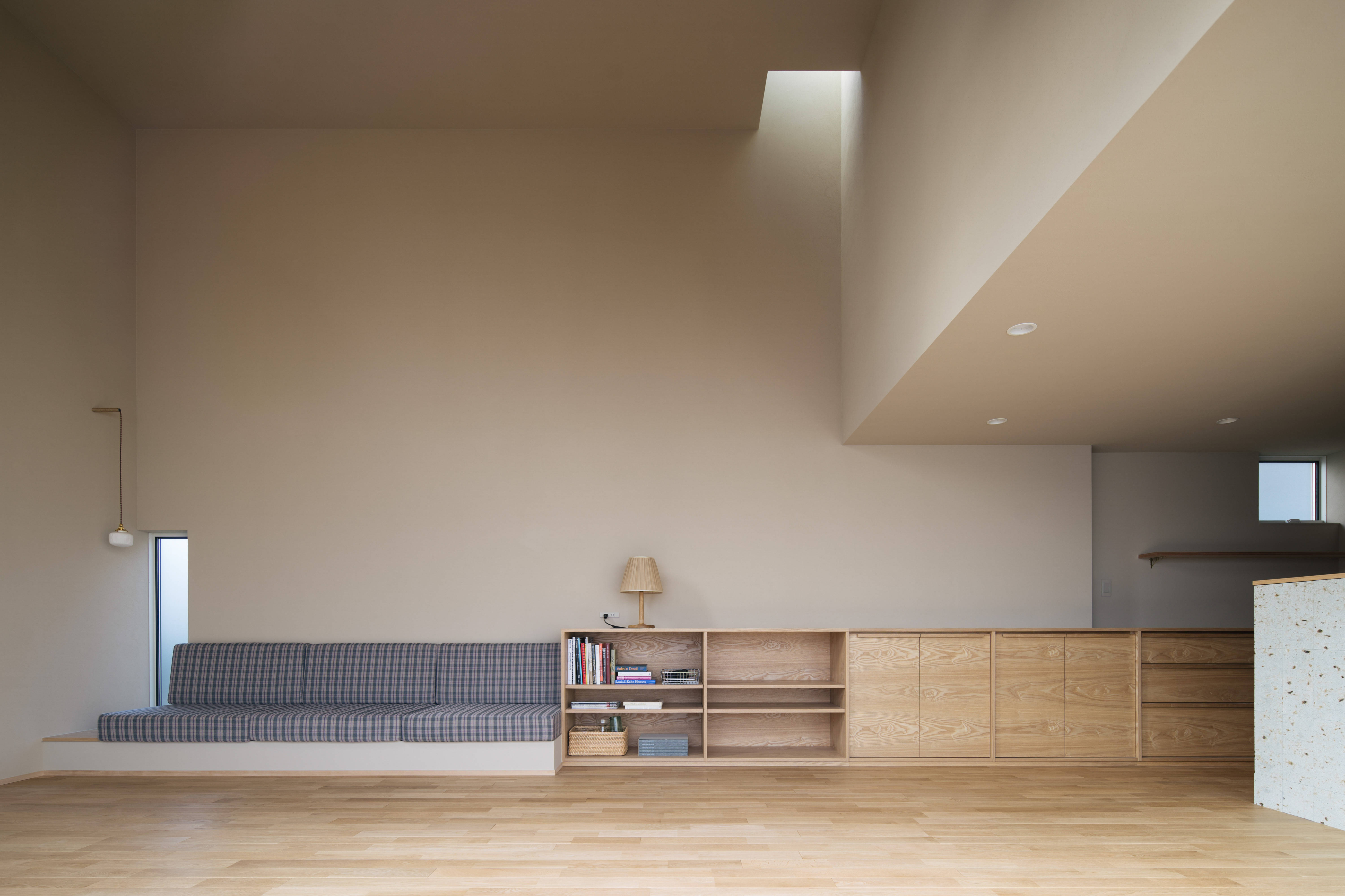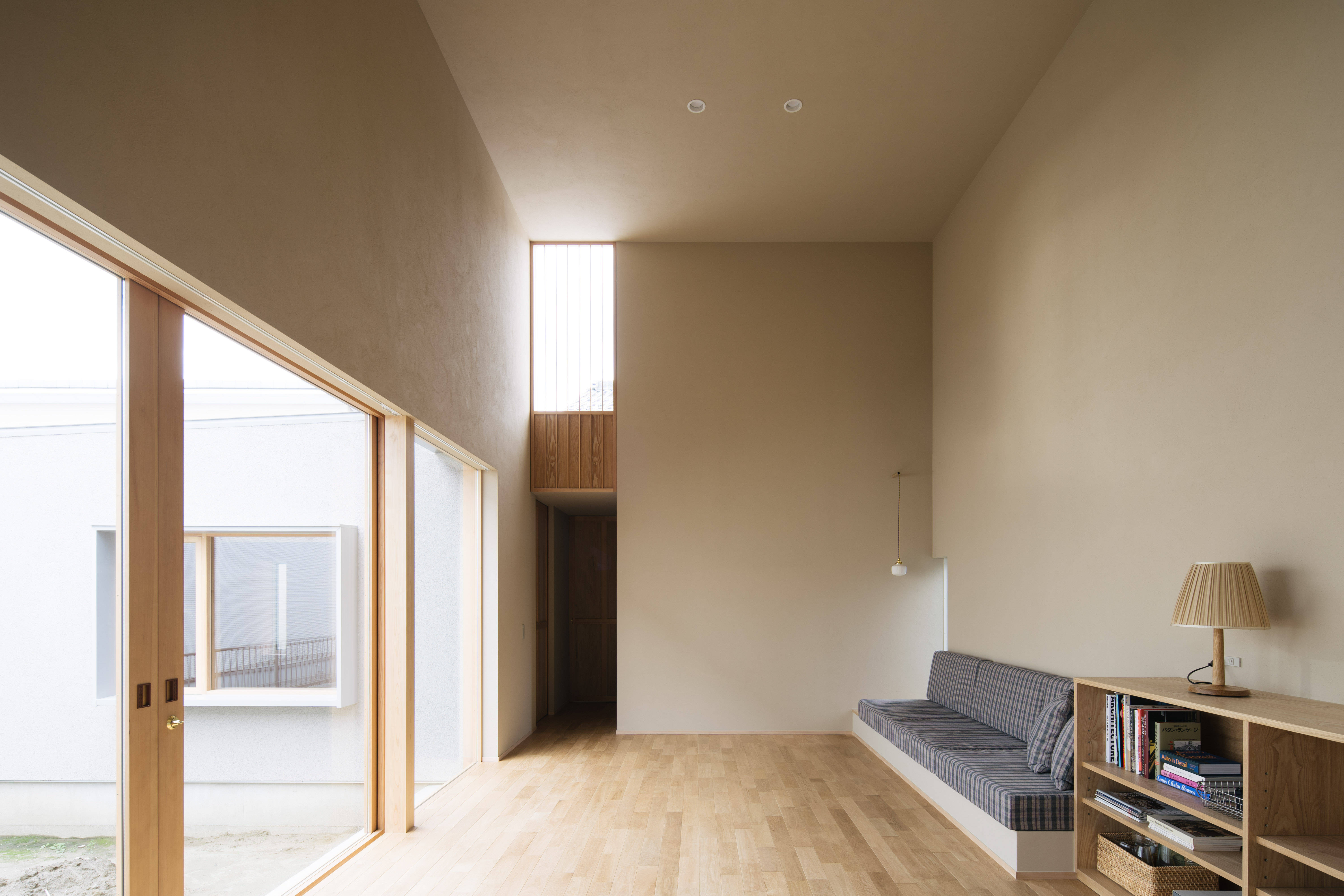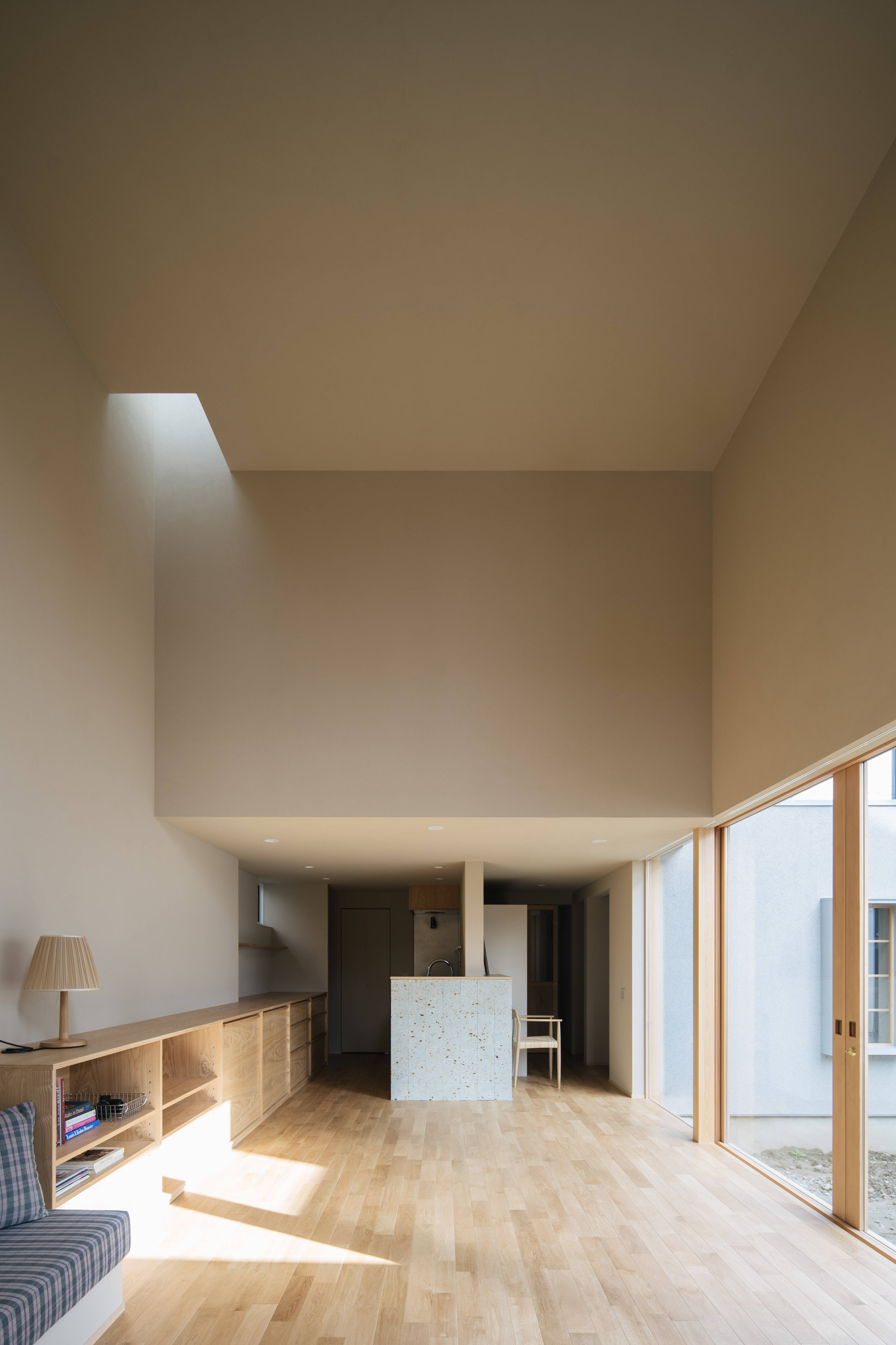 1階はコの字型プランとし、玄関・LDK・寝室それぞれの空間から中庭を眺めれるよう配置しています。要望の一つとして、明るい空間でない方が良いということがありました。一般的には南面に大きい開口をもってくるのですが、このおうちでは東面に中庭を配置し、南面は吹抜け上部に設けた縦長の格子窓のみとしました。たくさん明かりを取り入れない分、光の入り方やサイズ感、どのようにラインが伸びてくるかなどいつも以上に緻密に検討を重ねております。