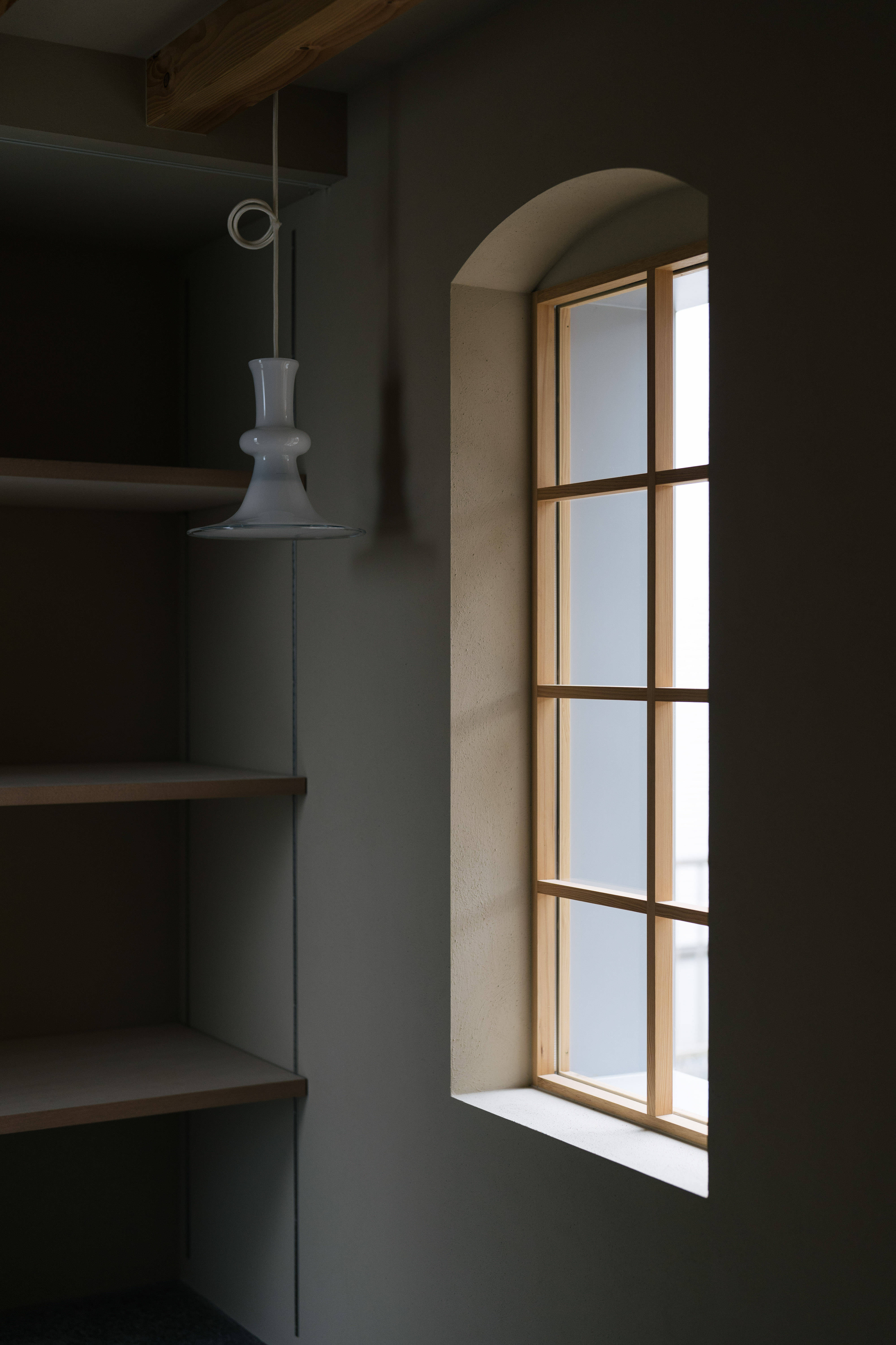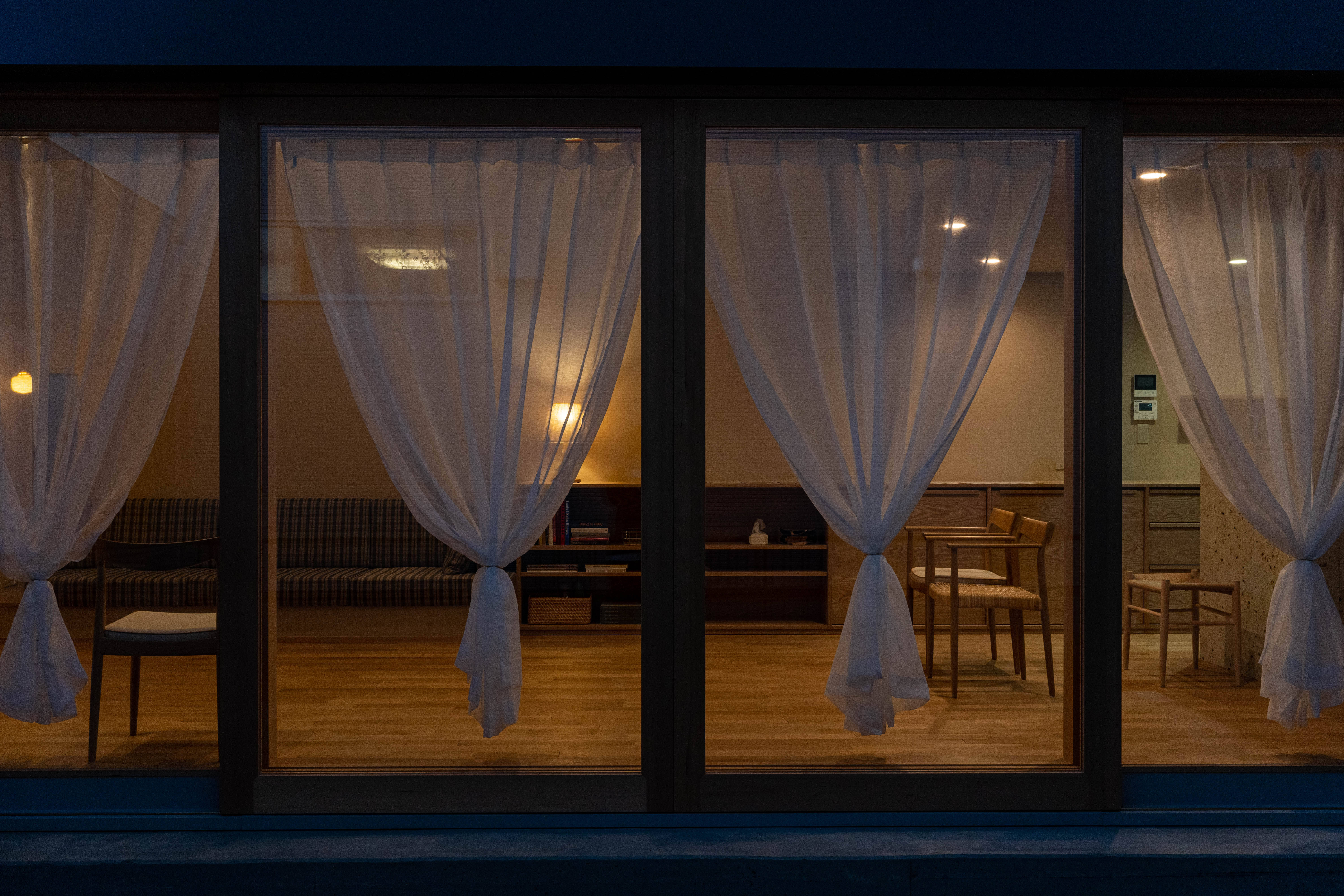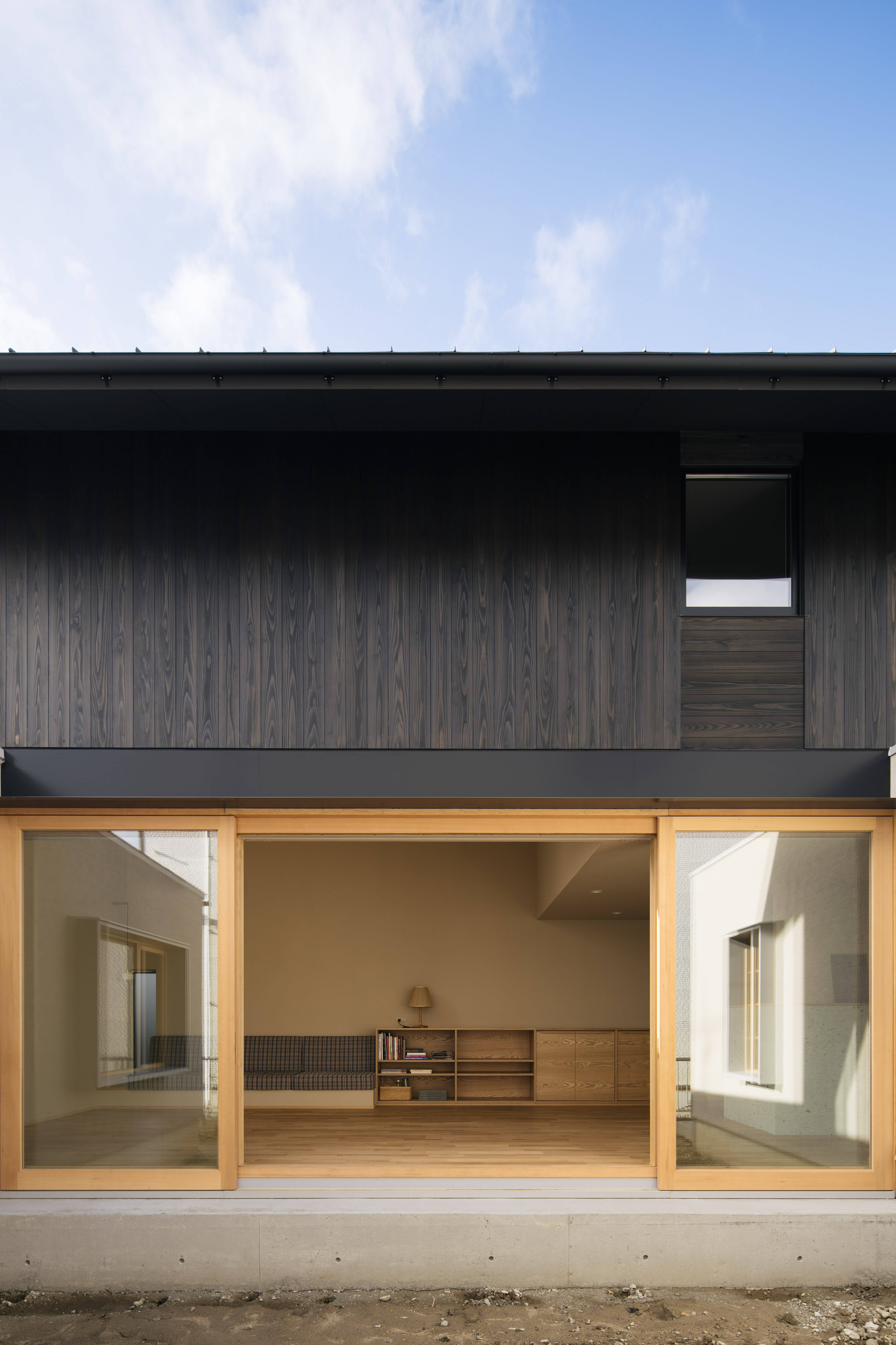 1階はコの字型プランとし、玄関・LDK・寝室それぞれの空間から中庭を眺めれるよう配置しています。要望の一つとして、明るい空間でない方が良いということがありました。一般的には南面に大きい開口をもってくるのですが、このおうちでは東面に中庭を配置し、南面は吹抜け上部に設けた縦長の格子窓のみとしました。たくさん明かりを取り入れない分、光の入り方やサイズ感、どのようにラインが伸びてくるかなどいつも以上に緻密に検討を重ねております。
