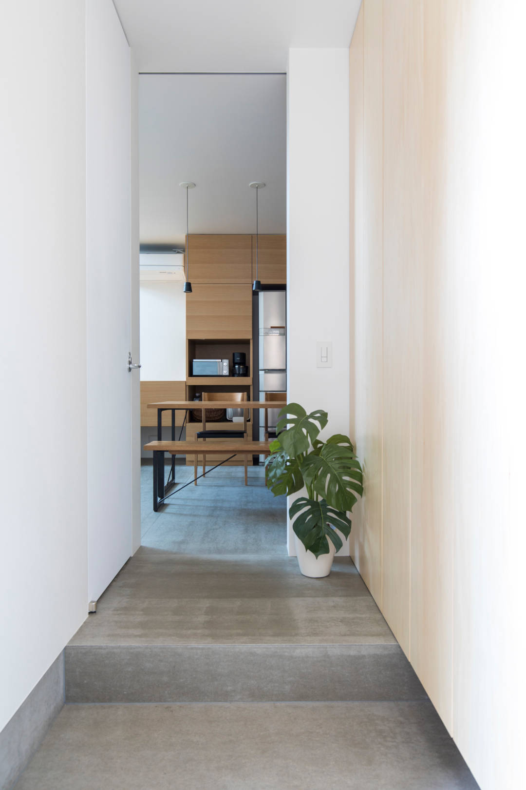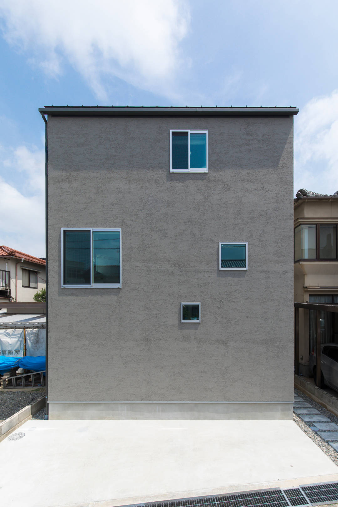 各室の床レベルを少しずつずらしたスキップフロアの空間とした。DK、リビング、スタディスペース、子供室、寝室と床レベルの異なる様々な居場所をしつらえている。周辺とは異なるレベルは、通行人の視線や隣家の窓とのズレを生み、それに合わせた開口部により視線を避けている。各室は床の高さを変えながらもつながっていて、光・風・家族の気配が通りぬけていく。ワンルームのように繋がりながら、単純な一室空間ではない多様な居場所。
