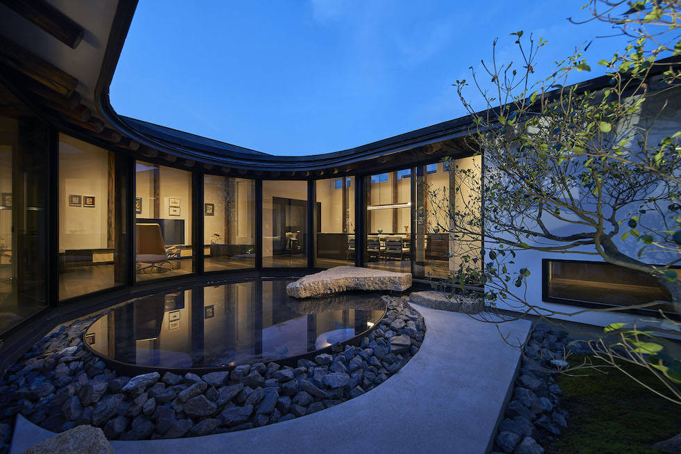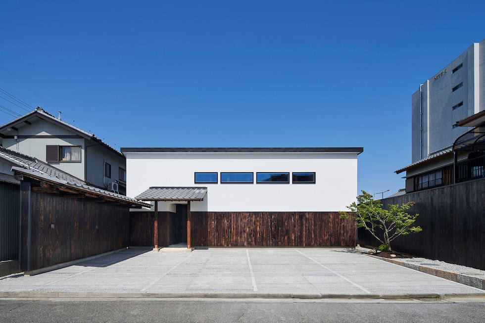 この建物は、三重県津市の中心部にある。幼少期から地元で暮らしてきた施主は、時に親戚や友人を招きながら、ゆっくりと自然体で棲まうことを望んだ。そこで、前面道路側には4台分の駐車スペースを兼ねた大きなセットバックを設け、プライバシーの守られた中庭を囲むように諸室を配置した。内周と外周に並ぶ丸太の列柱が支える内勾配のすり鉢状の屋根は、中庭に自然を集める環境装置として機能する。晴れた日は陽の光が築山を照らし、雨上がりには軒先から落ちる雫が水盤の水面を揺らす。屋根を支える放射状の登り梁が中庭へと視線を導き、時間や季節の移ろいを常に身近に感じることのできる家である。