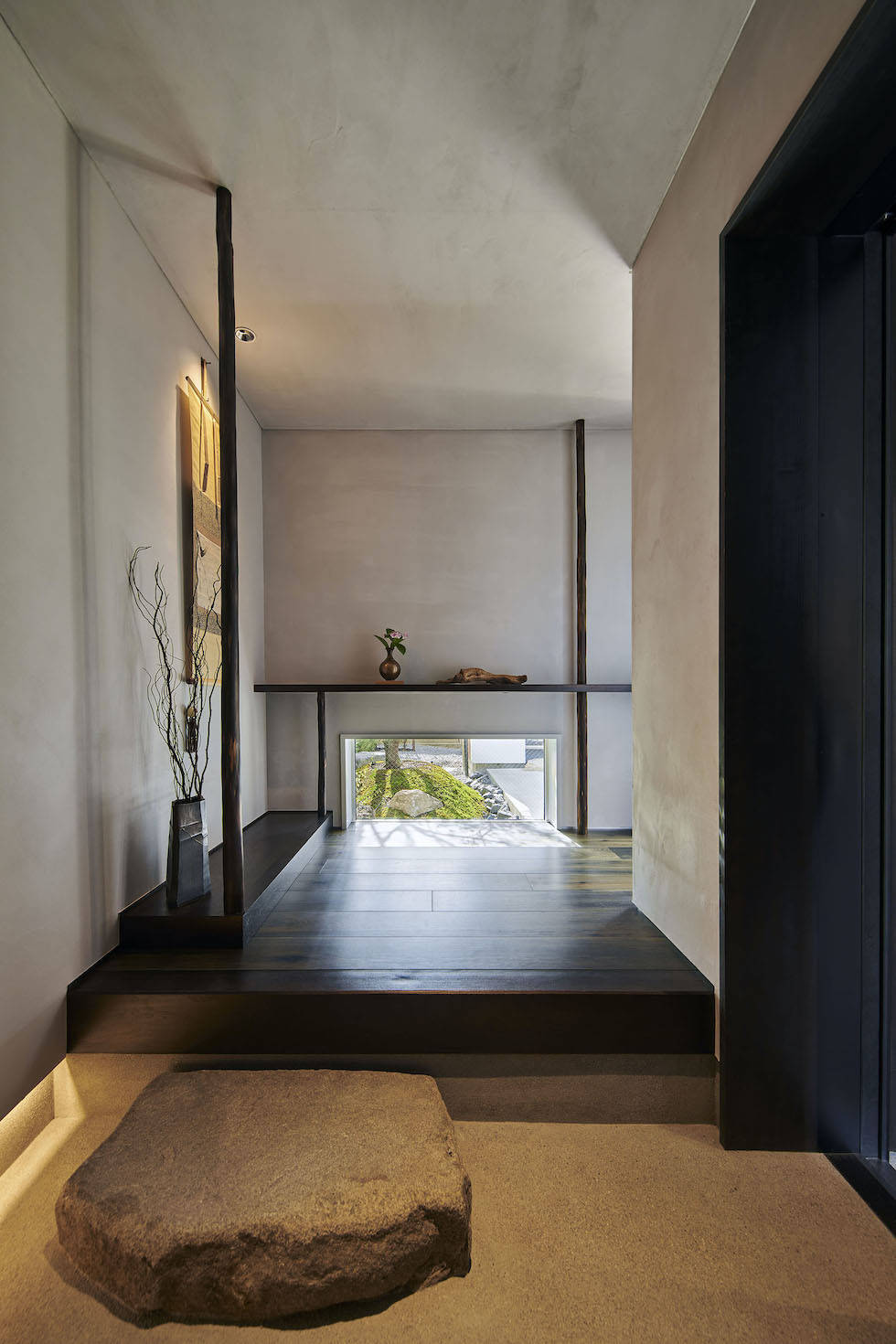 北山杉の天然丸太には、甘皮を剥いた後に表面を火で炙り、やすりをかけて余分な炭を落とし、水洗いしてからクリア塗装をかける、という手間をかけた加工を施している。この操作には、表面を炭化させることで日射による変色や風化から木を守る機能的な役割に加え、自然素材ならではの木目や凹凸、色むらなどを意匠として際立たせる狙いもある。元々は華美な装飾が施された石柱で構成されるコロネードであるが、膨大な手間と時間がかけられた天然素材の丸太には、石の重厚感や荘厳な雰囲気に勝るとも劣らない質感が宿っている。更に、中庭に出る際に手が触れやすい部分の柱に巻かれたラタンや、丸太同士が「ひかりつけ」で取り合う端部の納まりなどを見ても、素材に対して注ぎ込まれたクラフトマンシップを感じ取れるだろう。また、外構の庇や玄関の飾り棚、ライブラリーの本棚など、随所に径の細い海布丸太も用いることで、建築的な要素と身体を近づける工夫も凝らしている。