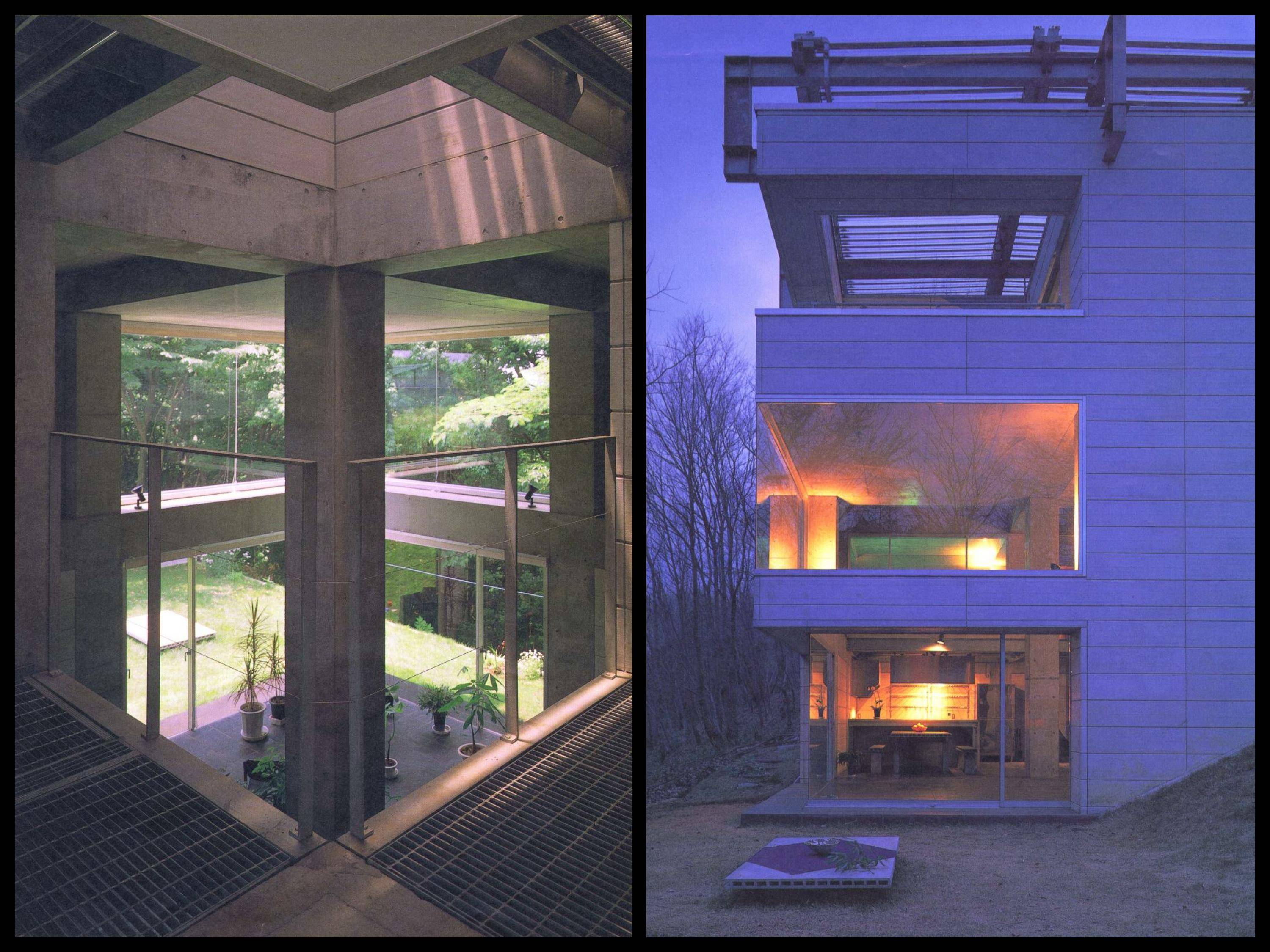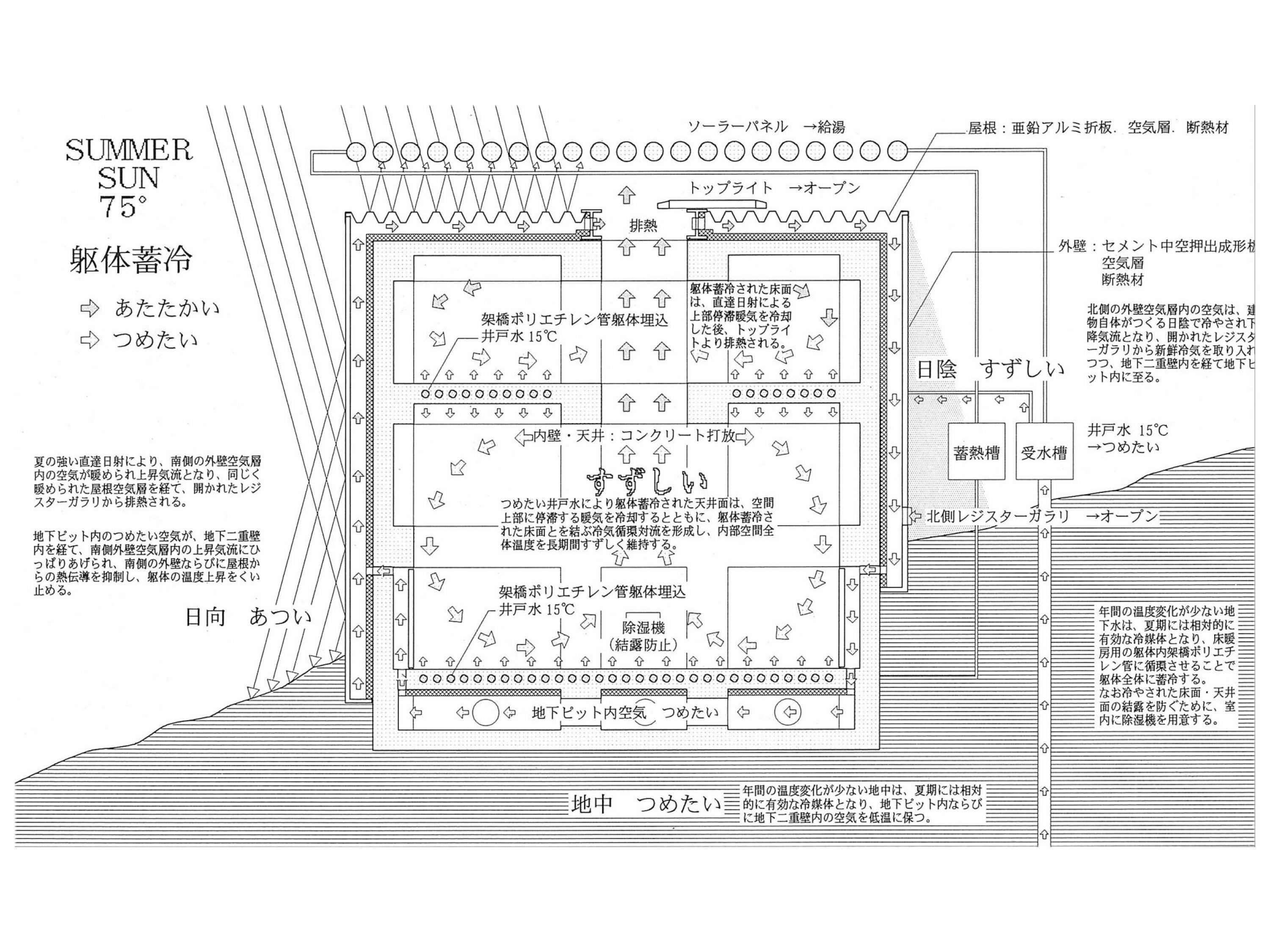 山の斜面に建つ、エコロジカルハウスの試み。 太陽洸、風、雨、地面、周辺の自然などを活用し、環境と共生する住宅。 RC造一部鉄骨造 地下1階地上2階