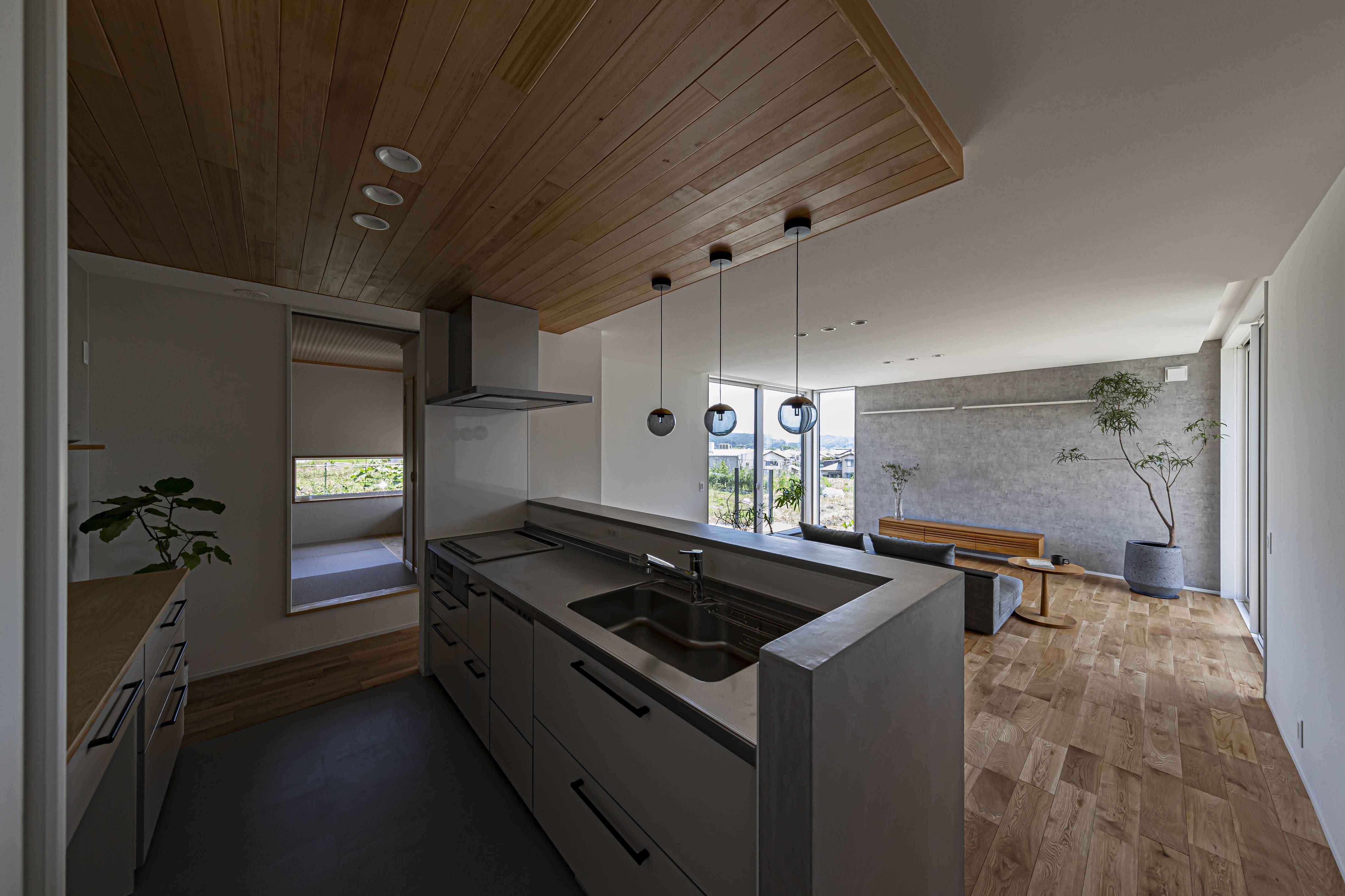 環境に囲まれた「半島LDKのある家」は敷地の外側からは伺い知れない開放感と日々の生活の暮らしやすさの両立が出来る住まいです。