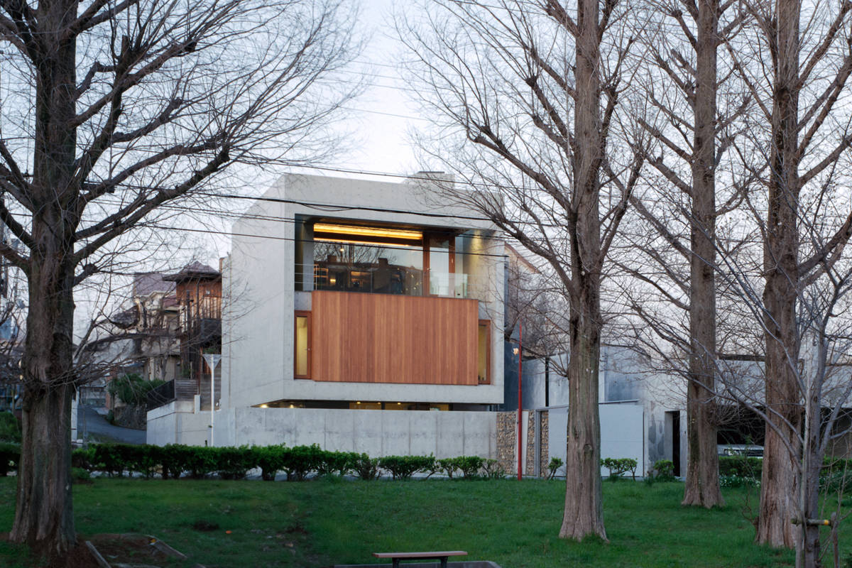 筒状のコンクリートは、少し浮いているように、軽やかに見えるよう地面から構造的に持ち出したり、下の建物をアルミパネルでまとめて見え方の違いを見せるようにしました。