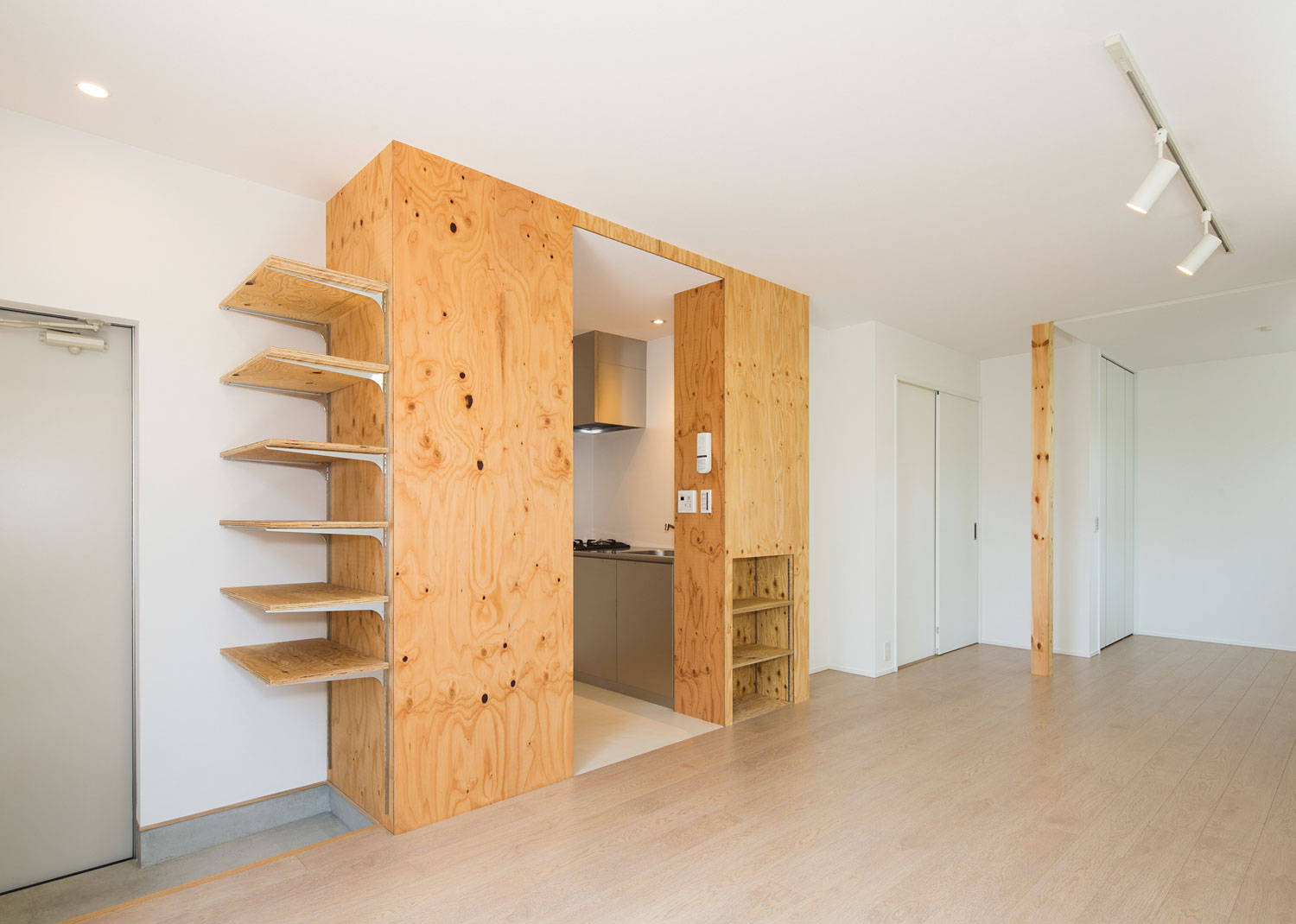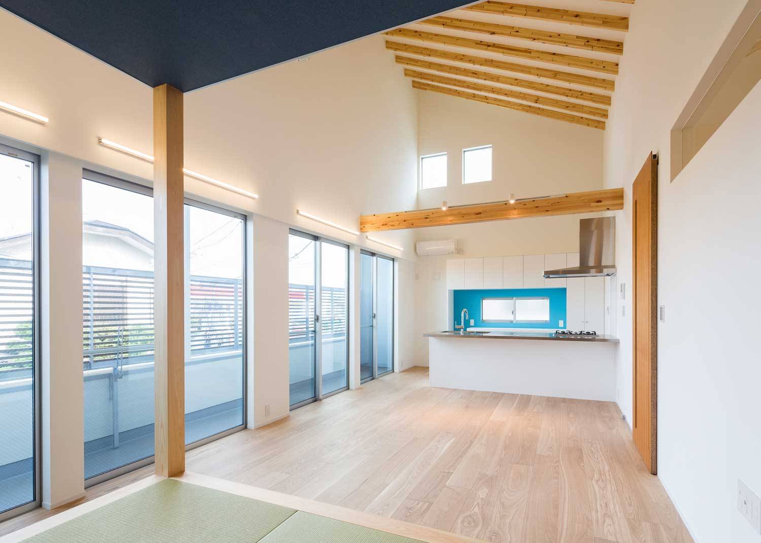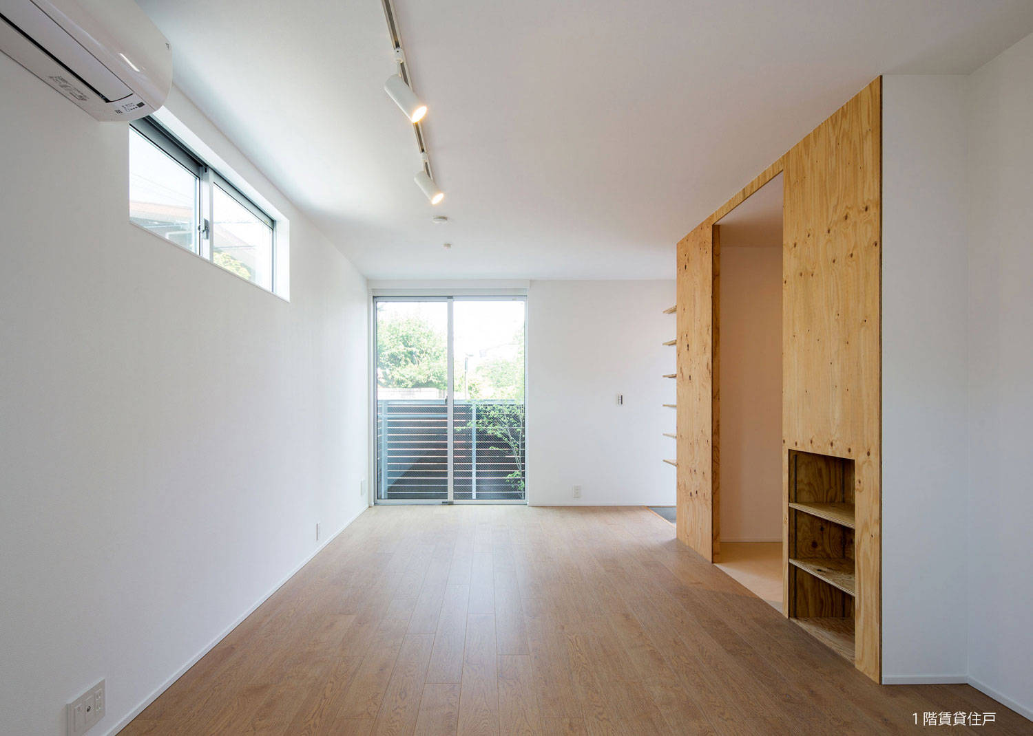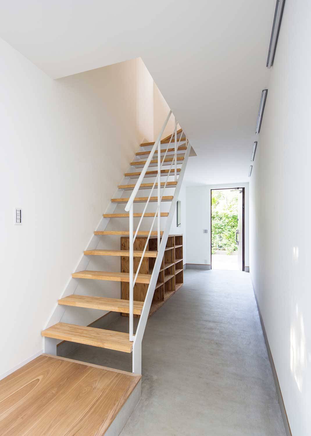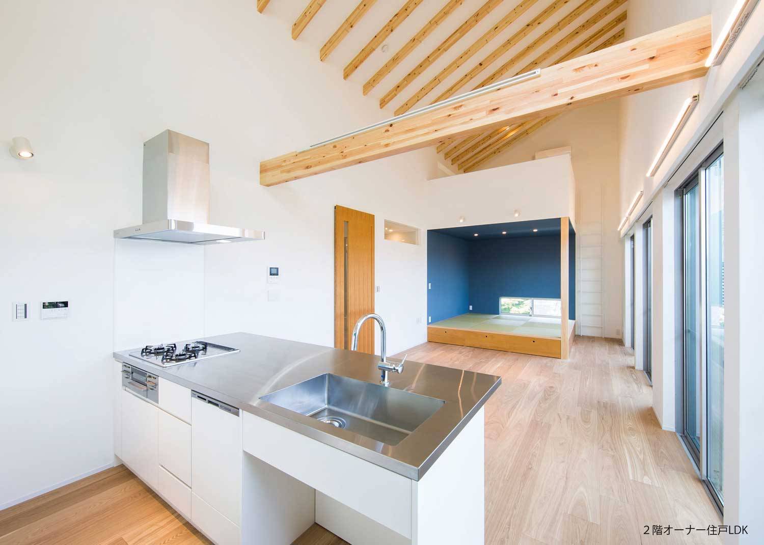 1階に35㎡の賃貸を2軒、2階がオーナー住戸(夫婦+4歳/6歳の兄弟)の賃貸併用長屋住宅。とんがり屋根が目印の、とんがりを逆から読んでRigantoです。角地を活かし、賃貸とオーナーのアプローチ動線をわけ、メインの道路側に、顔となる賃貸エントランスを設けています。1階賃貸は専用庭付き、オーナー住戸は、LDK全面にバルコニーを設け、これを道路からのバッファーとしています。オーナー住戸の玄関は、通り土間とし、趣味のサーフボードを磨いたり、日曜大工、雨の日には子供の遊び場となるような空間としました。