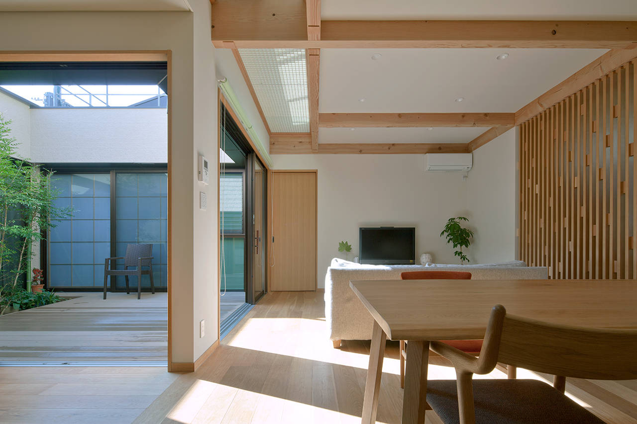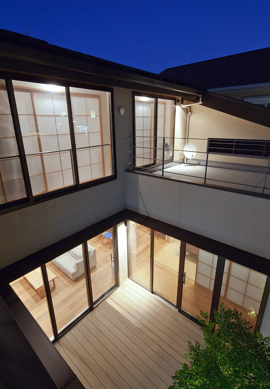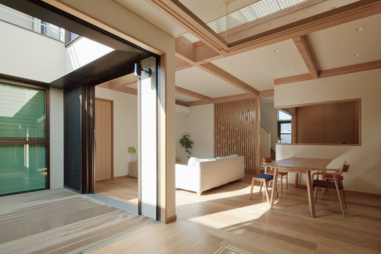 二世帯で住むので、見る見られるという関係を良好に保ちつつ、高齢の親の見守りが出来るよう 家の真ん中に10帖の中庭を設け、その周りを各部屋が取り巻く間取りとしました。 また、屋根を南側へ2階から1階へ葺き降ろす片流れとすることで、屋根面を大きく取り 太陽光発電を10kw以上載せる事が出来、かつ、吹抜や中庭、バルコニーといった 要素を上手く構成する事が出来ました。