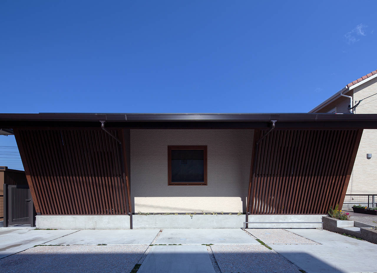 四角い箱型と片流れの屋根を組み合わせたモダンな形状に、お...