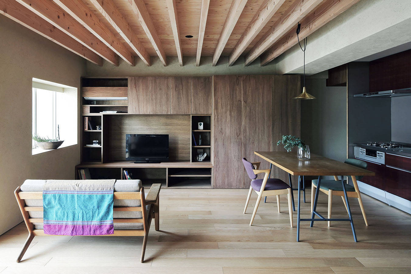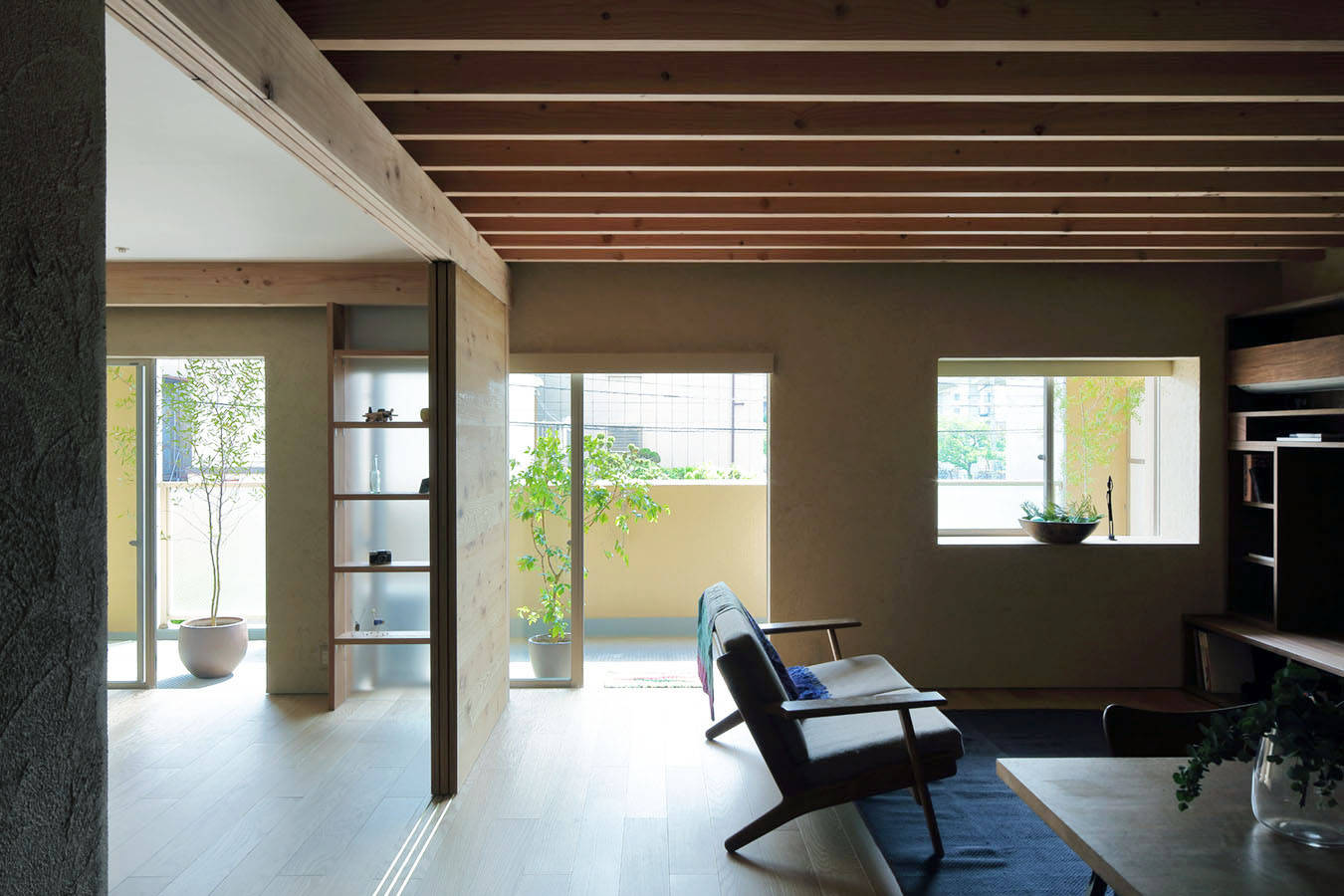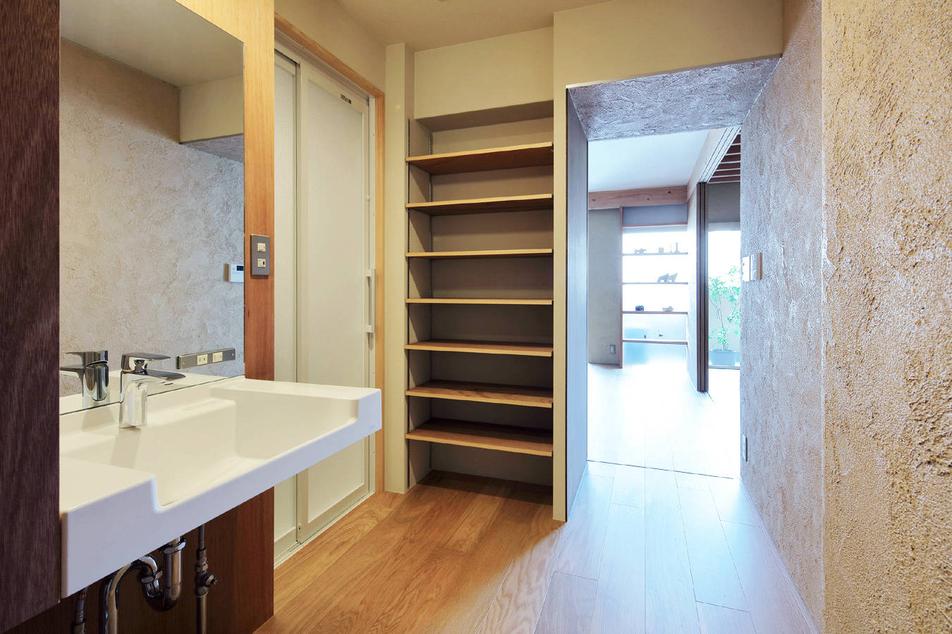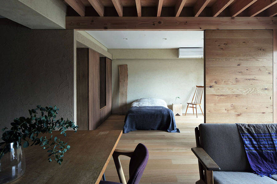 マンションは木造住宅などと違い、柱や壁に影響されず自由な間取りにすることができるため、通路や建具の幅、水廻りの大きさなど住む方に合わせて調整することが可能で、自然素材を使うことで戸建て住宅と同等の住み心地を得ることができます。