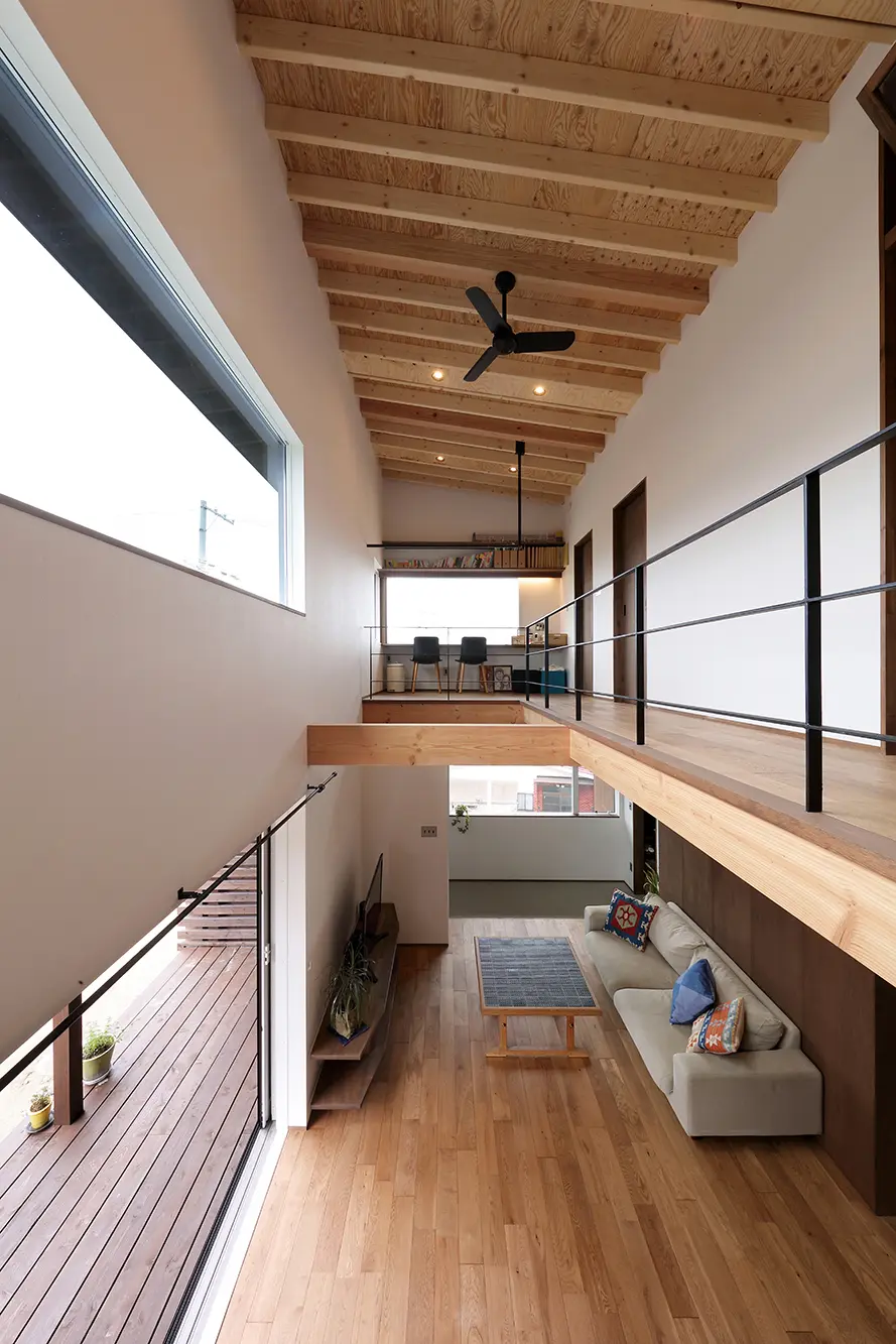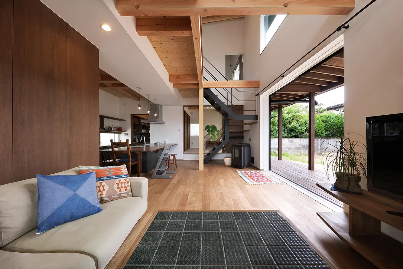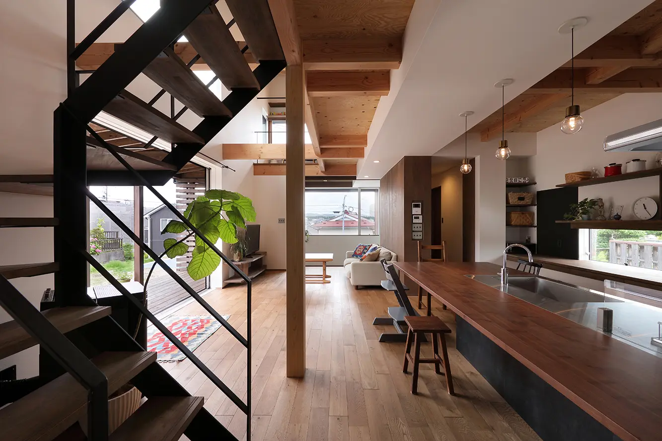 静かな住宅街の高台という見晴らしの良い敷地。『光』『風』『風景』を取り込み、大きな窓のあるコモンスペースやペレットストーブと土間エントランスのあるLDKから仙台市街を一望できる心地良い住まいです。 生活の中心となる『みんなのキッチン』を中心に吹抜けで各室がつながり、家族それぞれがほど良い距離感を得られます。 キッチンとテーブルを一体化した大きなキッチンは創作の場としても大活躍。 風景や趣味を愉しみ、自然な風や緑を呼び込んで健康的な住まいになることを期待しています。