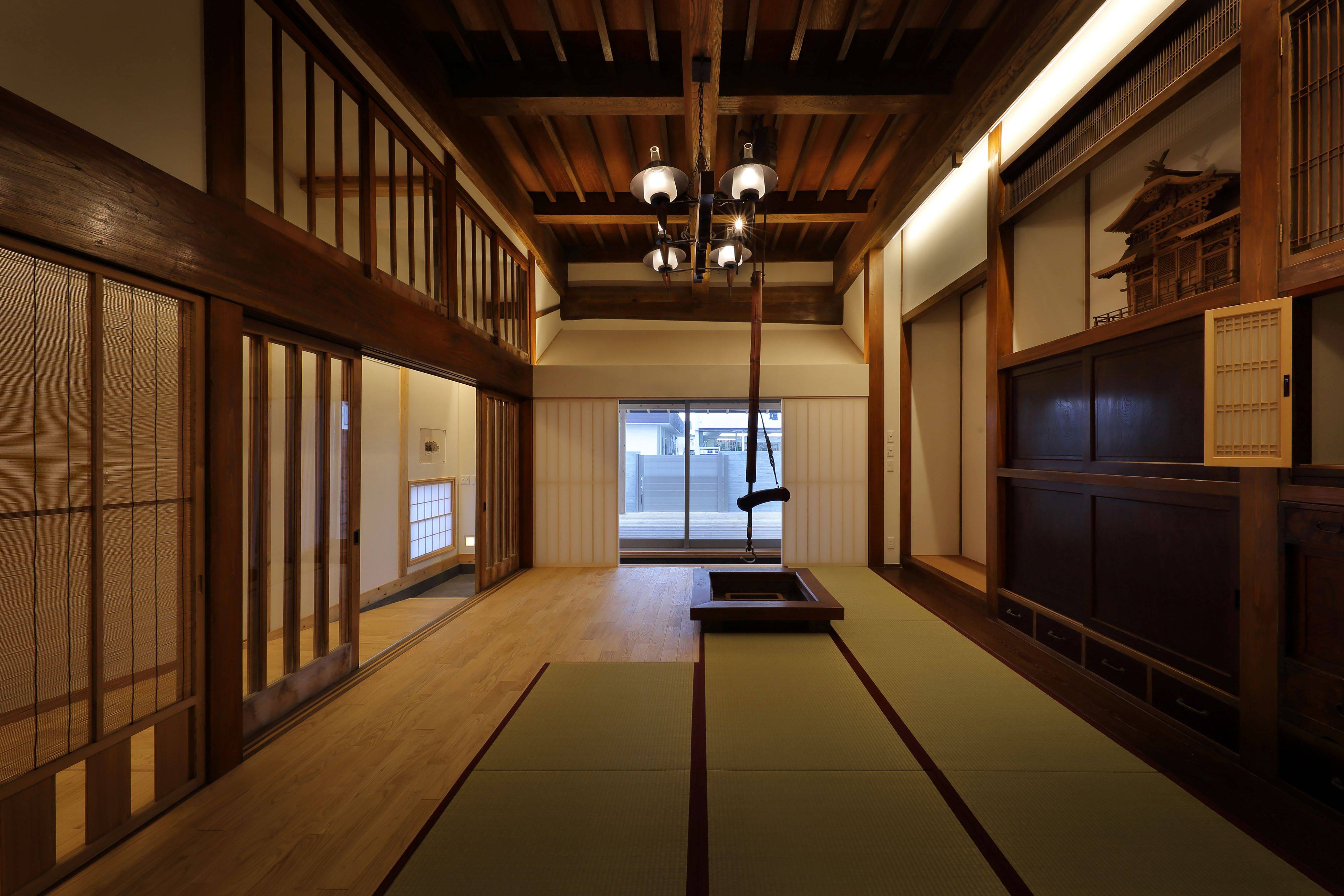 小高の改修工事は、「離れ」と「母屋」と「広場」の三つのエリアに亘るリノベーション計画です。 先行して2016年から「離れ」を住まいに改修して帰還のための暮らしのベースを整え、その後、親族間交流施設としての「母屋」と「広場」の改修に取り掛かり、2019年に完成しました。 「離れ」は、現代生活に対応するよう間取りから見直した全面的な改修でしたが、「母屋」は、職人の技術や使われている材料に歴史と伝統が感じられることから、囲炉裏の場と客間を現状保存するよう配慮しています。また、保存されていた「煤竹」と「古材」等も再活用して各所に設置しています。