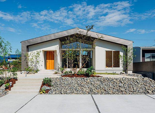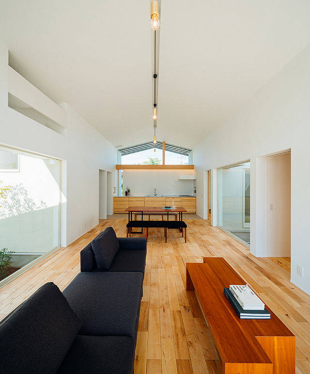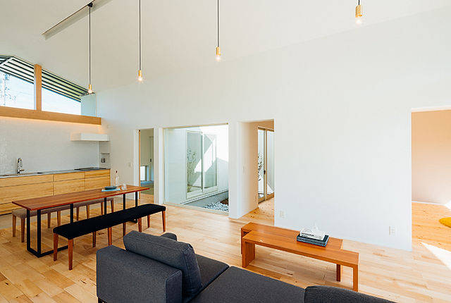大きな開口部は南北に長いLDKを明るく照らし、深い庇が夏の陽射しを遮っています。各部屋へスムーズに行き来できるようにLDKを中央に配置。部屋から部屋へと移るので、廊下を減らして床面積を節約しています。