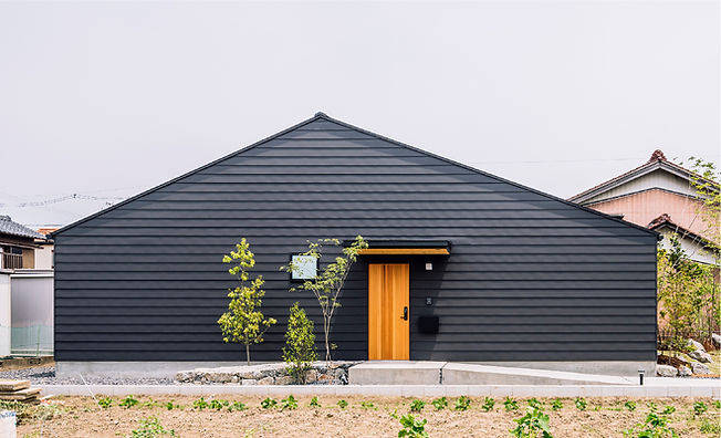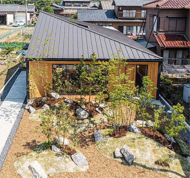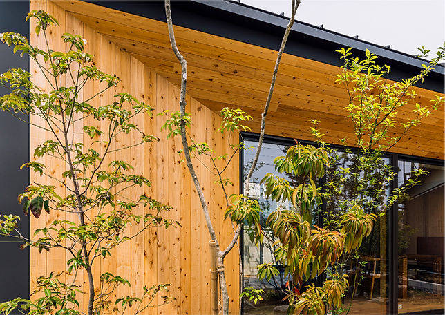 ご要望は大きな屋根が見える障子のある家ということで、高さを抑えた庇と板貼りの外壁、大きな開口には道路からの視線を遮ることができる障子を設けました。
