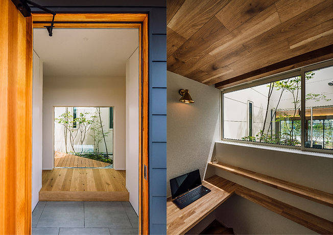 平屋のデメリットとなる中央の部屋への陽射しを確保するために、中庭を設けて回遊動線としています。半分はプライベートな動線として 部屋から部屋へと移動できることで廊下部分を減らしています。