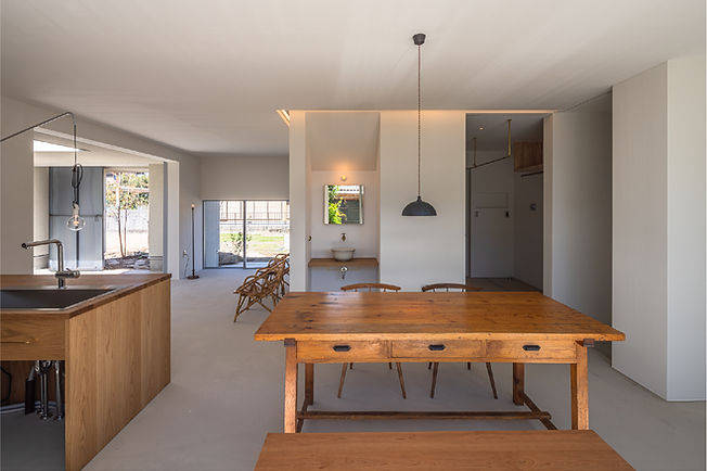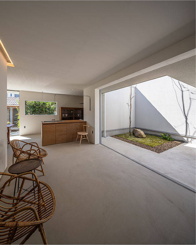 ご希望により、1階床は全て土間仕上げになっていて、中庭との段差がほとんどないこともあり庭をより近くに感じられる家になっています。