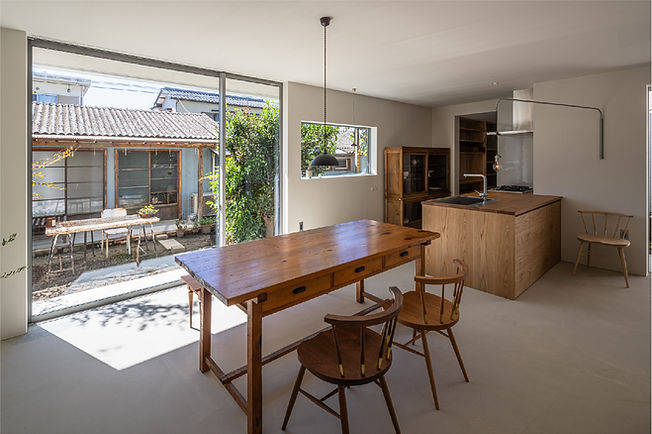 周囲からの視線を気にせずテラスでお茶ができるようにしたいということで、限られた建て替えスペースの中で大きめの中庭を計画し、庭との一体感を感じられるように全開口できる掃き出し窓を設けました。