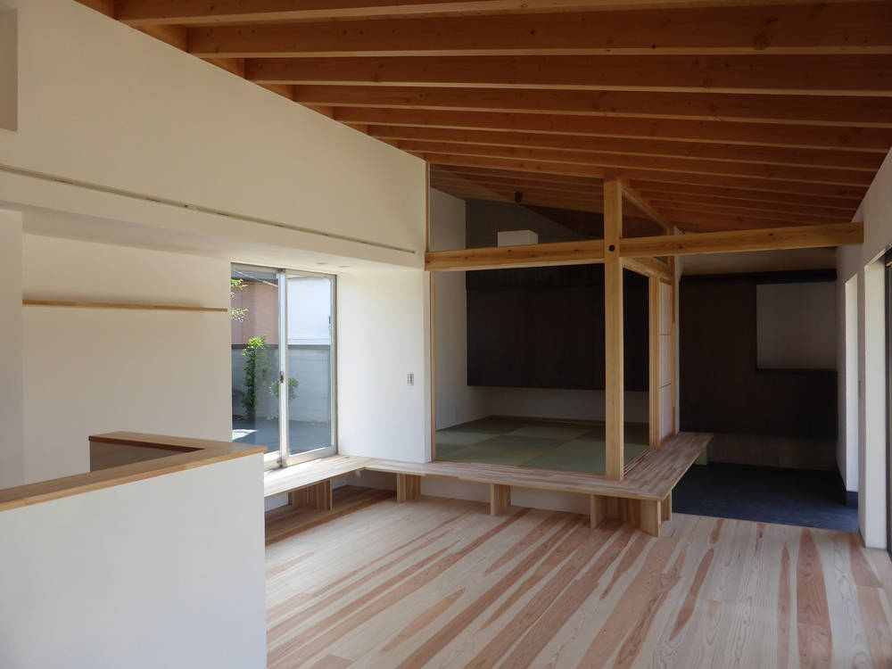 敷地に余裕があるため南北に庭を設け、様々な場所から庭を望むことができるよう配置しました。また、内部は屋根の化粧垂木を表しとし、シンプルで力強い空間としています。
