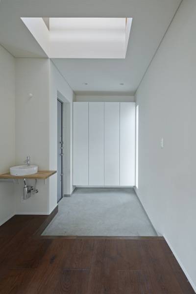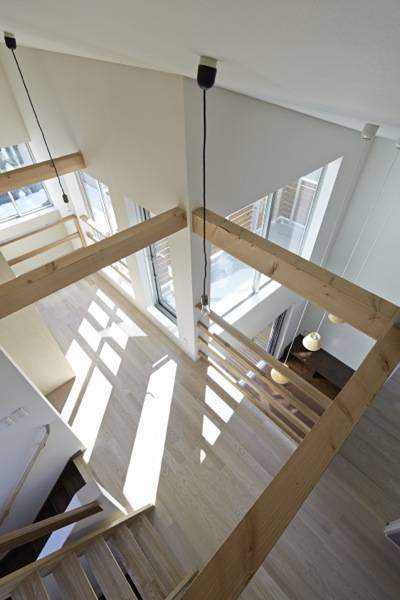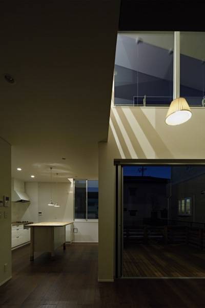 窓や戸のように垂直面にある開口部ではなく、水平面に吹抜けとして、開口部を計画することにより、互いの存在が確認できるような、住まい手の互いの距離が近く感じられる仕掛けとして、孔(吹抜)を位置づけ、計画しました。