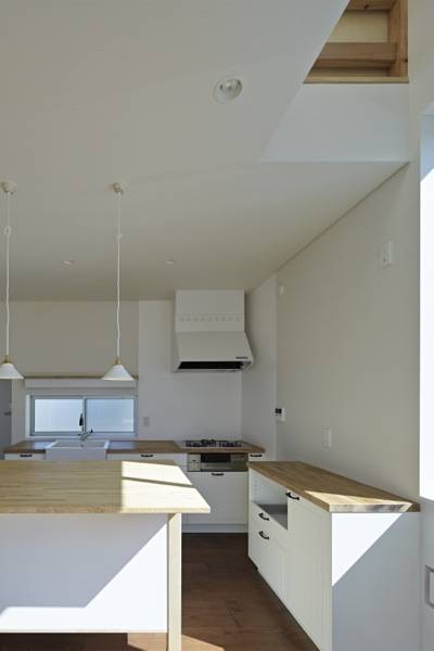 2階ホールの南北端には小さな孔(吹抜)が2つあり、1階の玄関、キッチンを2階ホールと繋いでいます。また、東西には2階のホールを挟んでリビング上部の大きな孔(吹抜)が1つ、階段の孔(吹抜)があり、2階は先述の2階ホールにあいた孔(吹抜)が重ねると十字形の構成となっています。