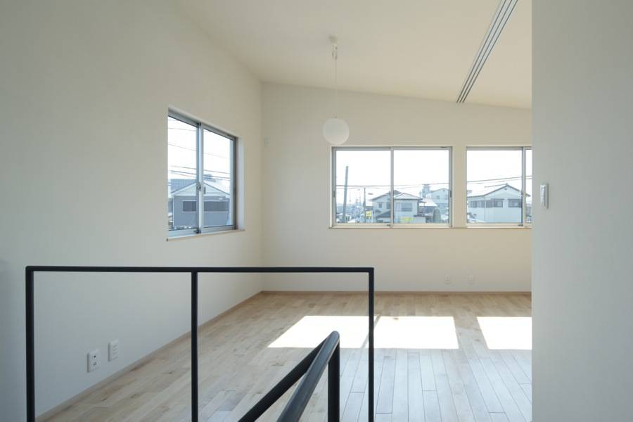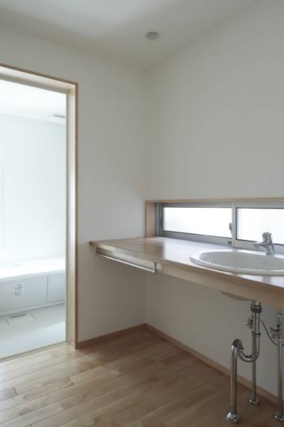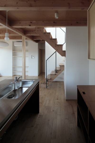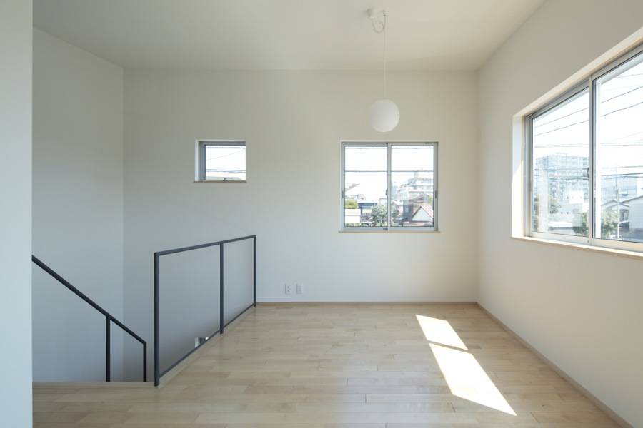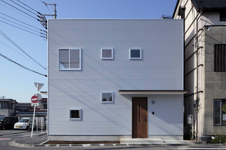 駅前から、ひとつ路地を入った住宅街の角地に建つ木造2階建の新築住宅。2面を道路に接道し、向かいに医院、反対側に集合住宅が建つ敷地にあります。四方からの視線をあびるこの敷地を考慮し、周囲からの視線を避けつつ、同時に内部の住まい手が周囲の視線を気にしない空間となるように計画しました。