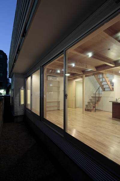 都市部のコートハウスでなく、郊外の開けた敷地の庭デッキでもなく、今回は隣地との境界を示す小さな塀と建物の間に小さな「庭」をしつらえ、その塀に向かって大きな開口部を設けました。これにより、外部への遮断と内部の開放感が可能になり、コンパクトで整形な平面形状をもつこの家でも、プライバシーと開放感を同時に得ることができました。