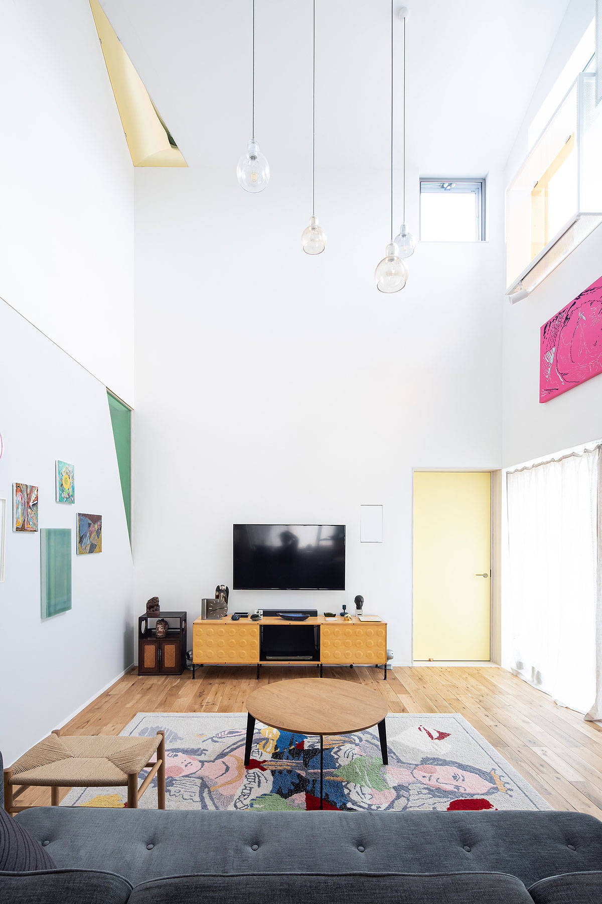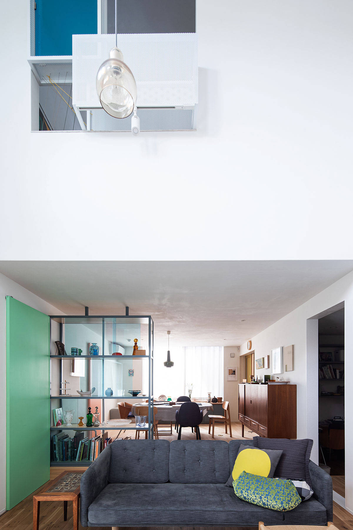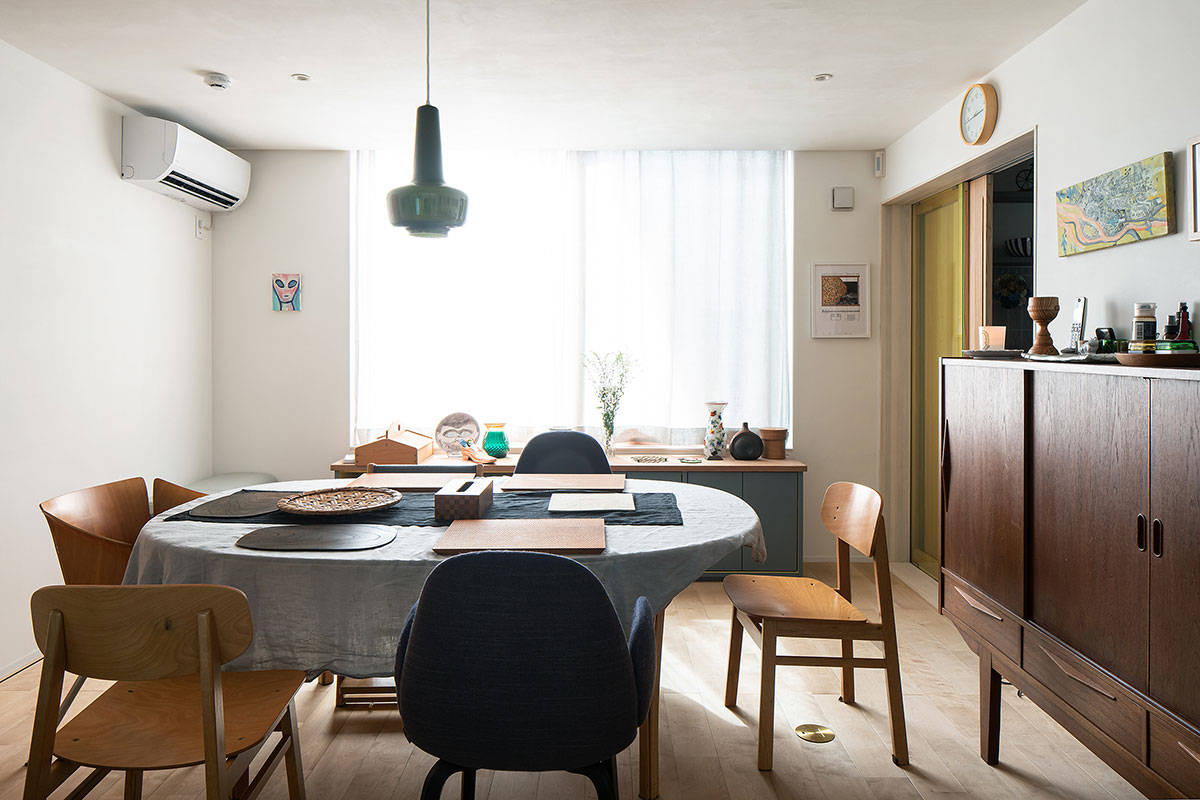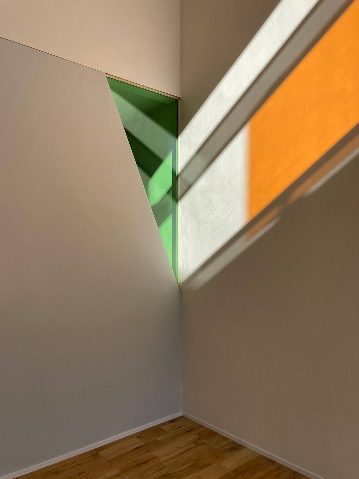 子世帯住居は、たくさんの家具や絵画や、食器やオブジェが置かれ、生活も変化に富む。なので、いくつもの色や、タイルなどの装飾的な要素を空間の各所にちりばめ、空間の豊かさが高まるように考えた。色や図柄は、ところどころで転用され各デザインに影響をおよぼす。タイルの絵柄が洗面所の鏡の輪郭を形作ったり、三角形の小窓がアクリルゴールドミラーの天井飾りに置き換わったり。それらは、家具や食器、絵画やいろいろな生活の側から持ち込まれるモノと混じり合い、一体となって空間の彩りを豊かにする。いろんなアイテムが空間に拡散することで、建物と家具やモノや服が、それら属性を超えて、色や図像として軽やかに漂うような状況をつくろうとした。