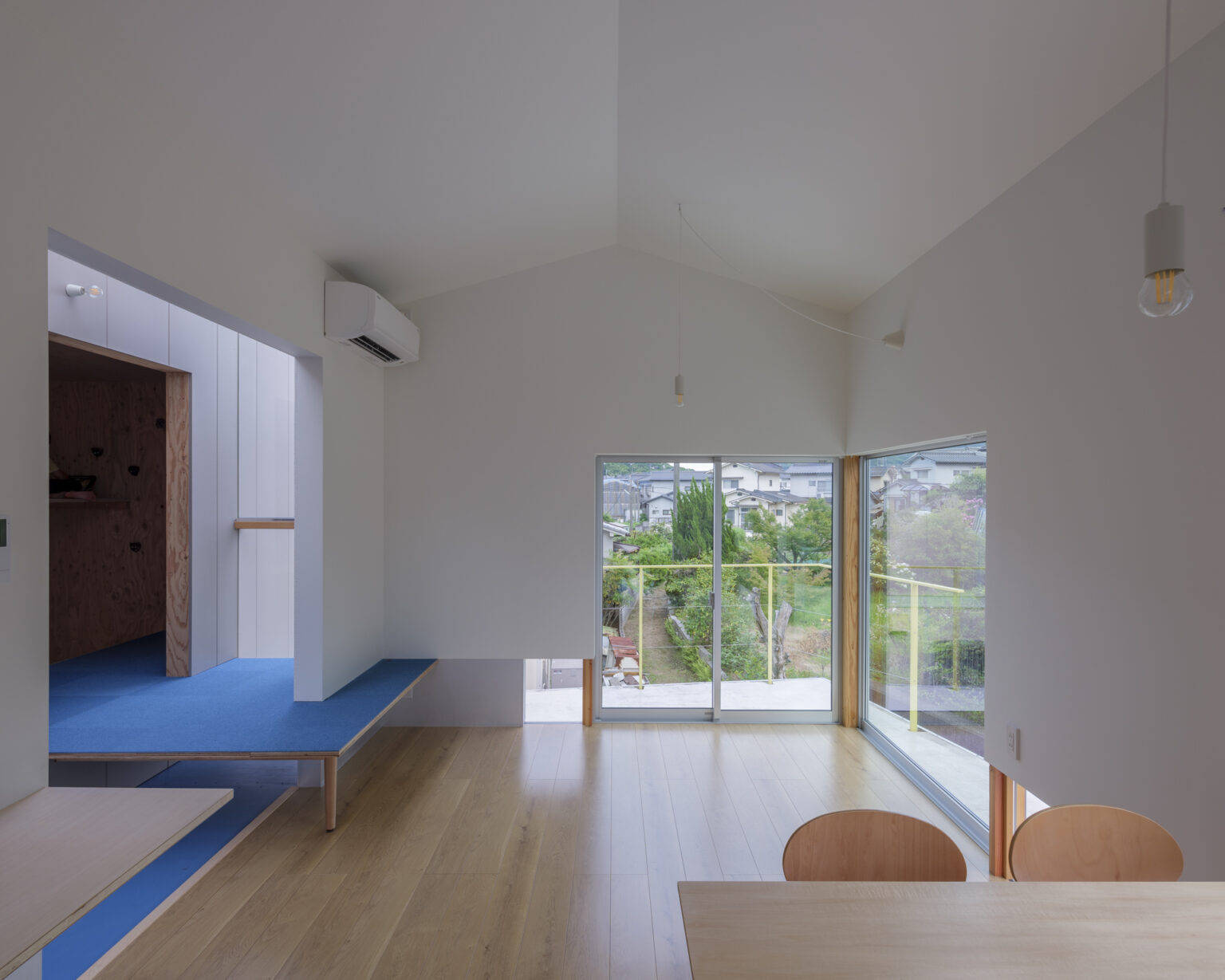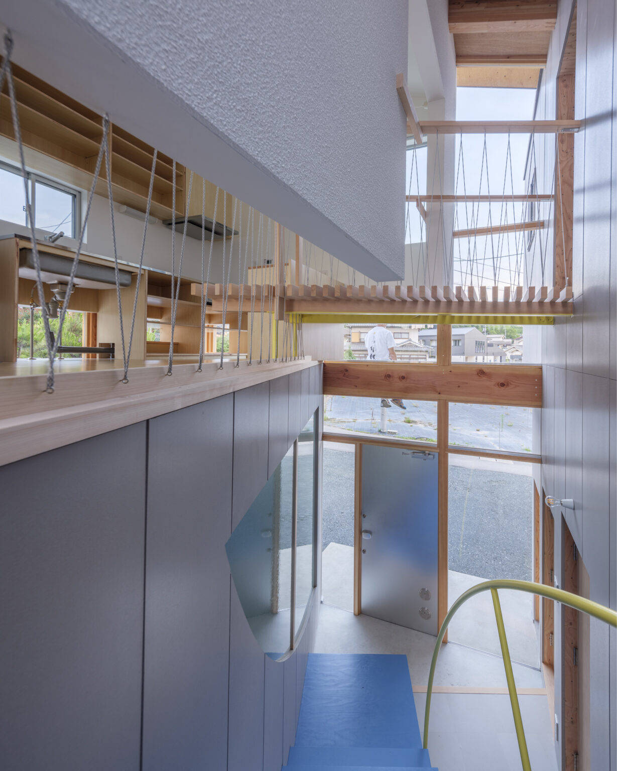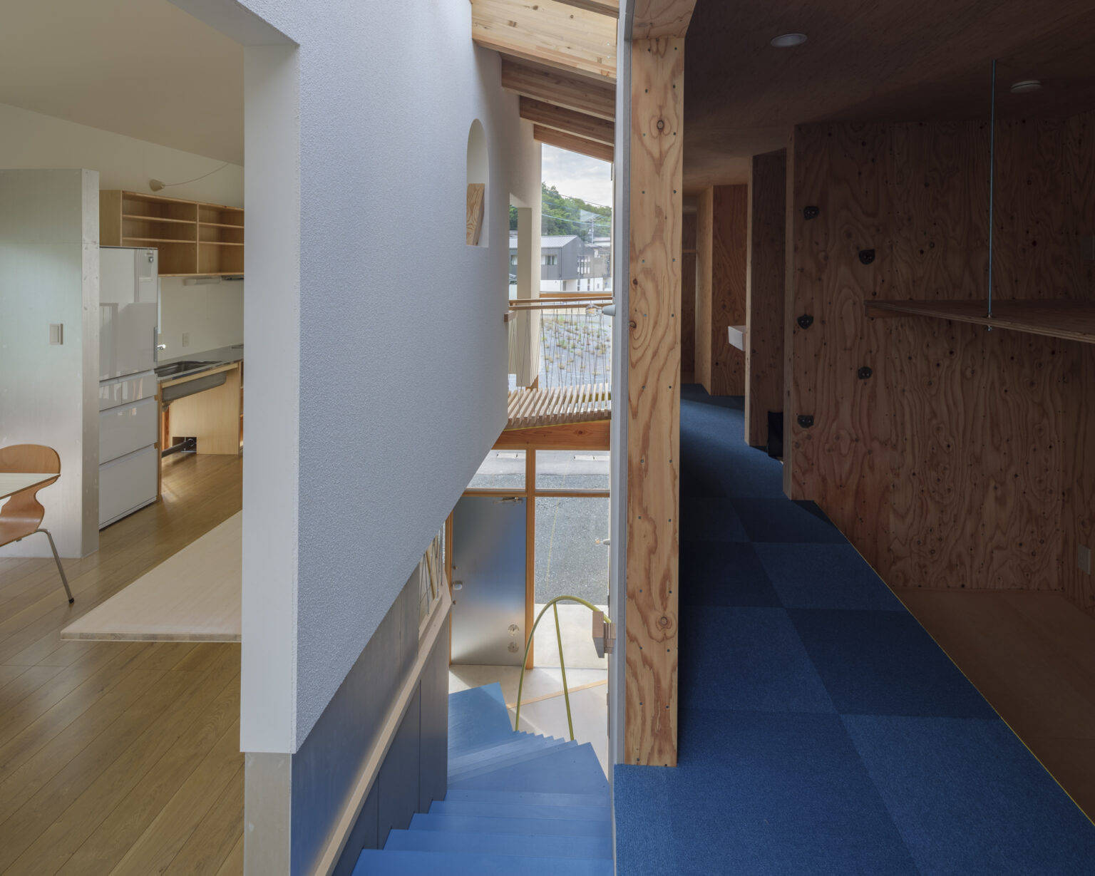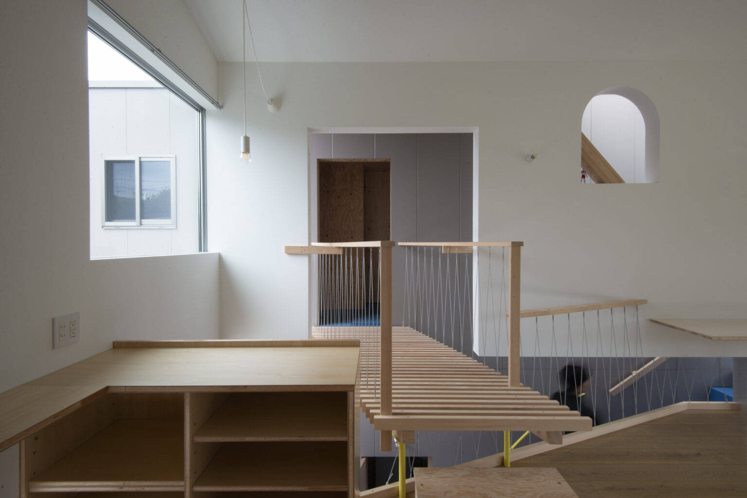 2階で大きく外側に伸ばしたテラス(庇)と少し浮かせた壁は、LDKを外の風景と連続させ、水平方向へ実面積以上の広がりを感じさせる。壁と一緒に浮いたブリッジと浮床は、空まで吹き抜ける階段室を飛び越える回遊性と高さ方向の多様な空間体験をつくり出した。浮床の下は大容量の床下収納となっており、面積を抑えつつも十分な収納量を実現した。