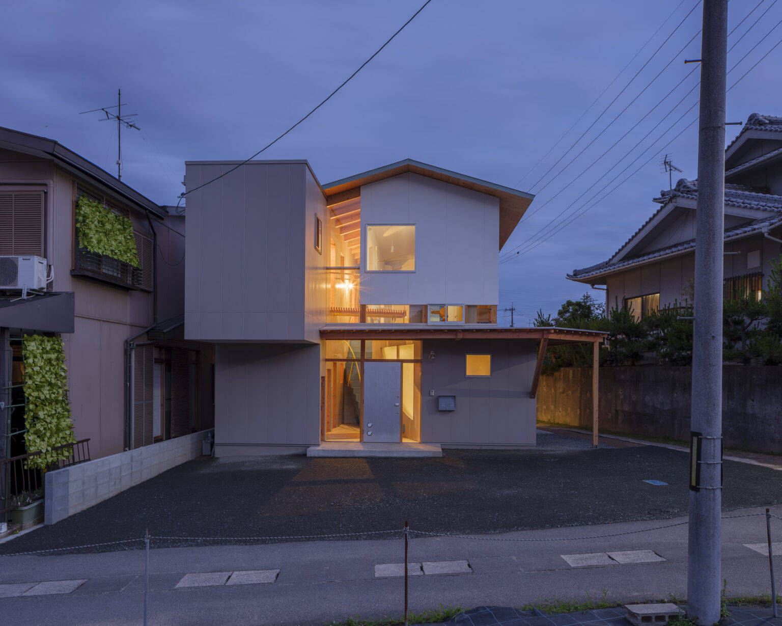 コロナ禍に端を発するウッドショック真っ只中に計画をした2世帯住宅である。フィジカルなコミュニケーションが避けられる中、新たな土地に移り住む家族が周囲との関係を前向きに育めること、高騰する材料費を吸収すべくコンパクトでありながらも豊かな空間の広がり感じられる家を目指した。