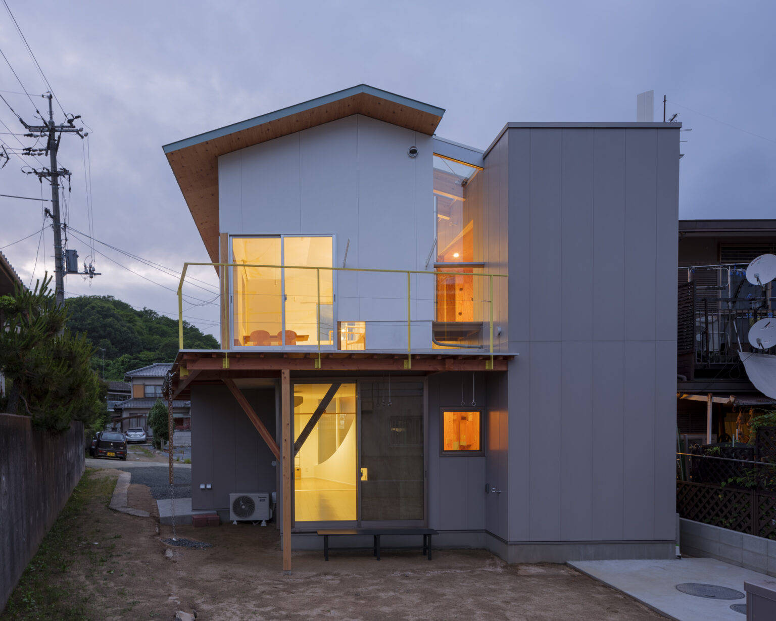 雁行させた1階外壁は里道に対して交流の場を生み、大きな庇の下では敷地境界を越えてこども達が走り回り、庇の上ではテラスに足を投げ出して借景を楽しむ。この家の建ち方は、本土から島に移り住む家族が地域に能動的にかかわっていくという意思表明である。